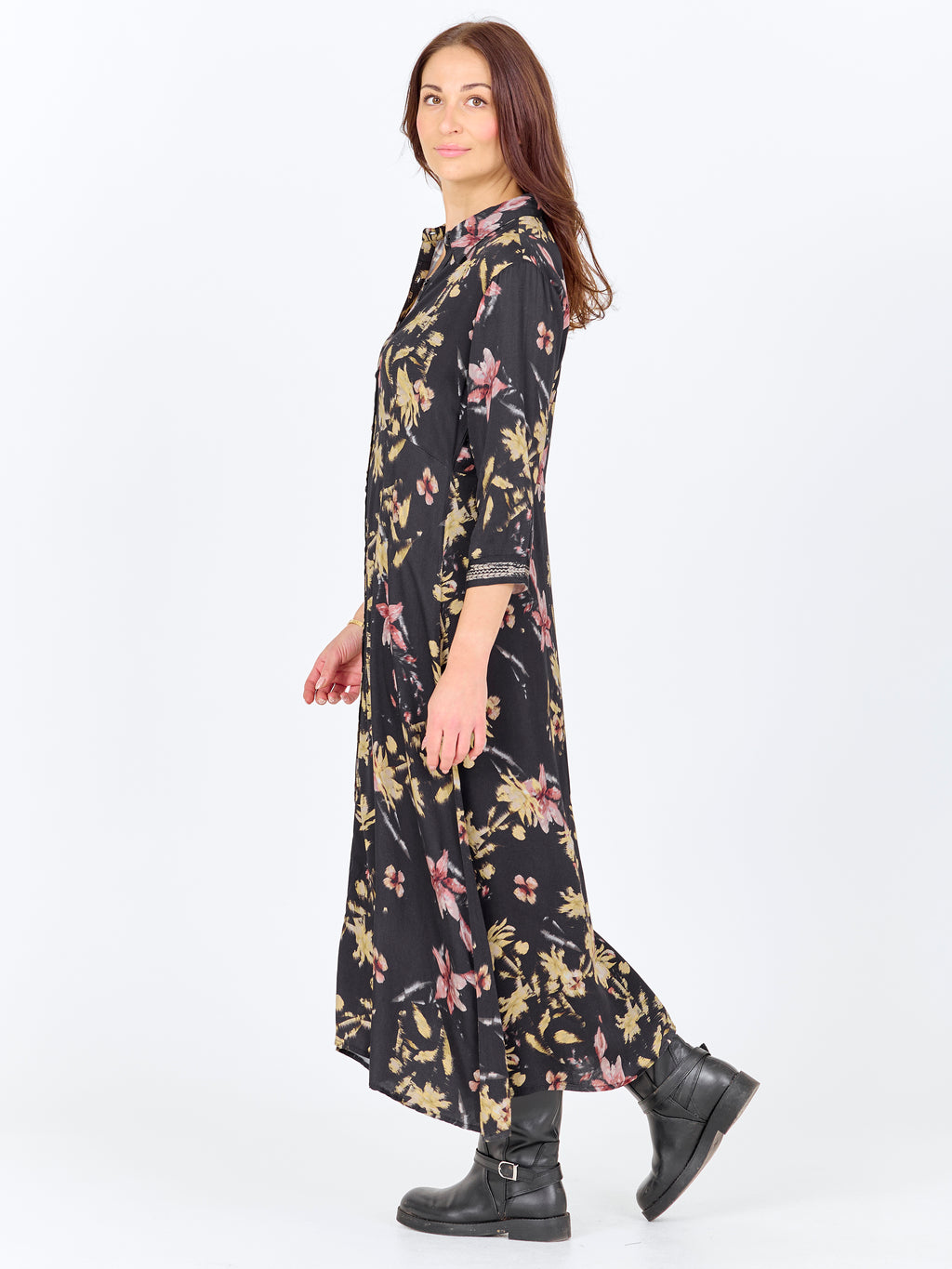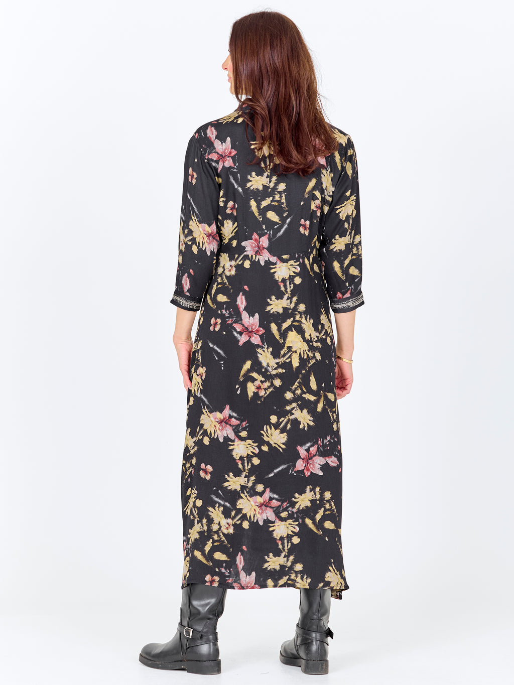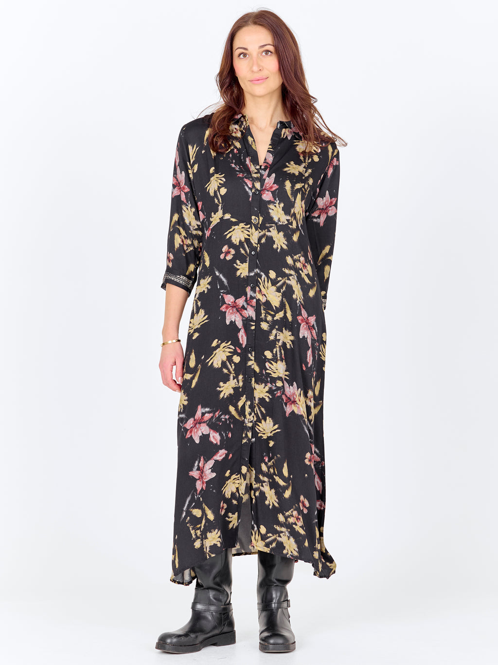 Denne kjole har et enkelt snit med gennemgående knaplukning og et print, der giver kant. Den falder let langs kroppen og har 3/4-lange ærmer med en lille slids i siden, som giver mere bevægelse. En kjole, der er nem at bruge både til hverdag og mere formelle anledninger, alene eller med et lag over.