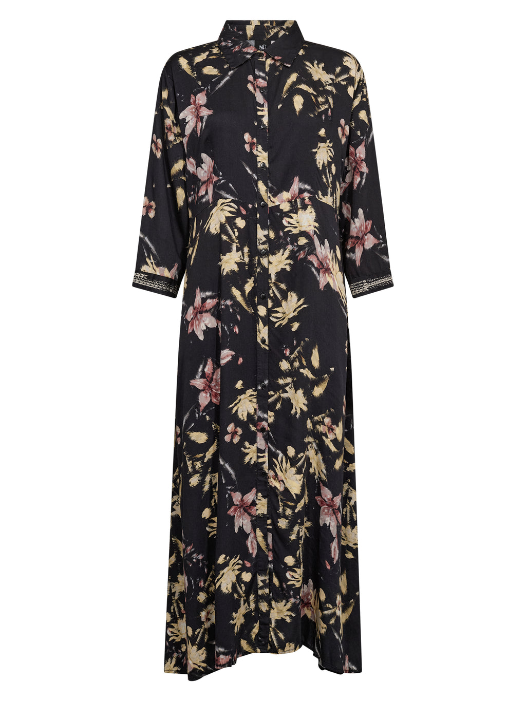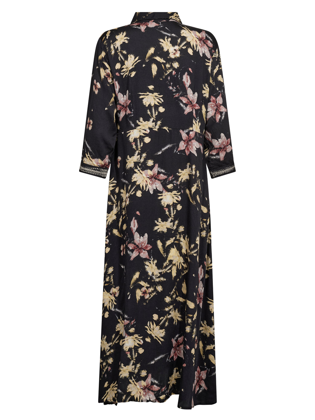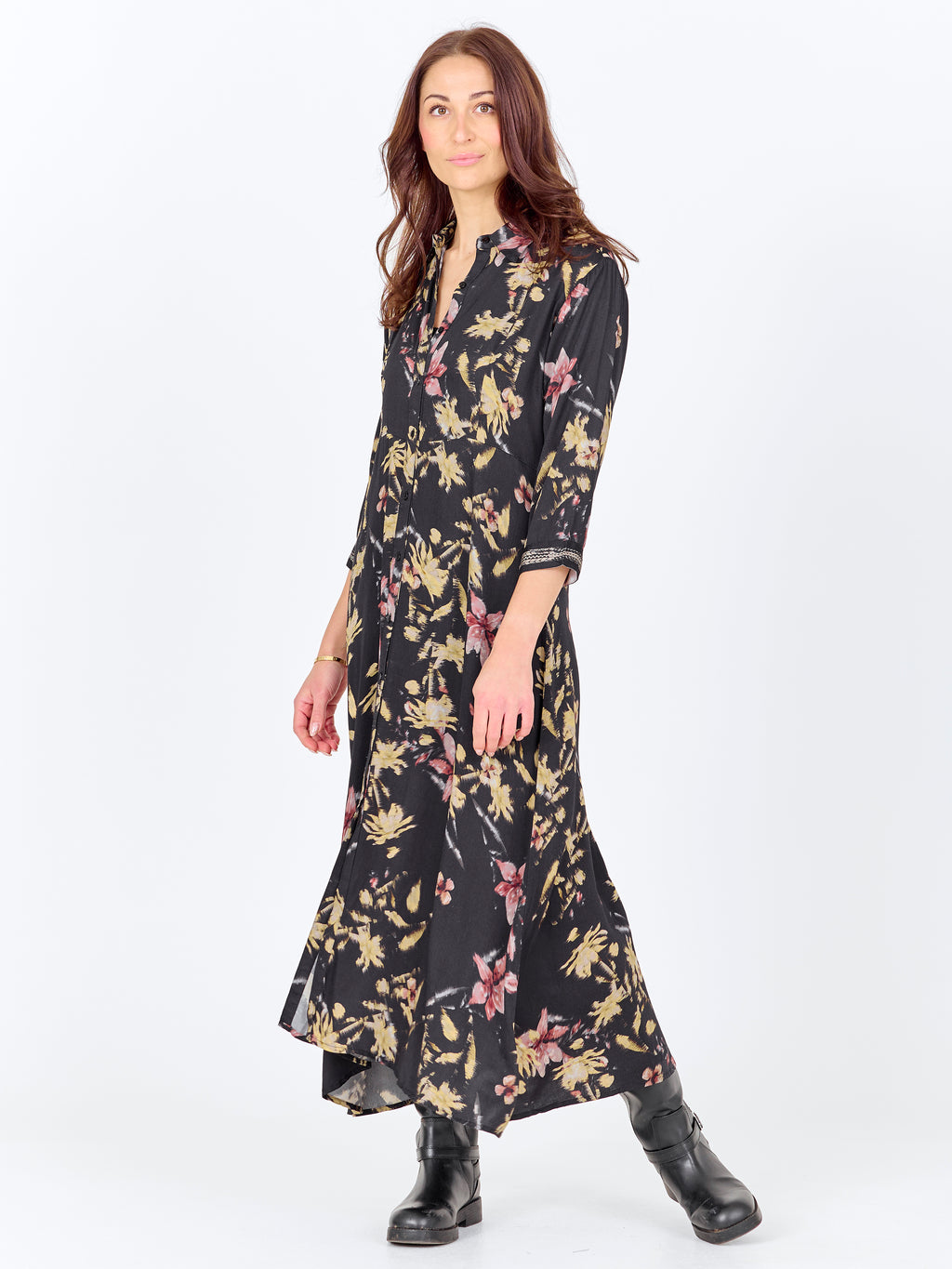 Denne kjole har et enkelt snit med gennemgående knaplukning og et print, der giver kant. Den falder let langs kroppen og har 3/4-lange ærmer med en lille slids i siden, som giver mere bevægelse. En kjole, der er nem at bruge både til hverdag og mere formelle anledninger, alene eller med et lag over.