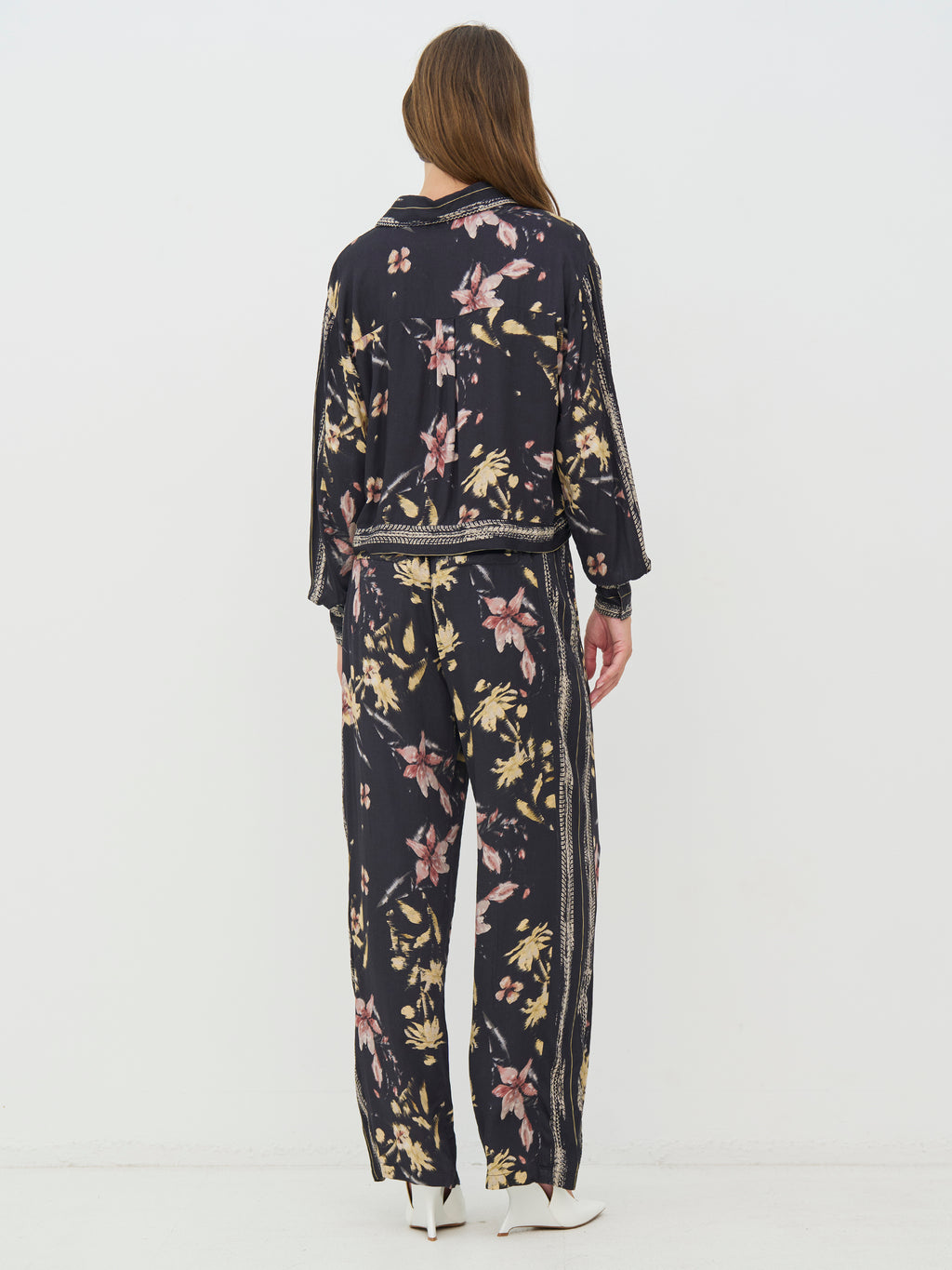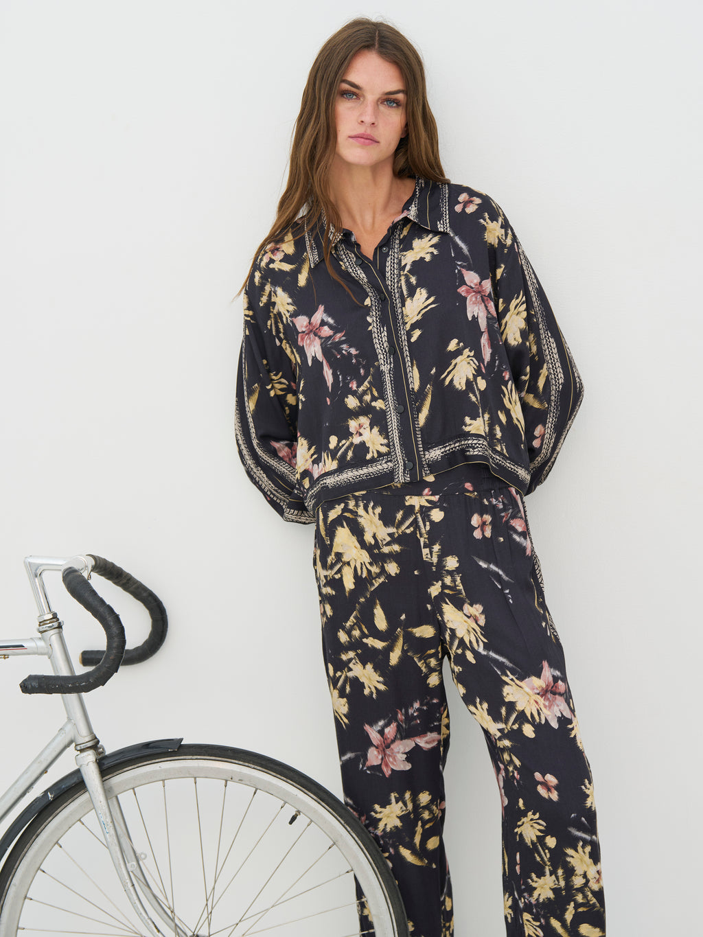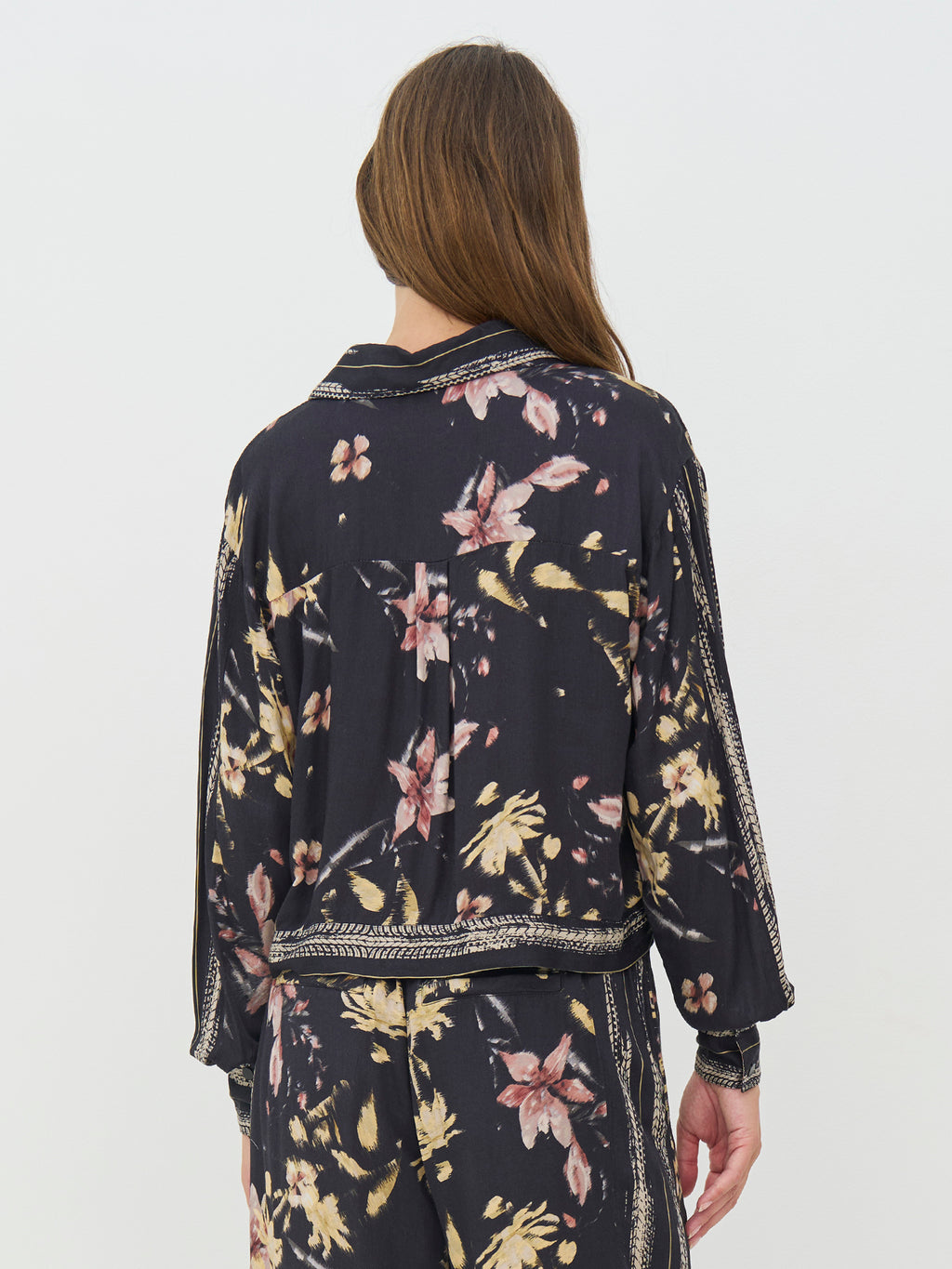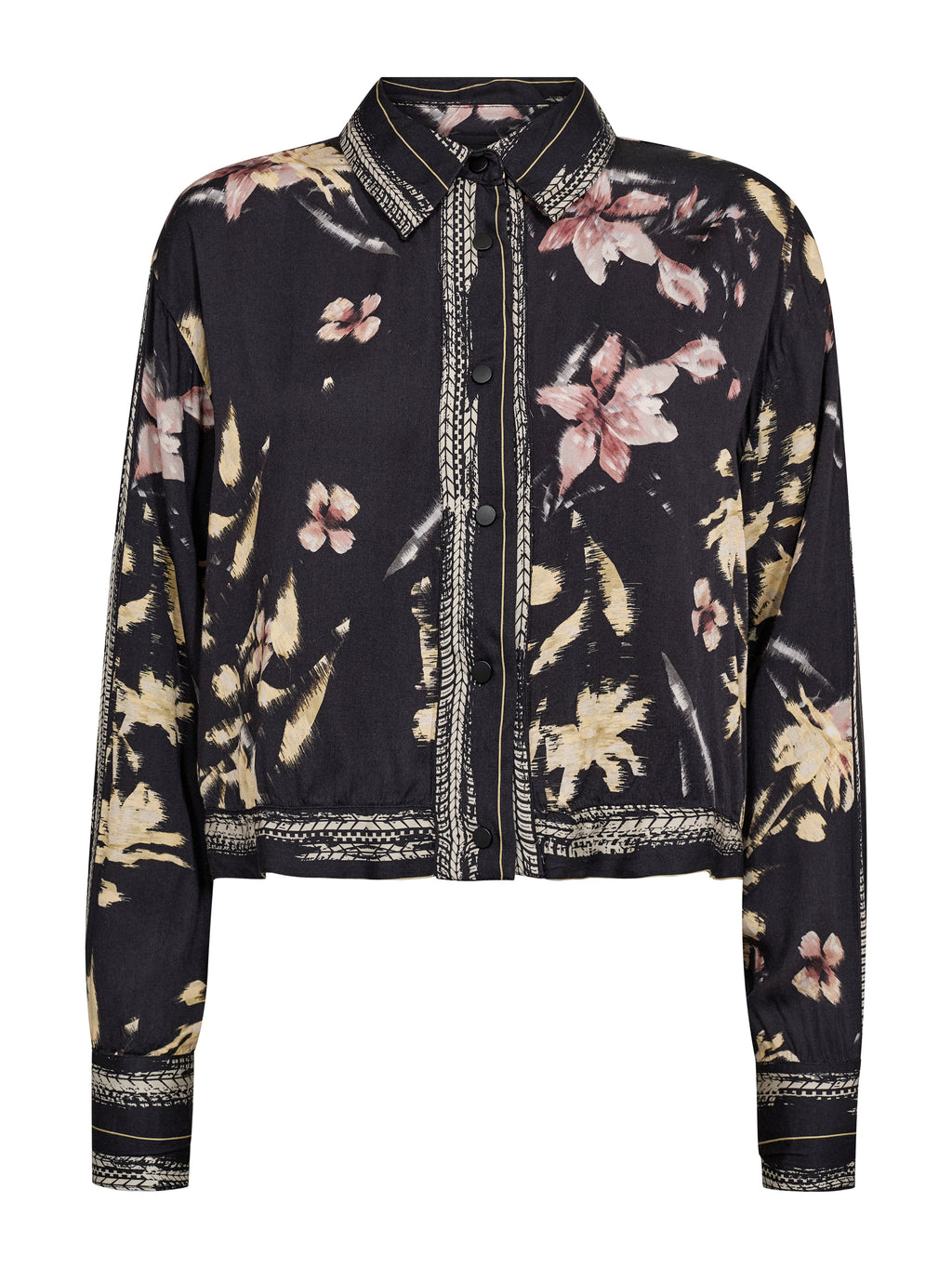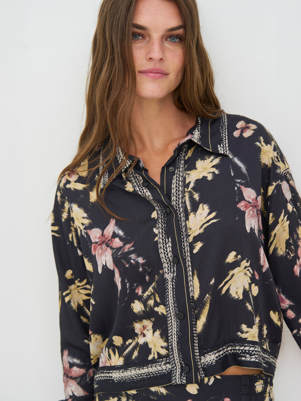 Denne skjorte har et afslappet og gennemført udtryk med gennemgående knapper og klassisk krave. Printet giver karakter, mens de dekorative bånd langs krave, front og manchetter tilfører en fin detalje. Pasformen er let og behagelig med god vidde i ærmerne. Brug den alene, lukket eller åben, eller style den sammen med de matchende bukser for et samlet look.
