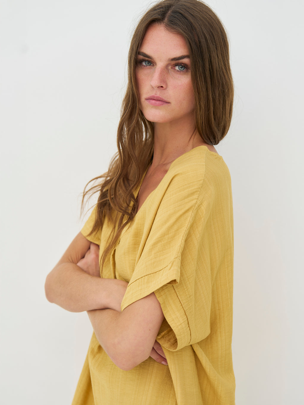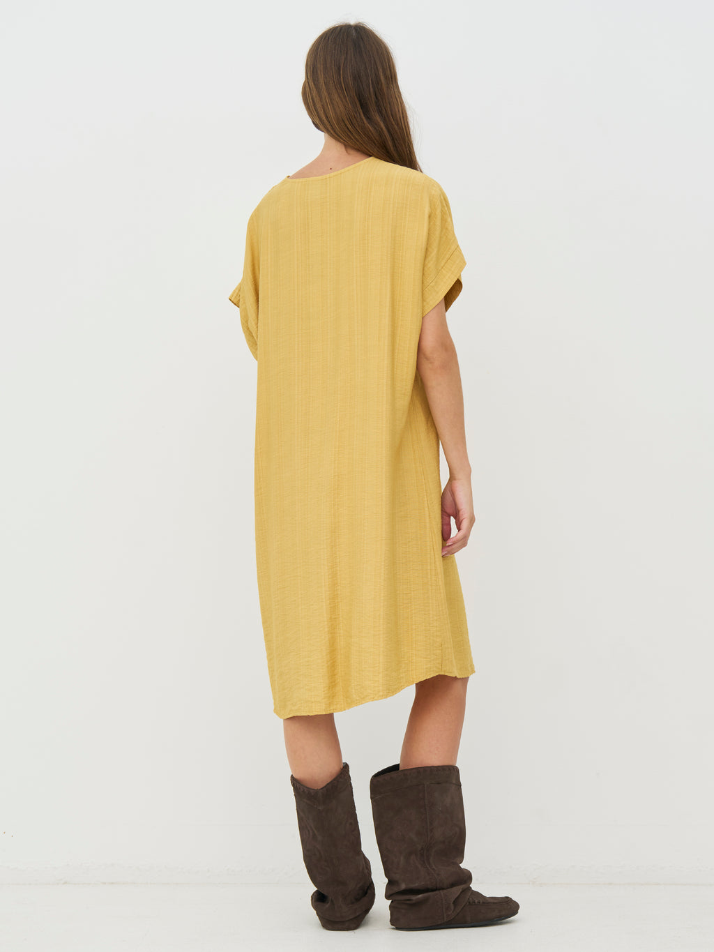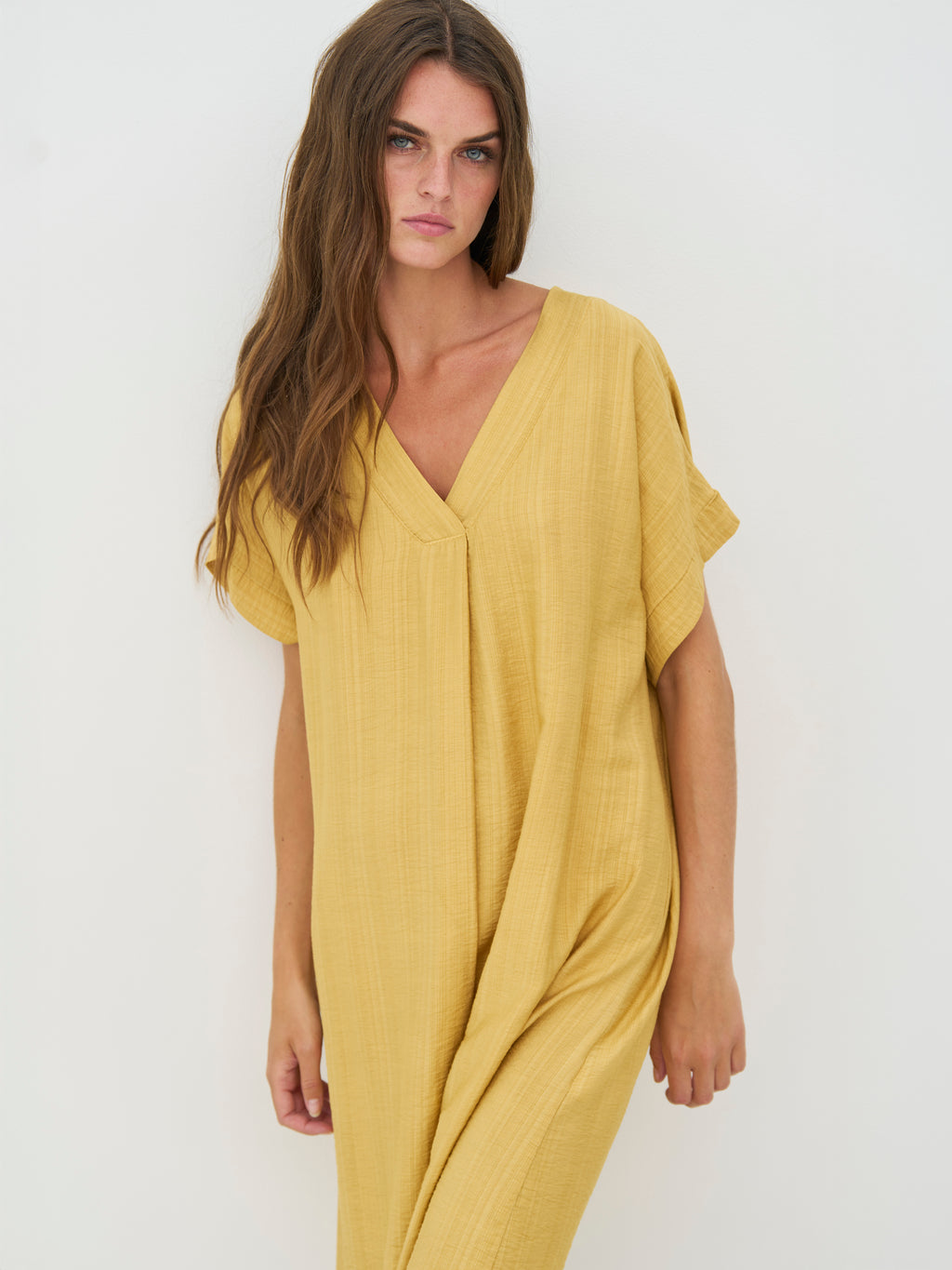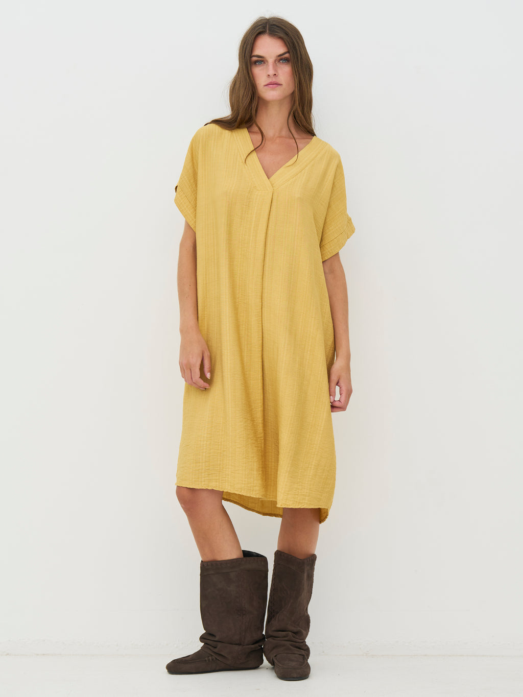 Denne tunika har et afslappet og enkel udtryk med en lige pasform, der falder blødt langs kroppen. Den elegante V-hals giver et åbent og let look, mens de korte ærmer holder silhuetten enkel og anvendelig. Længden gør den behagelig at have på hele dagen og nem at style, både alene som kjole eller med flade sko og accessories for et mere afslappet udtryk.