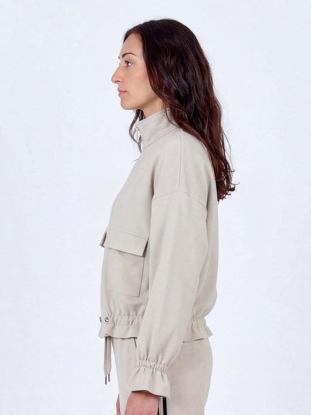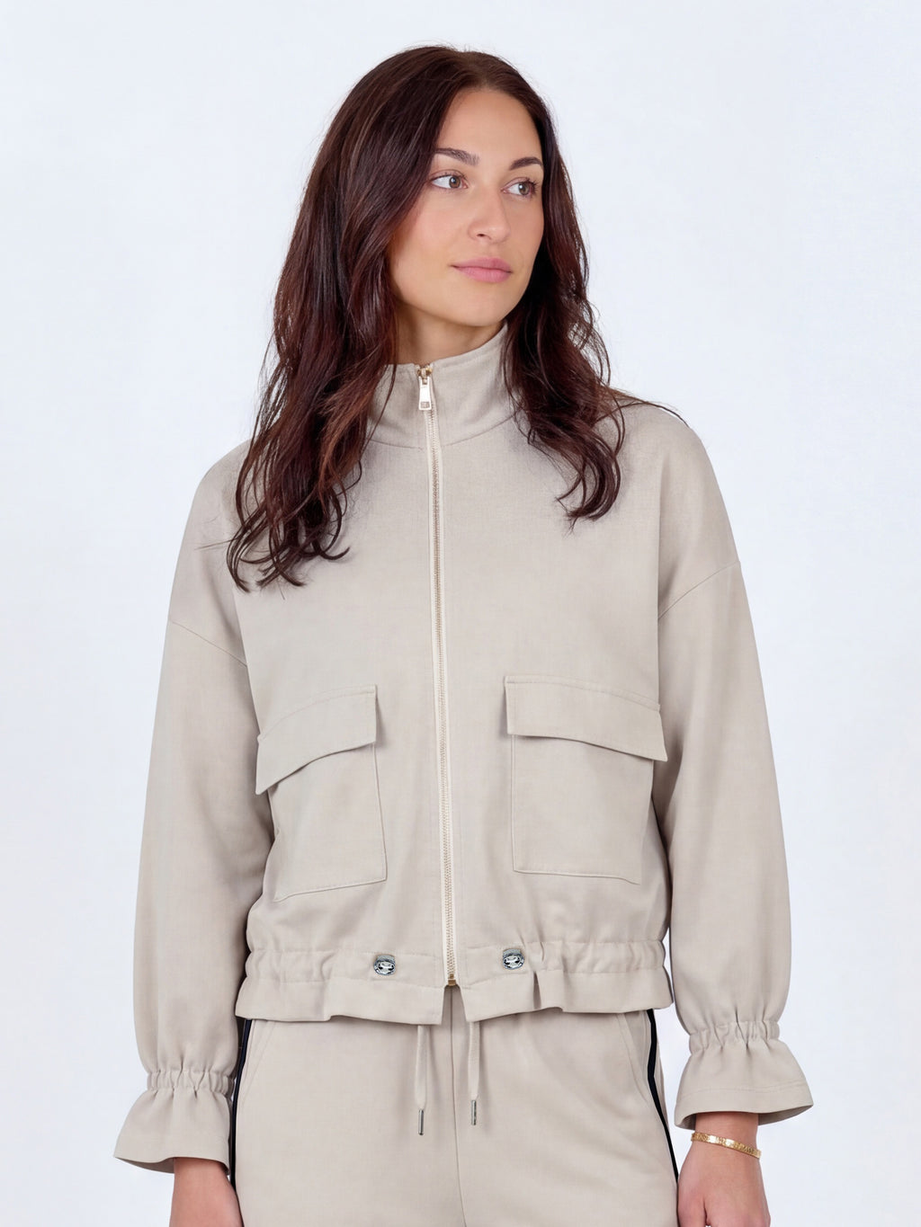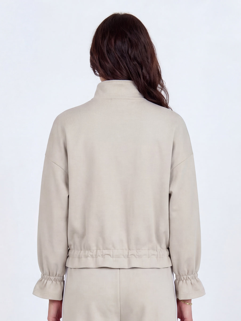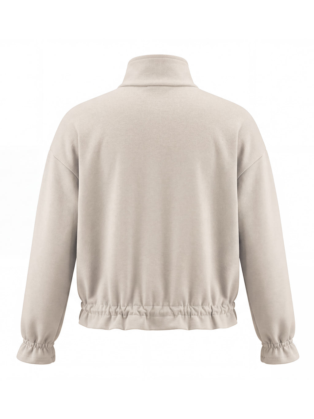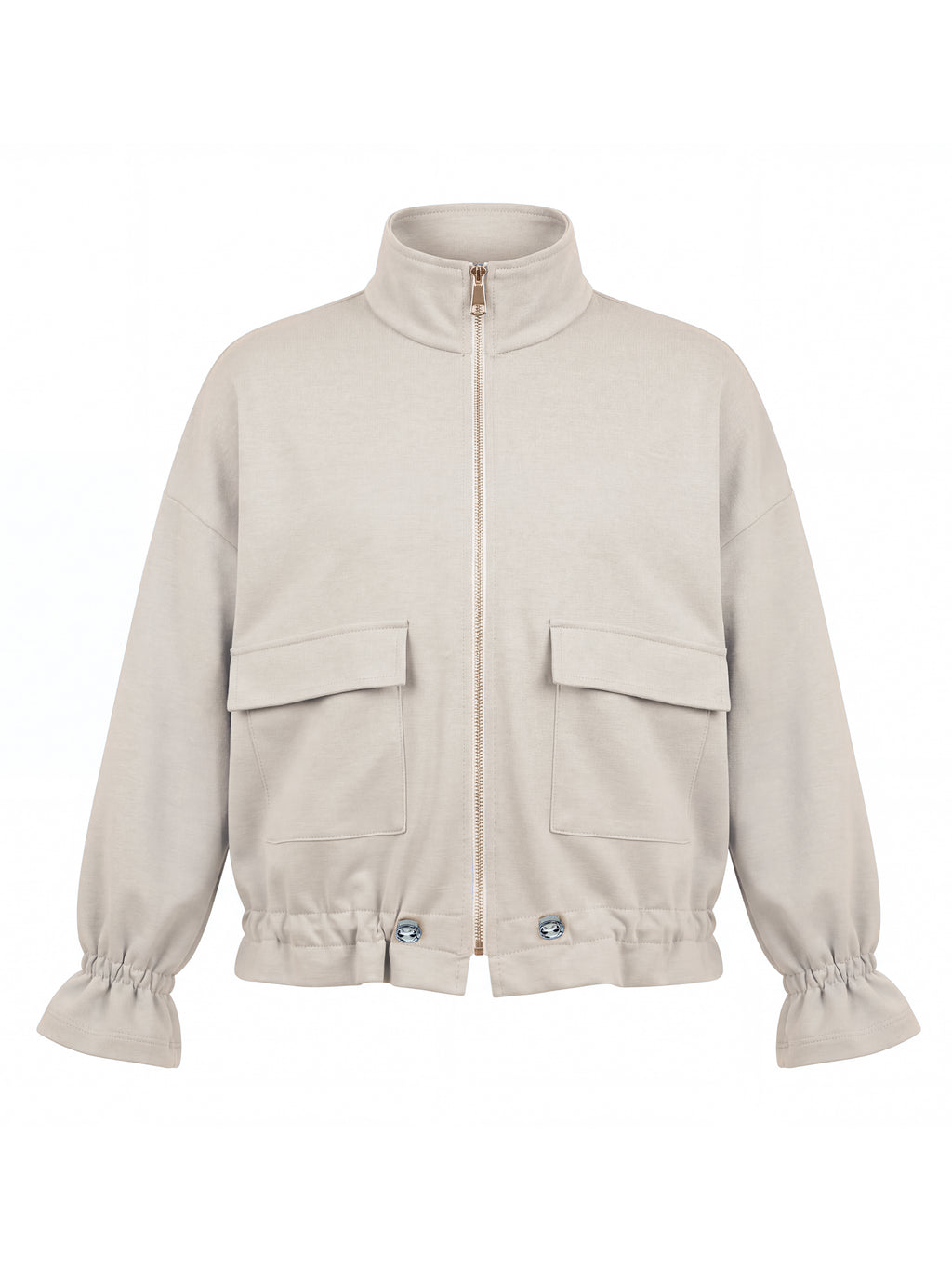 Denne cardigan har et afslappet og funktionelt udtryk med fine detaljer. Den er designet med høj krave og gennemgående lynlås, som giver mulighed for at variere looket. De store frontlommer tilfører et praktisk element, mens elastikken i bunden og ved ærmerne skaber en let, samlet silhuet. Bagsiden er holdt enkel og understøtter det rene design.