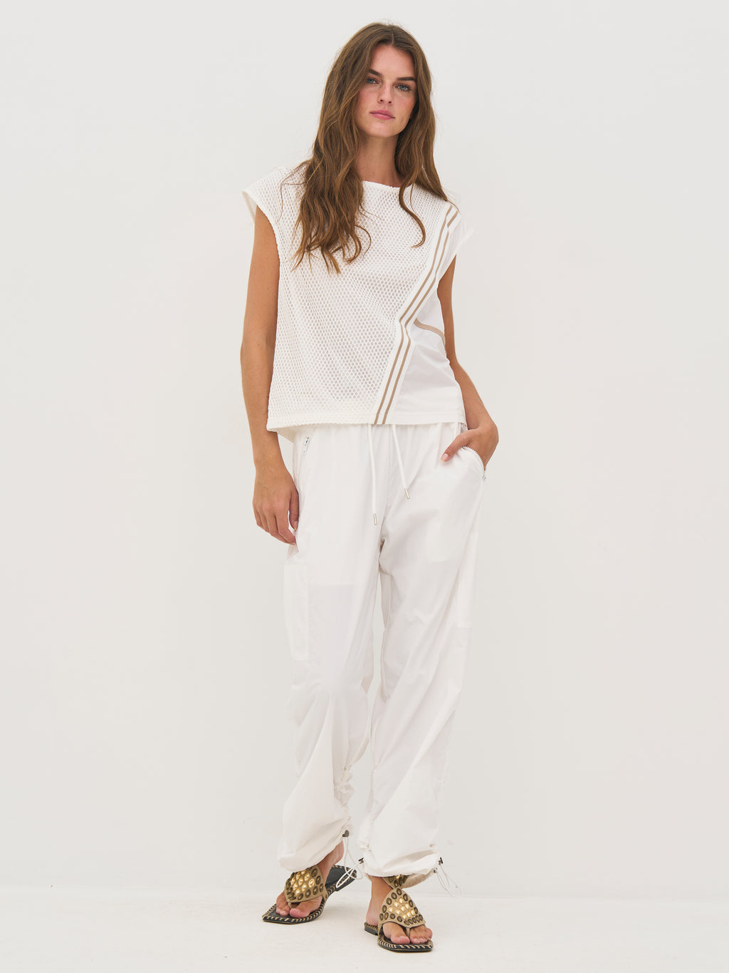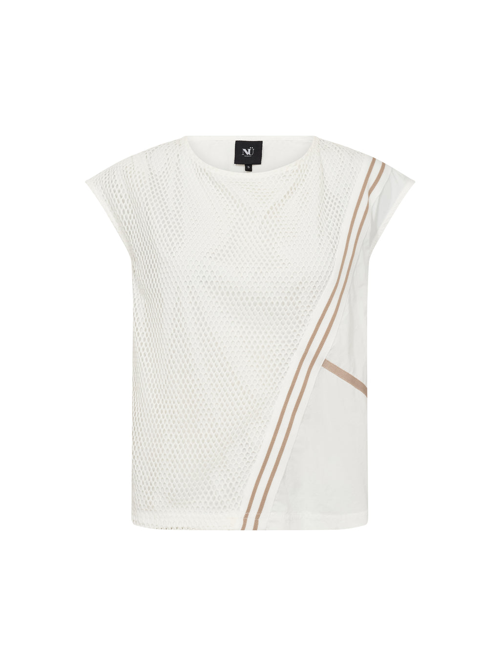 Denne top har et let og luftigt udtryk med en struktureret kvalitet, der giver et sporty præg. Den er designet med indvendig foring, som sikrer et dækket look, samtidig med at det åbne udtryk bevares. De diagonale striber tilfører en dynamisk detalje, mens den afslappede pasform giver en ubesværet silhuet. Bagtil fortsætter designet med samme lag-på-lag effekt.