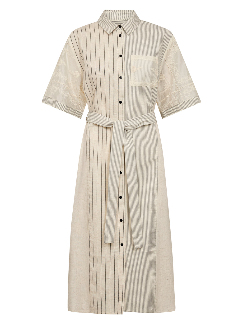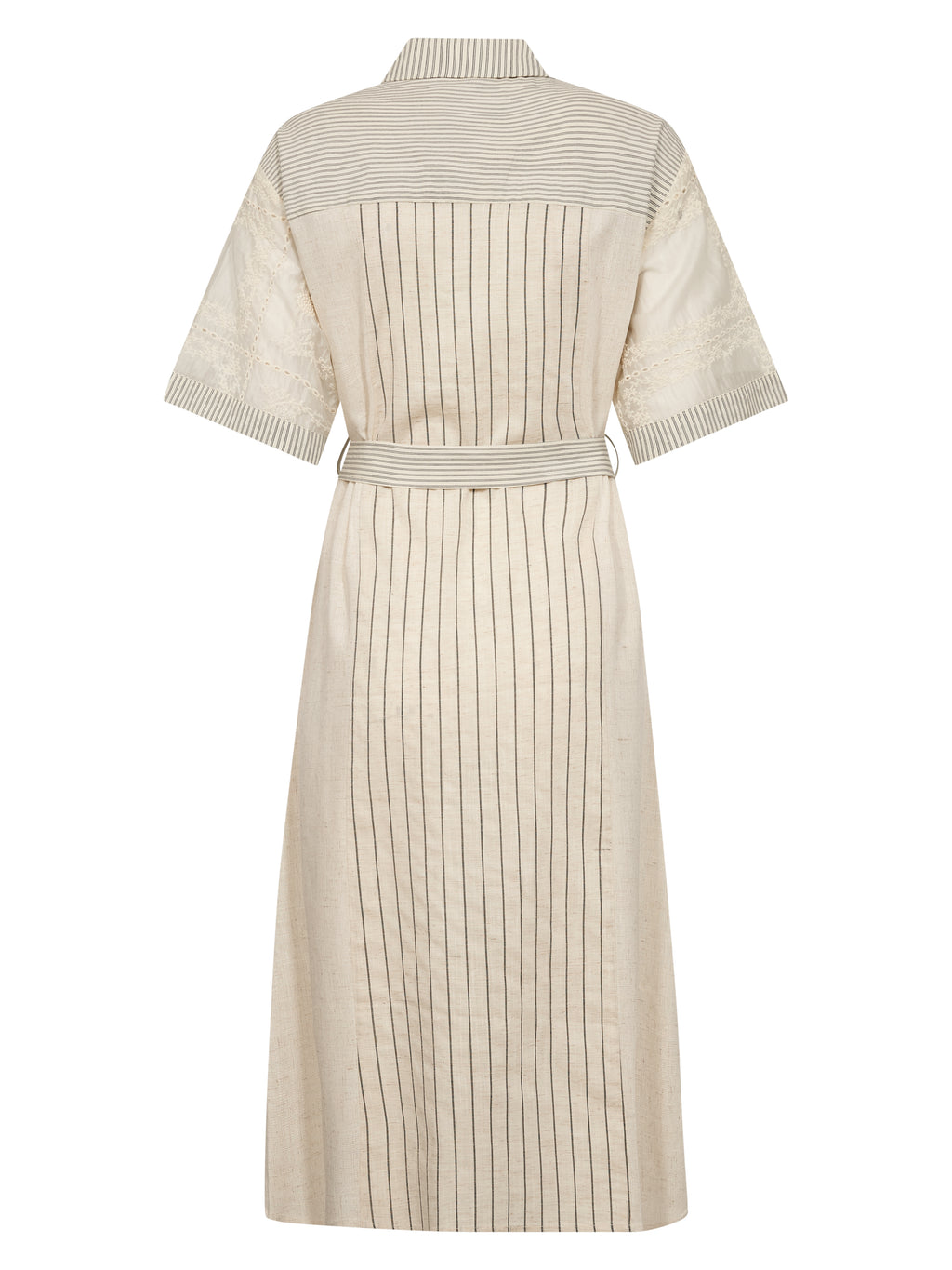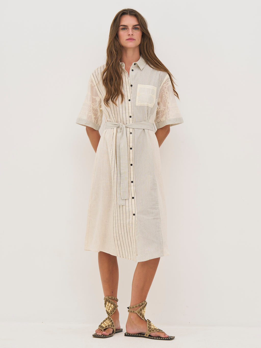 Det unikke miks af materialer – med broderede ærmer og stribede paneler i en let hørblanding – tilfører struktur og et eksklusivt udtryk. Den midi-lange længde giver en god balance mellem komfort og elegance.
