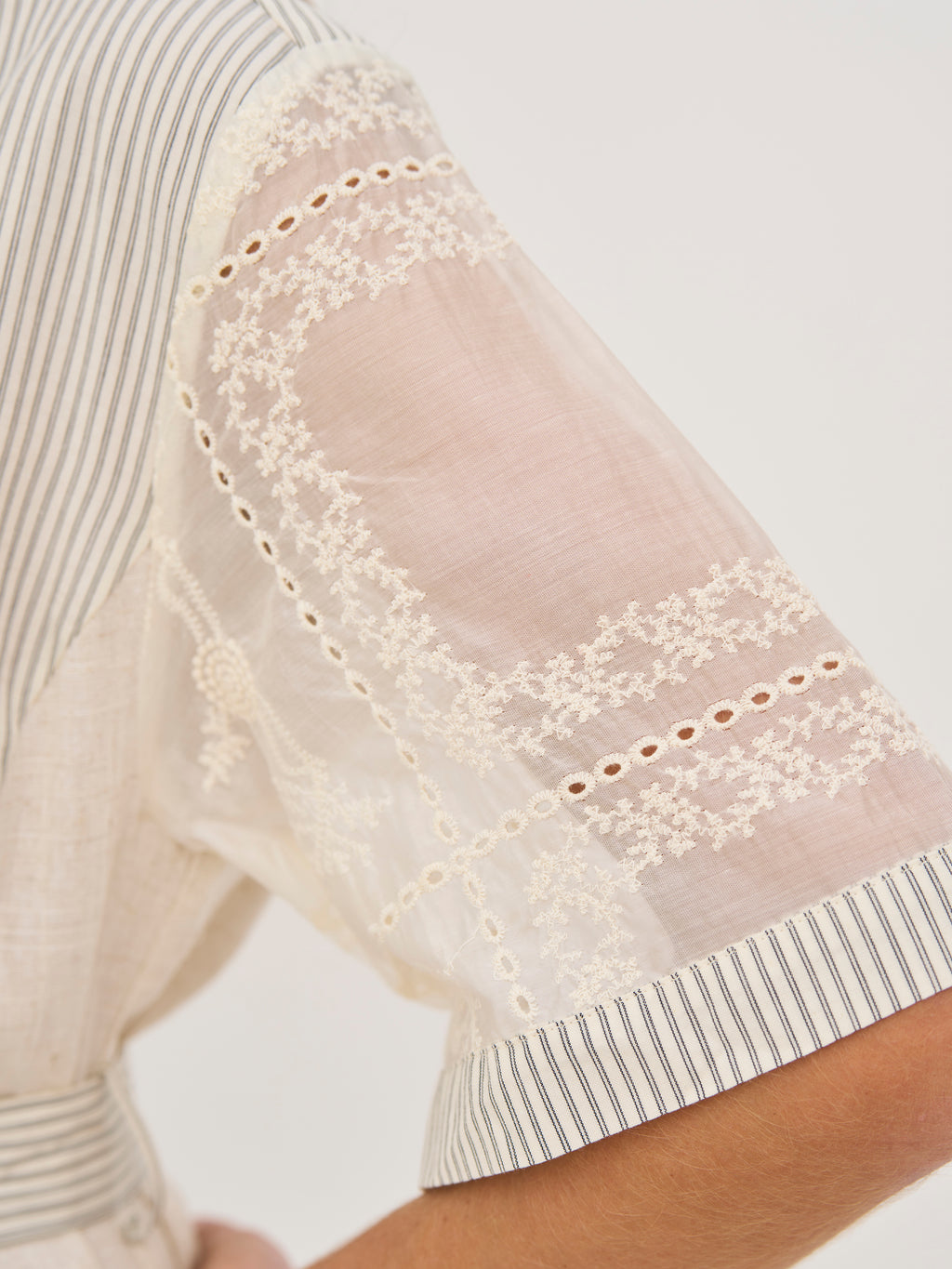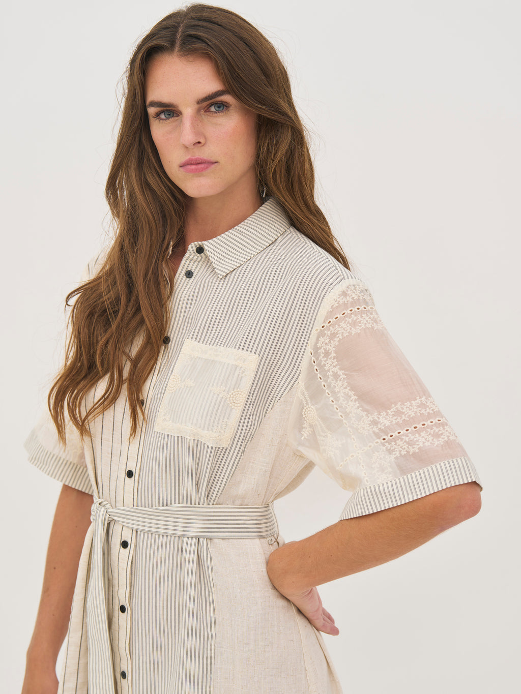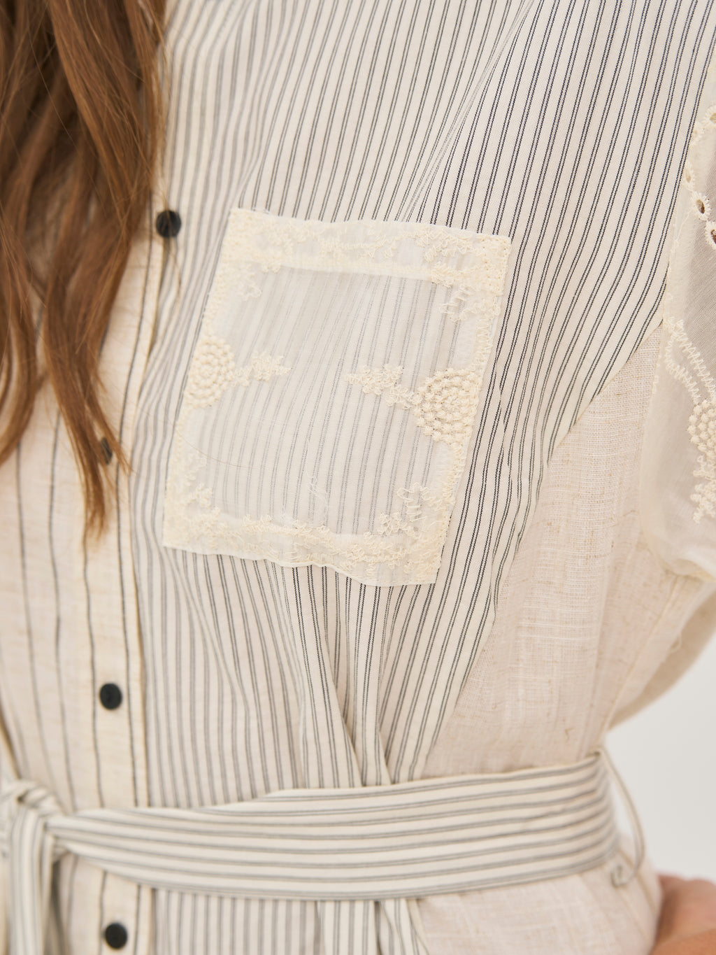 Det unikke miks af materialer – med broderede ærmer og stribede paneler i en let hørblanding – tilfører struktur og et eksklusivt udtryk. Den midi-lange længde giver en god balance mellem komfort og elegance.