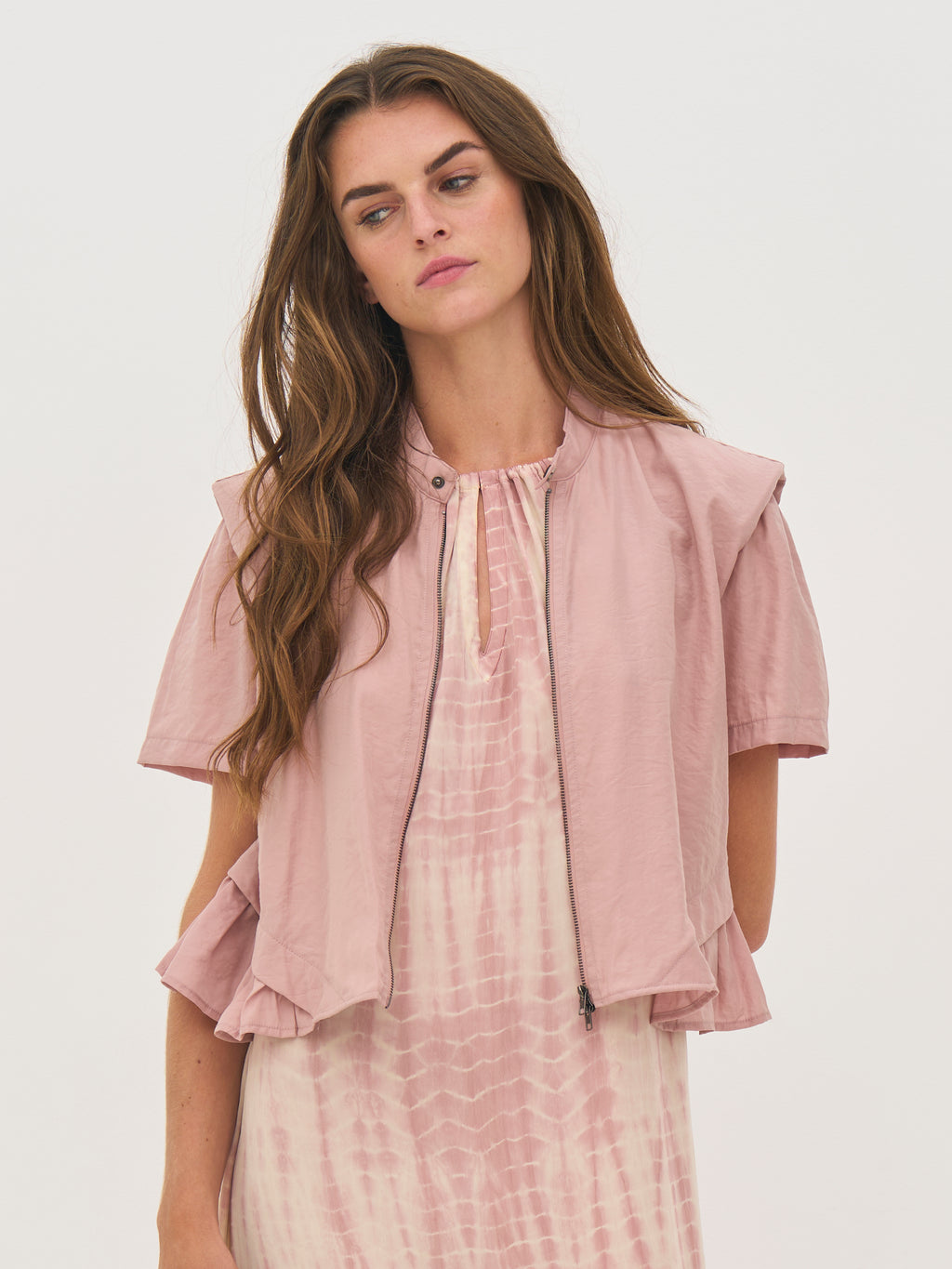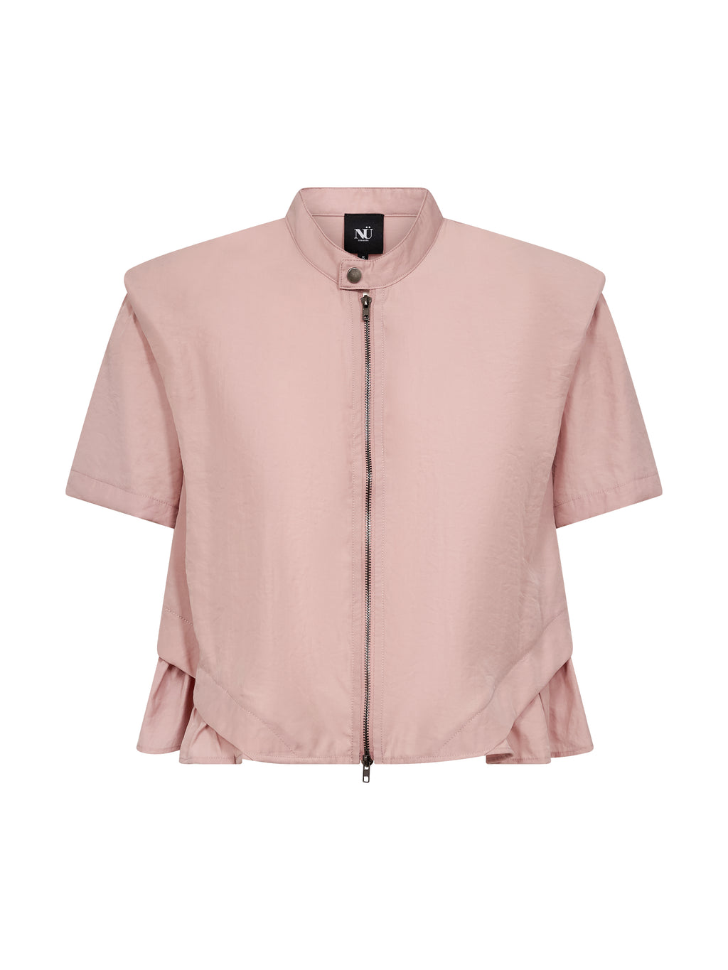 Denne jakke er fremstillet i en blød viskoseblanding med en let glans, som giver et pænt og moderne udtryk. Den har gennemgående lynlås foran samt en trykknap ved halsen, der fuldender det enkle design. De korte, strukturerede ærmer skaber en markant silhuet, mens flæsedetaljen langs kanten tilfører et feminint og levende element.