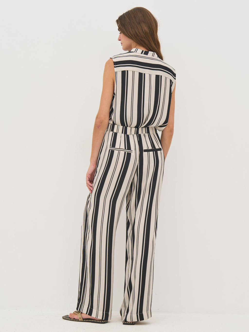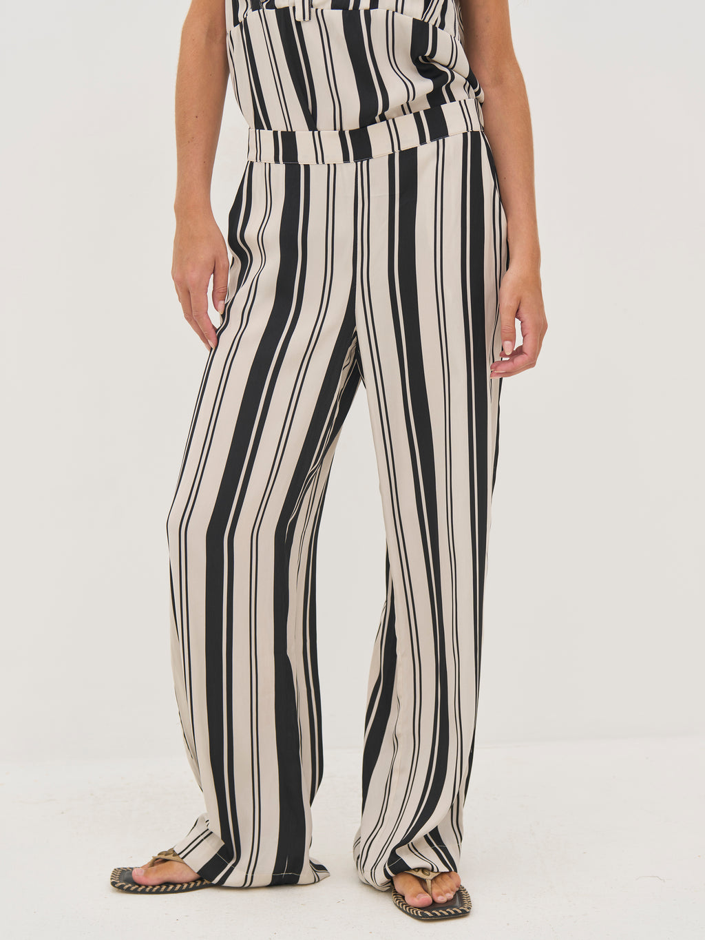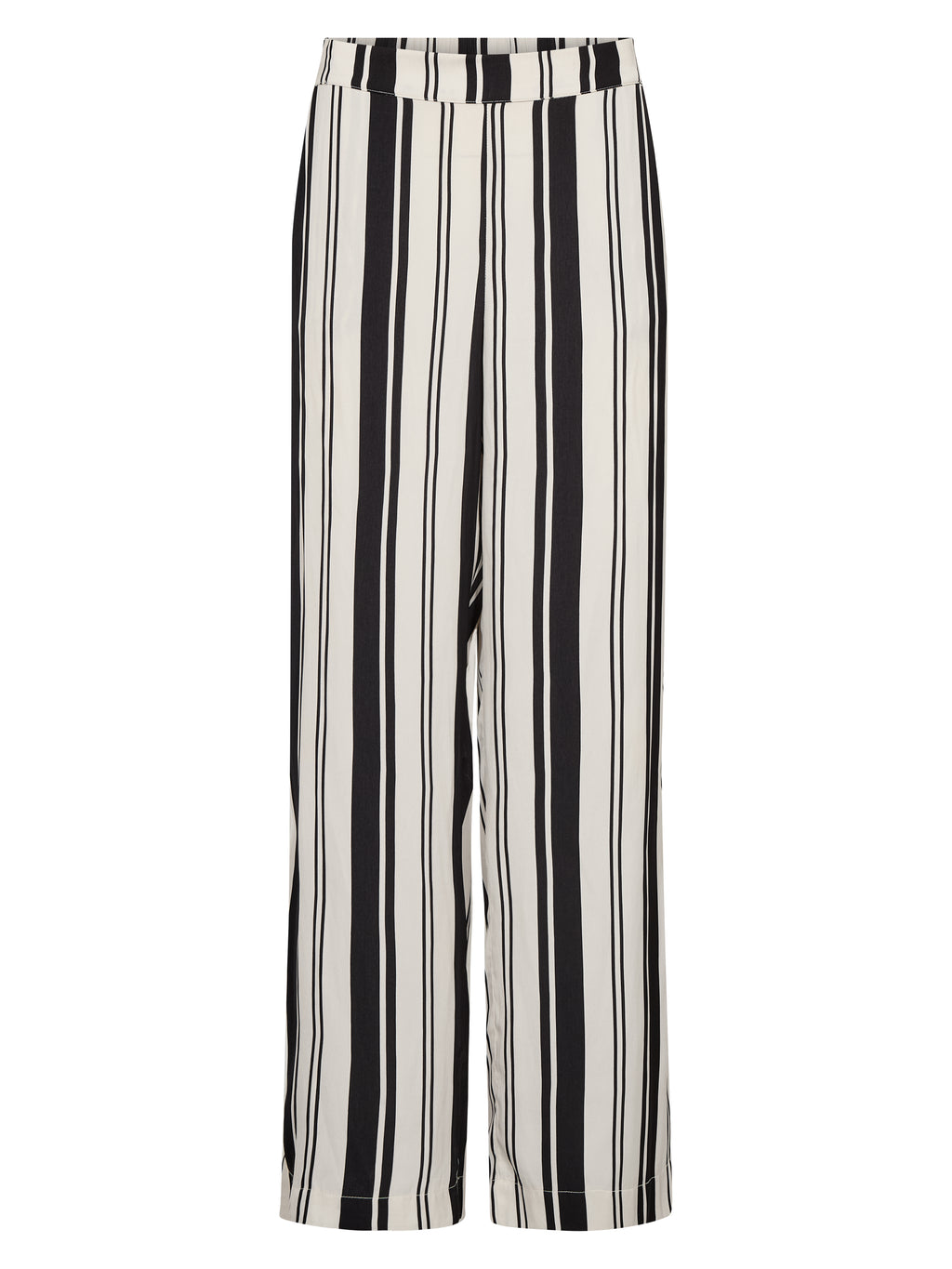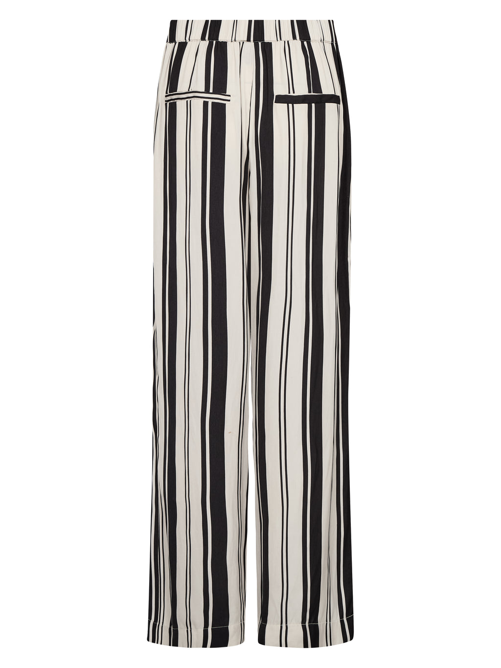 Disse bukser er fremstillet i en blød viskoseblanding med en let glans, som giver et elegant udtryk. De har lange, lige ben og et klassisk snit, hvor striberne skaber et roligt og gennemgående look. Elastik bagpå i taljen sikrer en behagelig pasform, mens de diskrete baglommer tilfører et pænt finish.