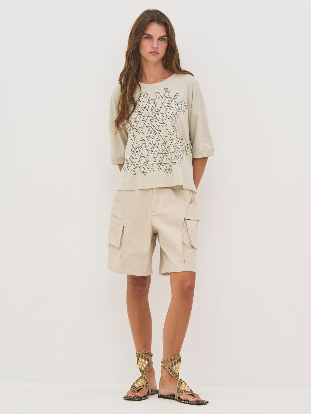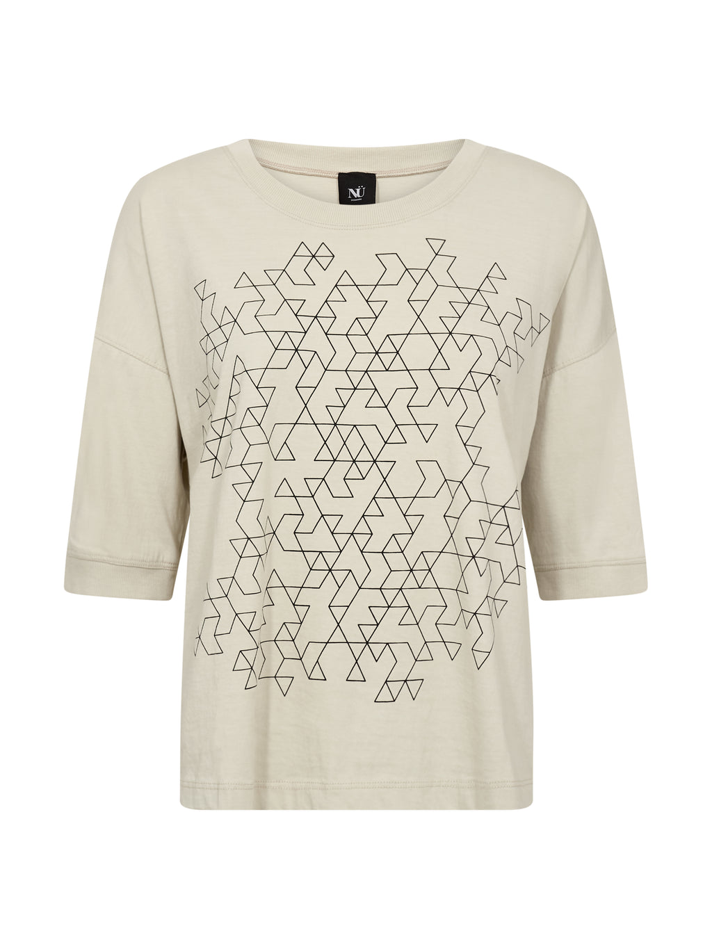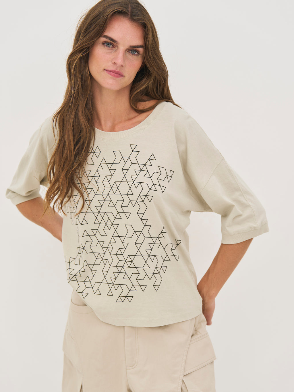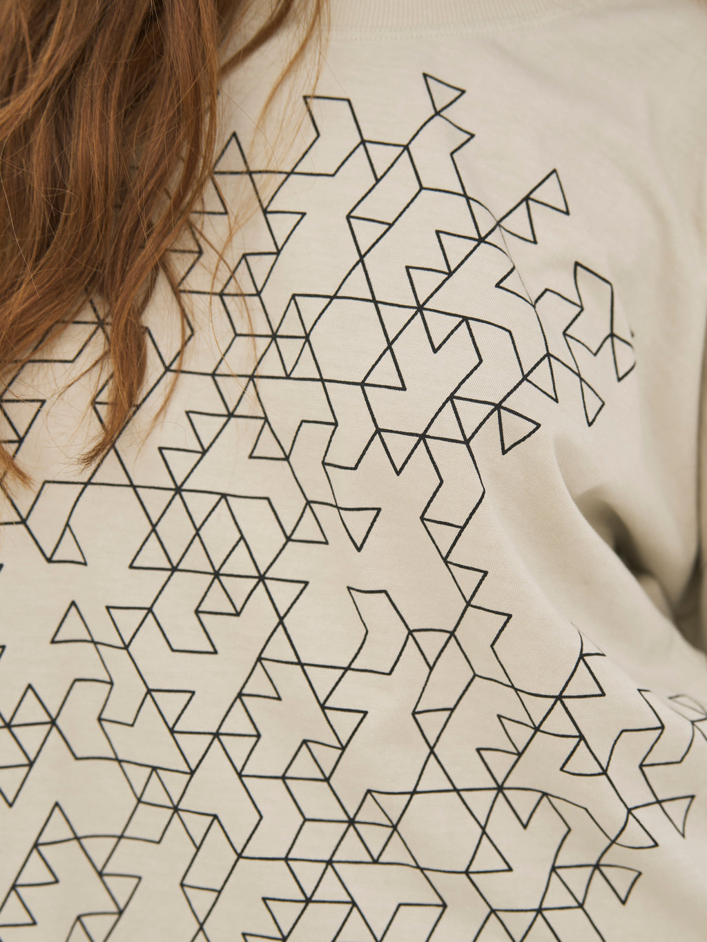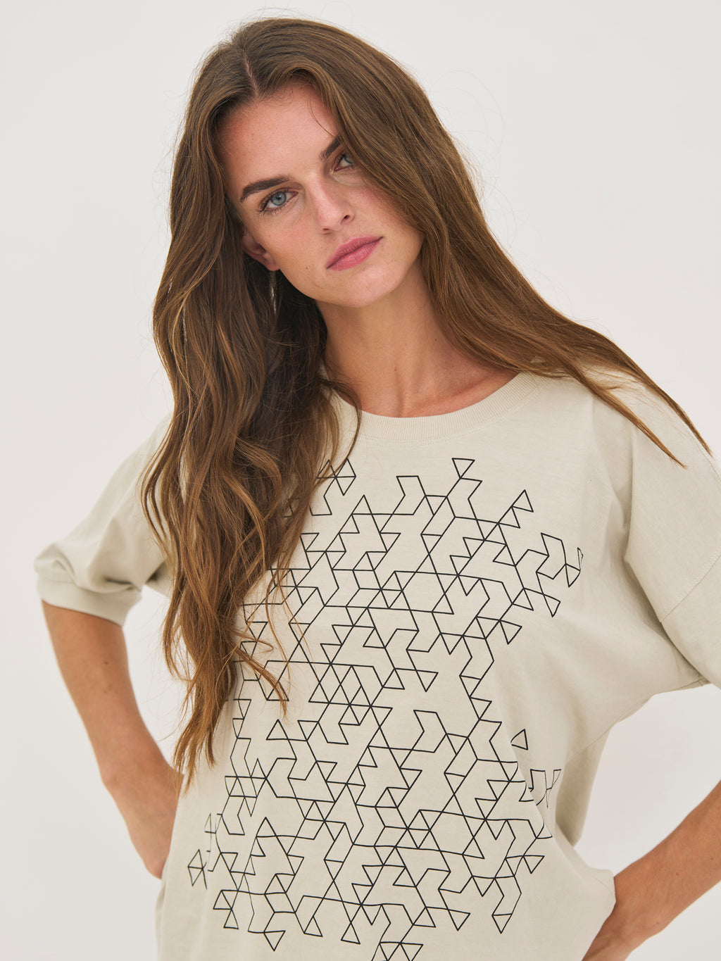 Denne bluse er lavet i blød bomuldsjersey, som giver en behagelig og afslappet fornemmelse til hverdagsbrug. Den har en løs pasform med dropped shoulders, der skaber et ubesværet og moderne udtryk. Det grafiske print foran tilfører et markant og nutidigt element, mens den runde hals og den lige kant holder designet enkelt. Bagtil fortsætter det rene og afslappede look.