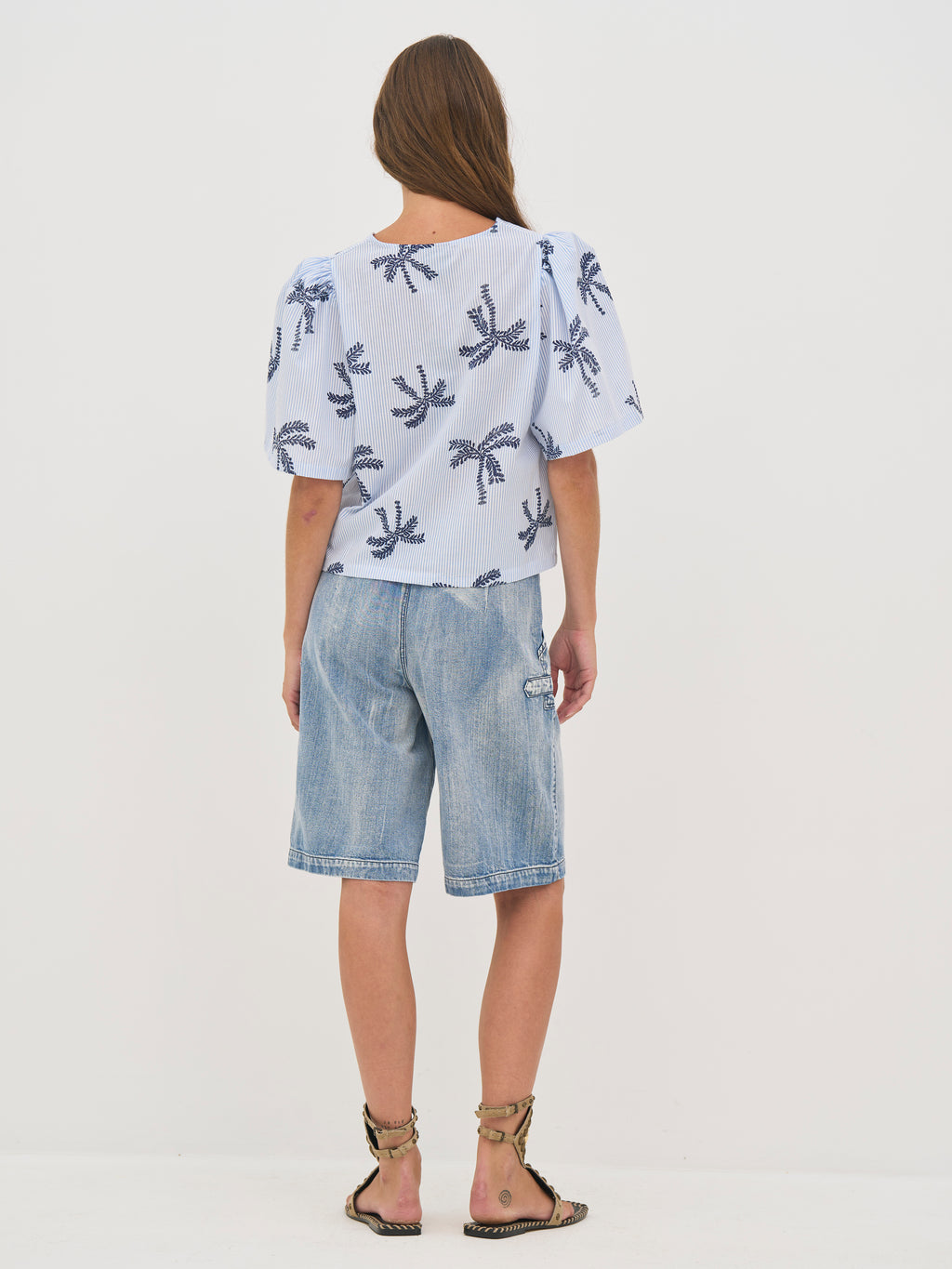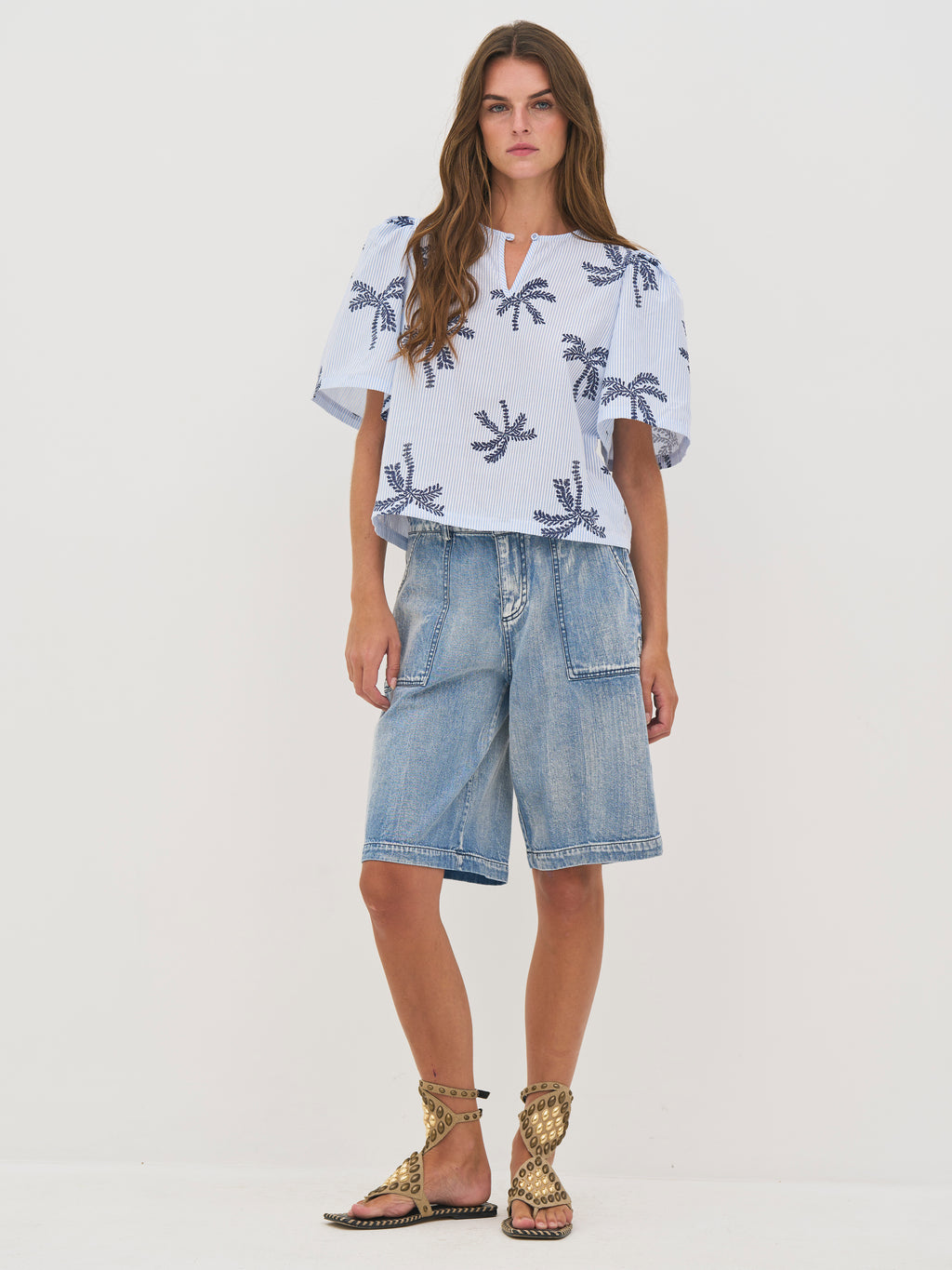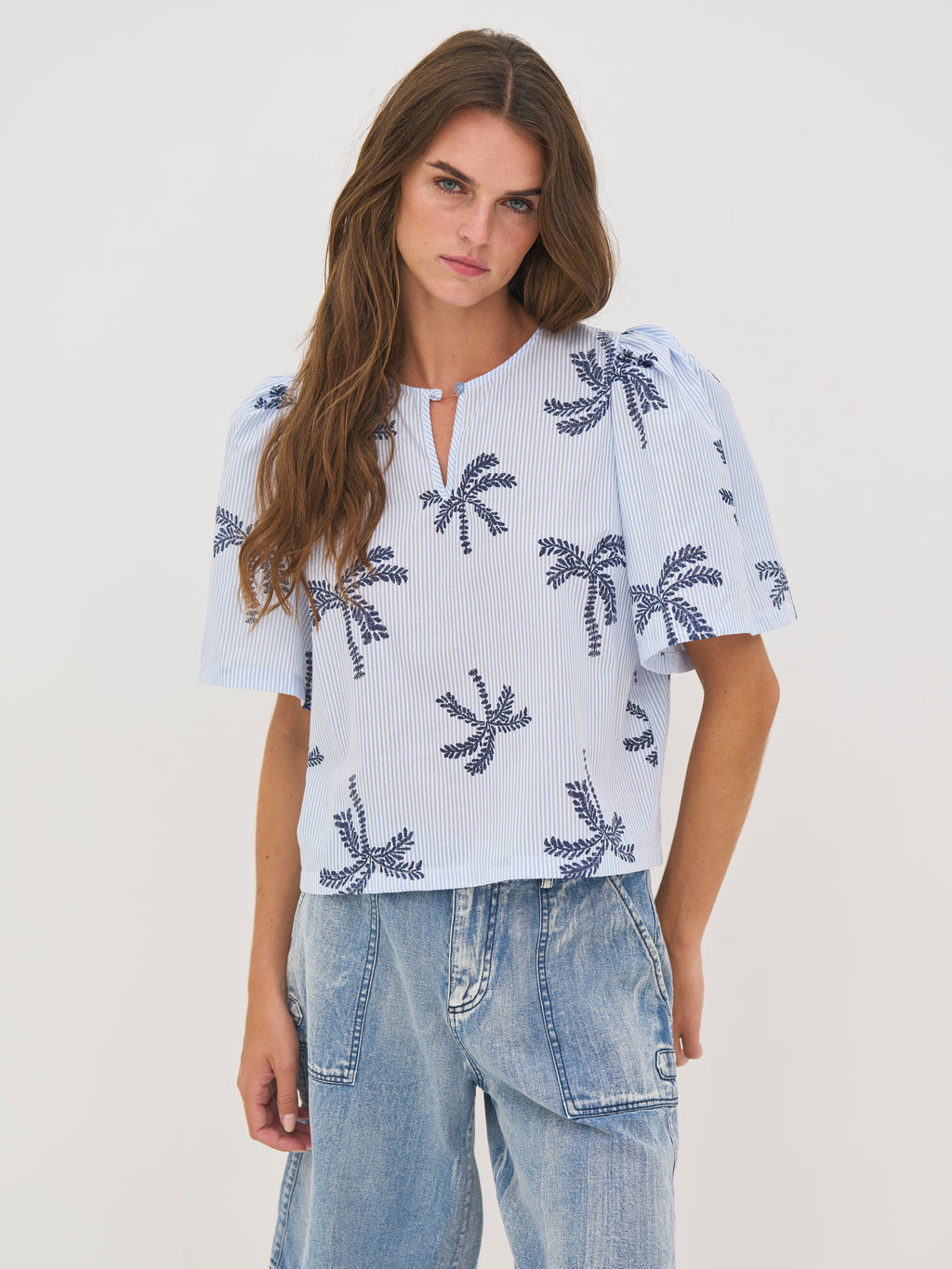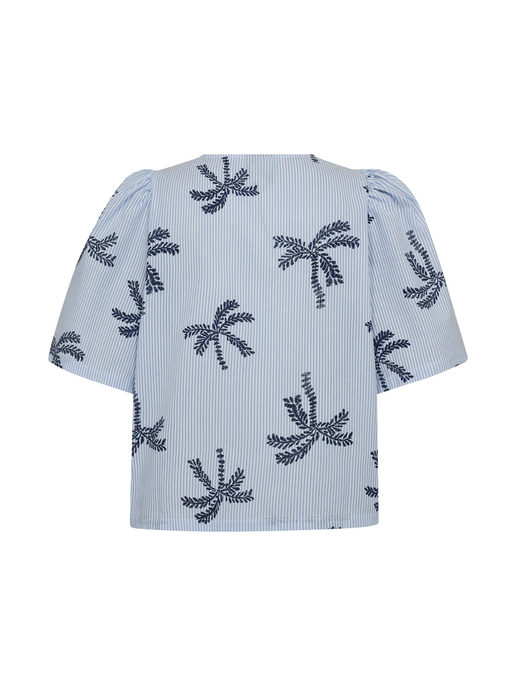 Denne bluse er fremstillet i en let bomuldsblanding med fine striber, som giver et luftigt og behageligt udtryk. De broderede palmedetaljer tilfører et sommerligt og legende præg, mens den afslappede pasform og de let voluminøse ærmer skaber en blød silhuet.