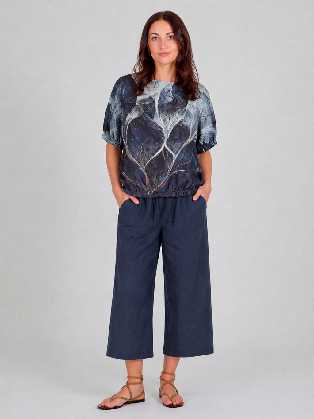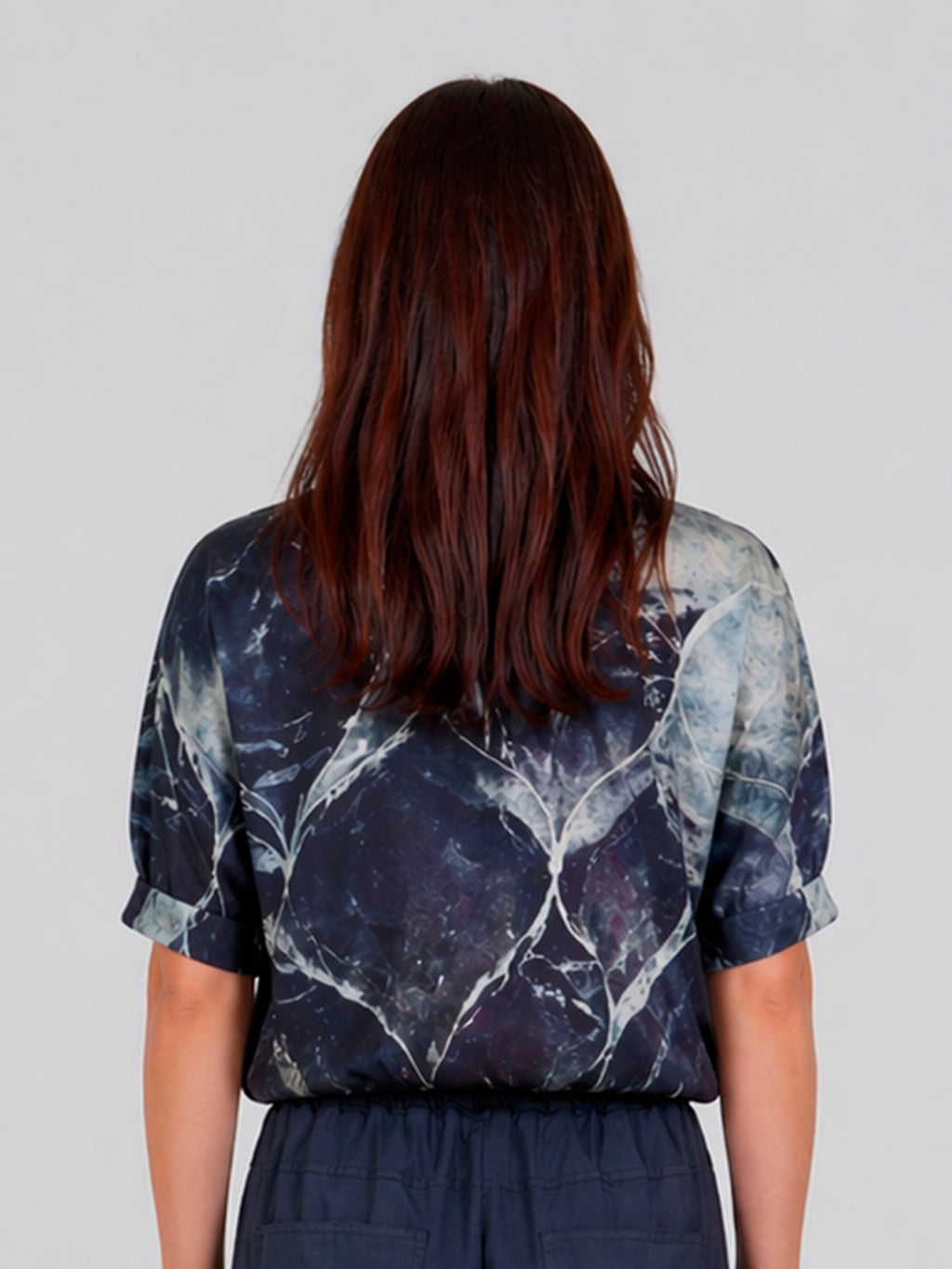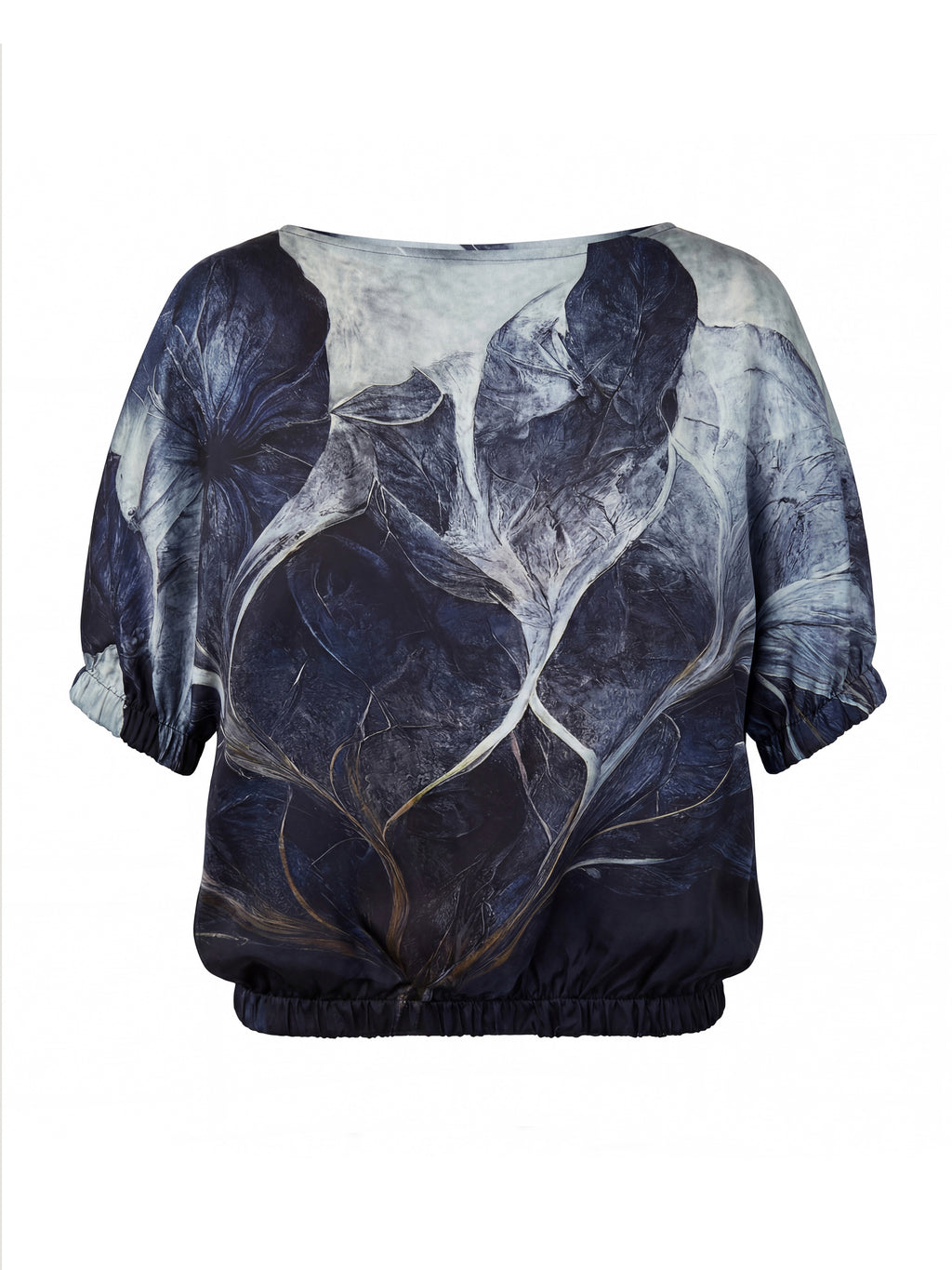 Denne bluse har et let og luftigt udtryk med et smukt fald og en afslappet pasform. Det gennemgående print tilfører et levende og moderne look. Blusen har en rund udskæring, korte ærmer med en let elastisk kant. Elastikken forneden skaber en let ballon-effekt. Bagtil fortsætter det samme rolige og flydende udtryk.