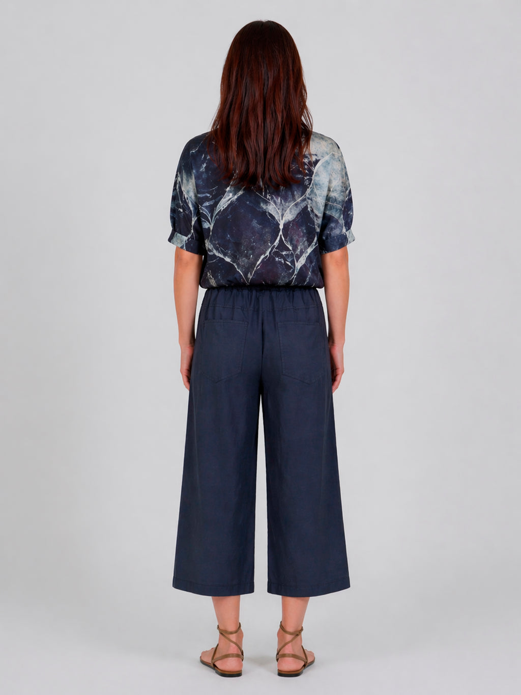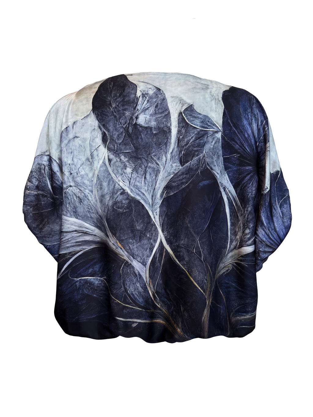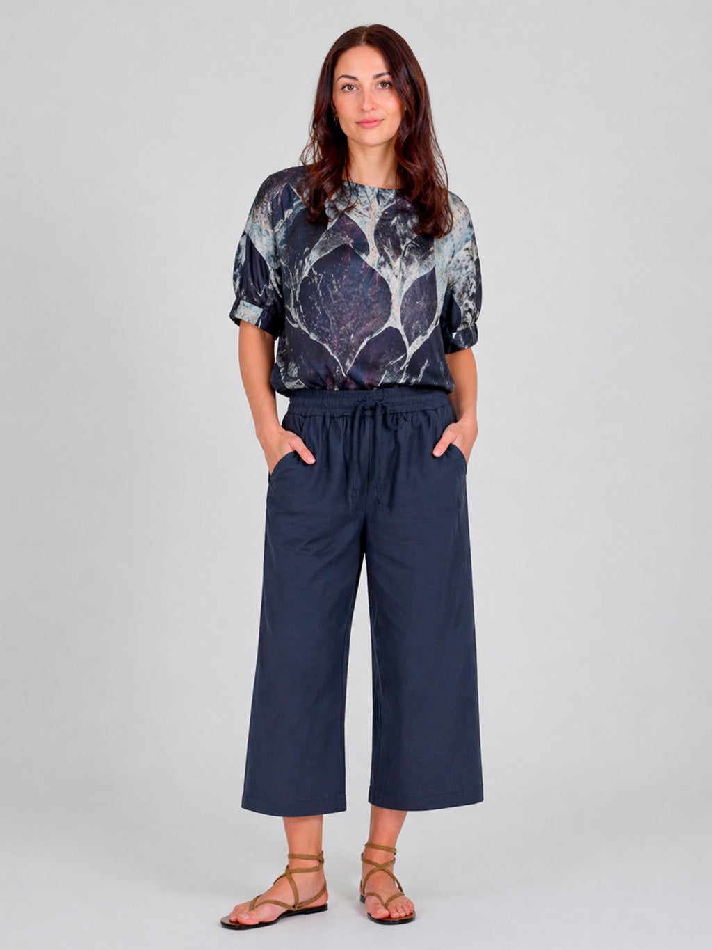 Denne bluse har et let og luftigt udtryk med et smukt fald og en afslappet pasform. Det gennemgående print tilfører et levende og moderne look. Blusen har en rund udskæring, korte ærmer med en let elastisk kant. Elastikken forneden skaber en let ballon-effekt. Bagtil fortsætter det samme rolige og flydende udtryk.