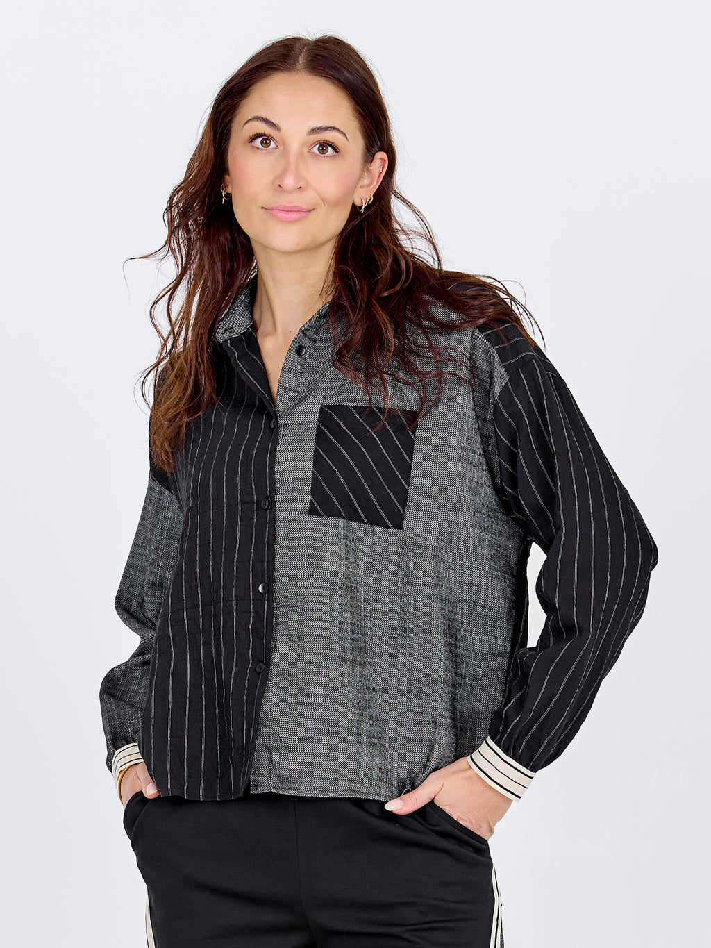 Brug skjorten åben over en top og match med de tilhørende bukser for et afslappet og stilfuldt hverdagsoutfit.