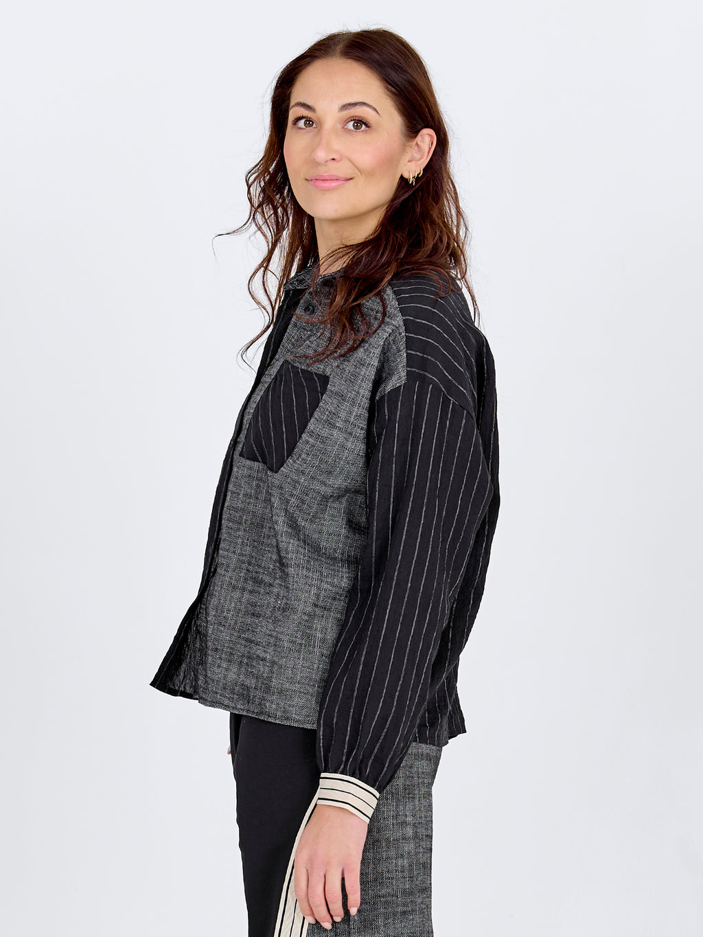 Denne skjorte kombinerer forskellige strukturer og striber i et moderne patchworkdesign. Den har korte ærmer, klassisk krave og gennemgående knaplukning. På brystet ses en enkelt lomme med lodrette striber i kontrast til resten af frontens asymmetriske mønster. Bagstykket fortsætter med det stribede look og giver en harmonisk afrunding.