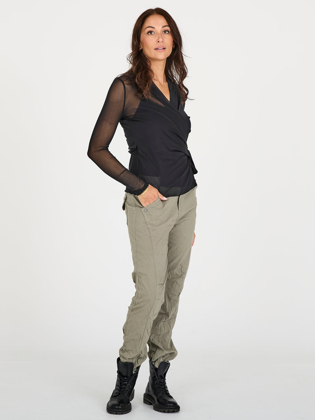 Giv dit outfit et moderne twist med disse bukser, der forener praktiske detaljer med et afslappet snit. De har lige ben, markerede syninger og klaplommer bagpå med knapper, som tilføjer et cool, funktionelt udtryk. Den let vasket overflade giver stoffet karakter, mens bæltestropper og skrålommer gør dem anvendelige til hverdagsbrug.