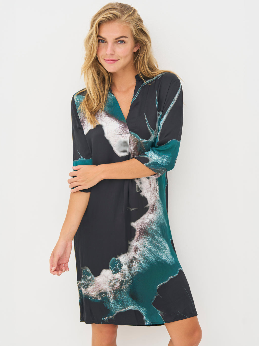 Denne tunika forener komfort og stil i ét design. Den har en løs, lige pasform med 3/4-ærmer og en blød krave, der giver et afslappet, men sofistikeret udtryk. Det gennemgående blomsterprint tilføjer visuel dybde, mens den skjulte knaplukning foran skaber et rent og elegant look. En lille læg i ryggen giver ekstra bevægelighed og luftighed.