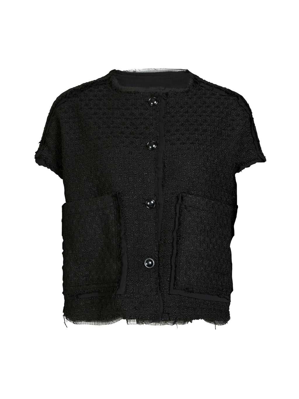 Denne vest har et råt og karakterfuldt udtryk med sit boucle-materiale og synlige, flossede kanter. Designet er enkelt, men fuld af kant – de åbne tråde og løse snore understreger det upolerede look og giver vesten en helt særlig attitude. De store påsyede lommer foran tilfører funktion og understøtter det afslappede, men markante design.