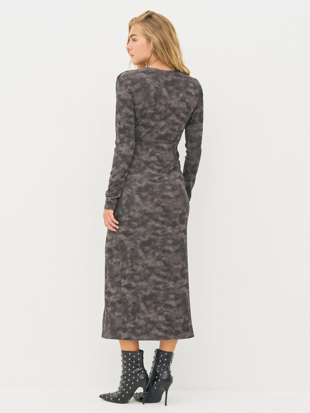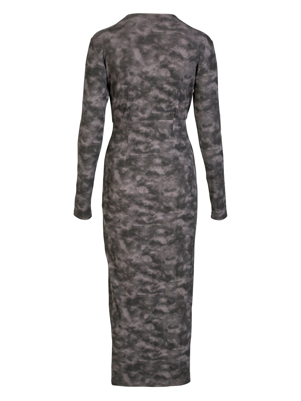 Denne elegante kjole har en flatterende slå-om-effekt og et let draperet snit, som giver et feminint og formfuldt udtryk. Det bløde materiale smyger sig om kroppen, mens de lange ærmer gør den velegnet til både dag og aften. Det diskrete print tilfører dybde og karakter til det enkle design.