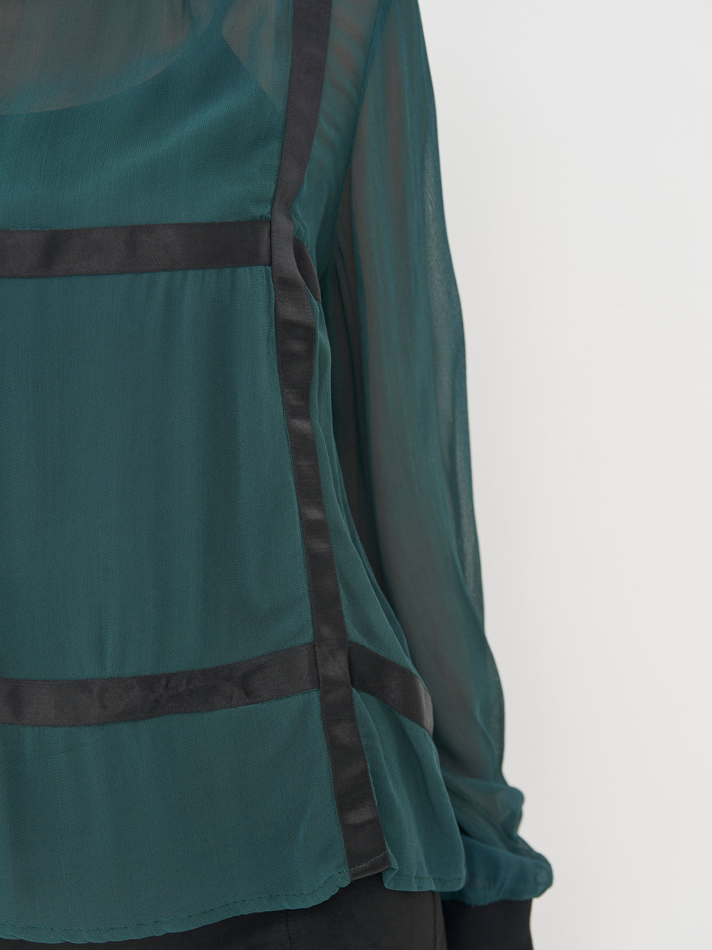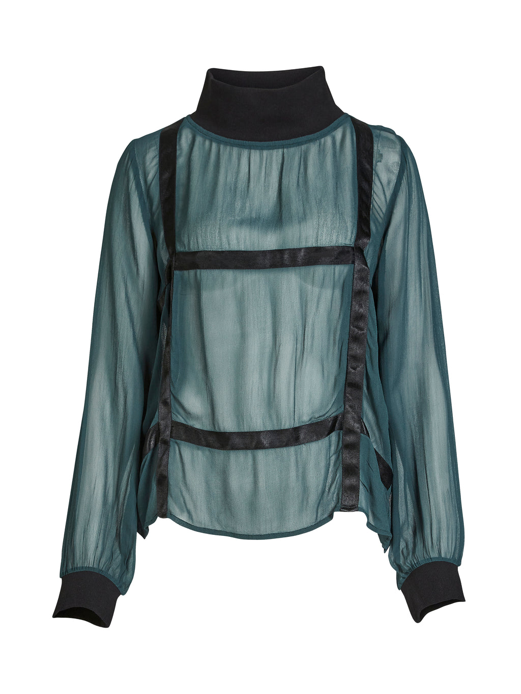 Skil dig ud med denne stilfulde bluse i let transparent materiale og markante kontrastbånd. Den har lange ærmer med ribmanchetter og en høj, blød krave i rib, som giver en sporty og moderne kontrast til det feminine stof. De brede bånd skaber en grafisk effekt og understreger blusens unikke design.