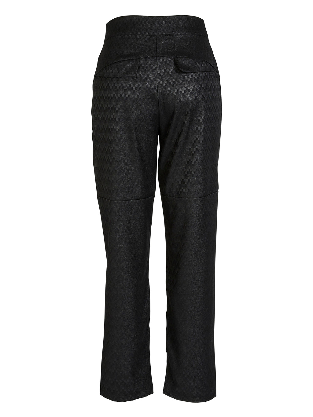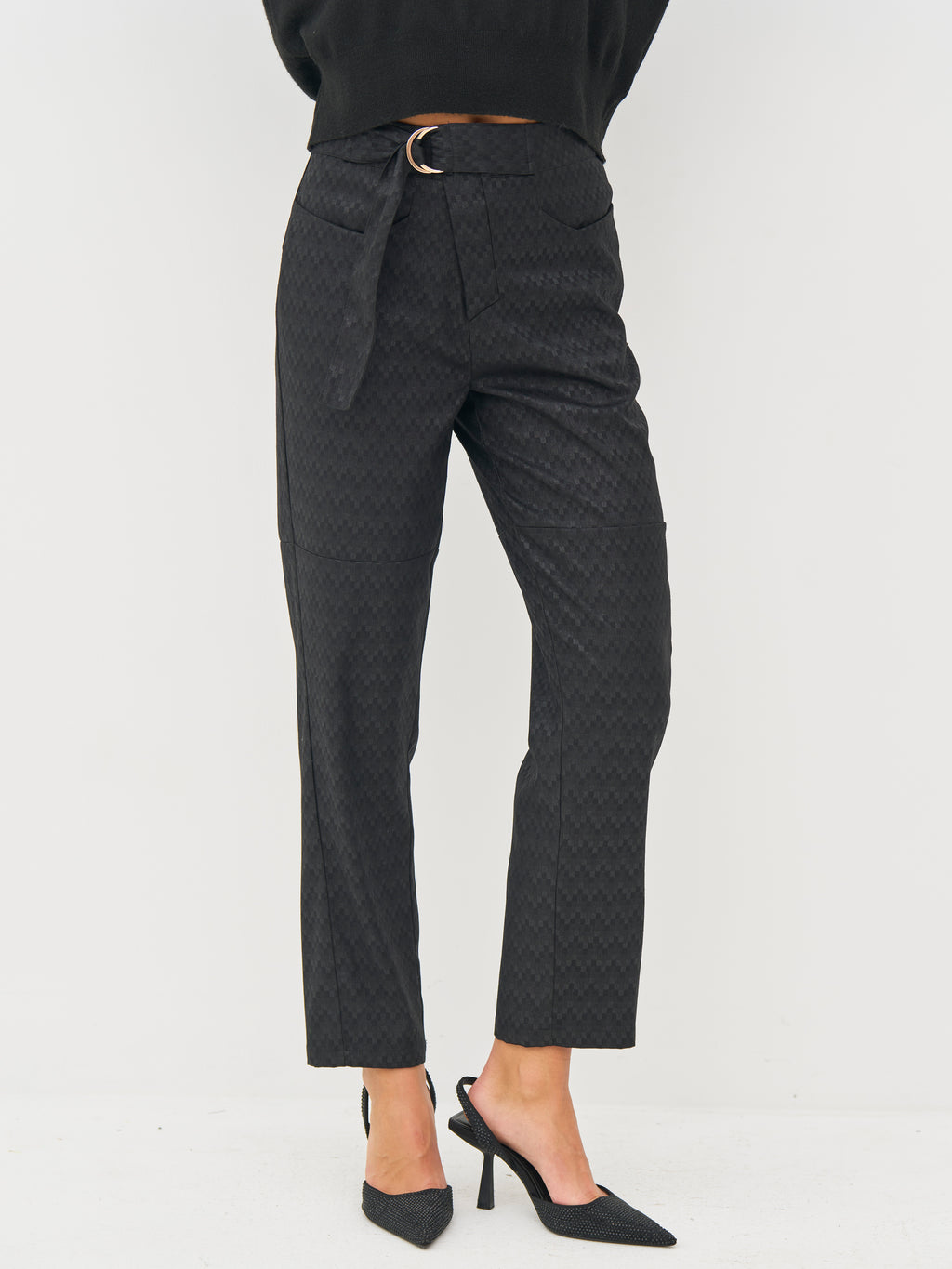 Bukserne har et diskret, men markant mønster, som giver stoffet et eksklusivt udtryk. De lige ben og den faste linning skaber en elegant silhuet, mens bælte med D-ring tilføjer et stilfuldt element og sikrer en justerbar pasform. Forlommerne er funktionelle, og de paspolerede lommer bagpå fuldender det gennemførte design. Søm ved knæet giver ekstra struktur.