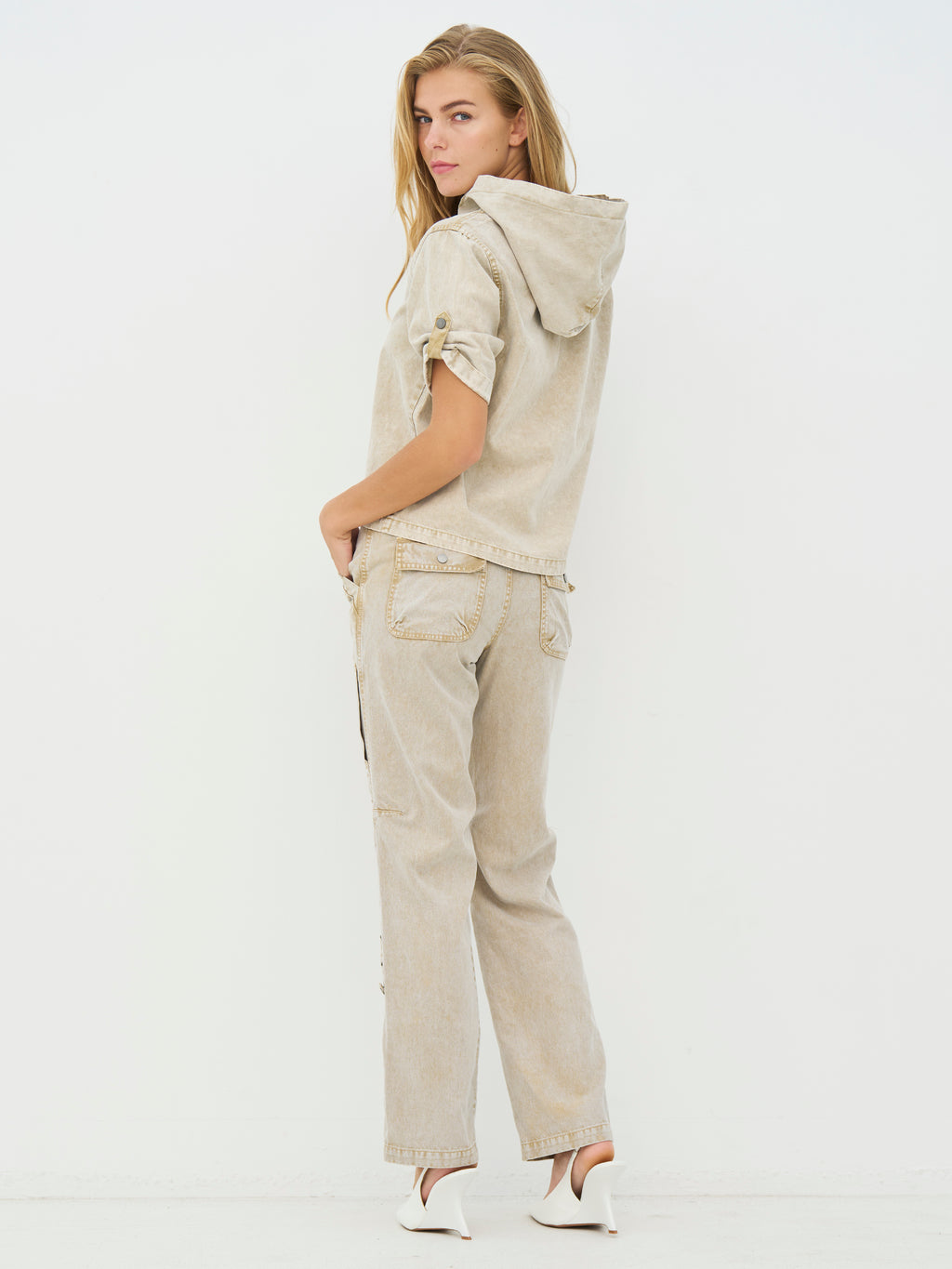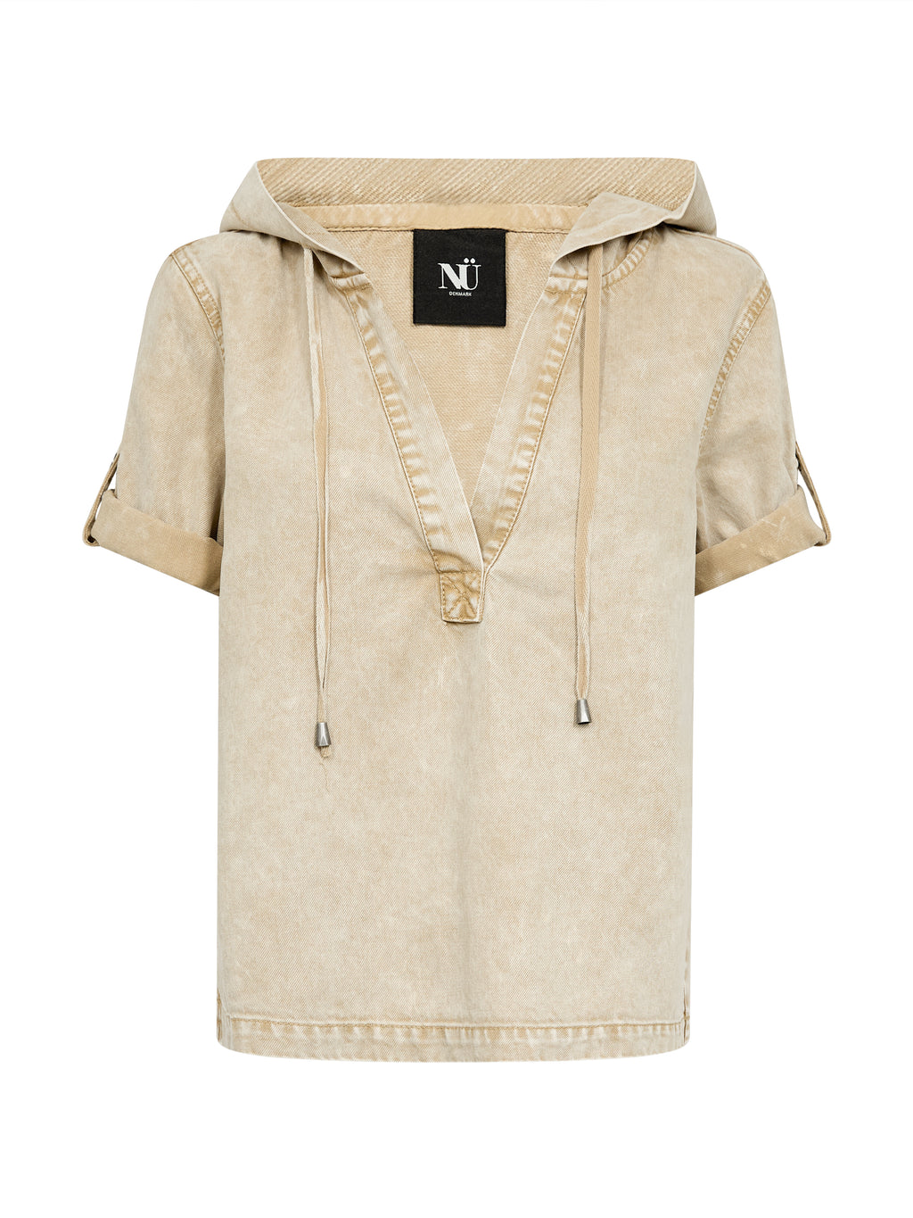 Denne top har et afslappet, men gennemført udtryk med hætte og V-udskæring, der giver et moderne look. Den korte ærmelængde kombineret med den rå vask tilfører kant og karakter, mens snøren i hætten understreger det uformelle udtryk. Foran er designet enkelt med fokus på udskæringen, og bagpå falder toppen lige og ukompliceret. Style den med de matchende bukser for et samlet sæt eller sammen med jeans eller shorts til hverdagsbrug.