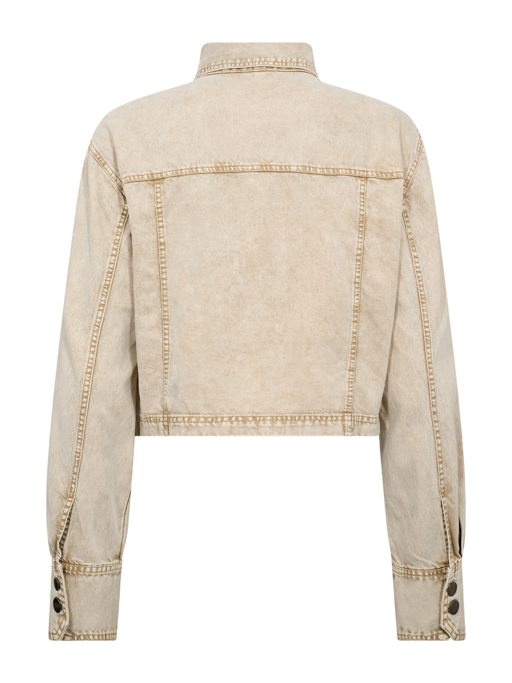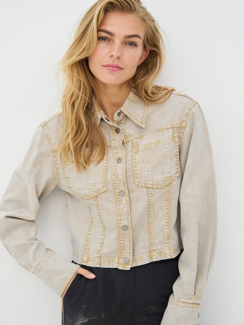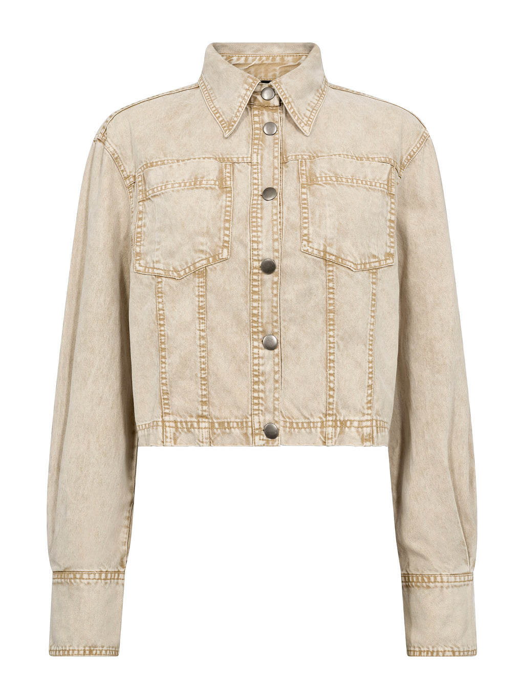 Denne korte denimjakke har et råt og tidløst udtryk med klassisk krave og gennemgående knaplukning foran. De synlige stikninger og brystlommer giver jakken et tydeligt denimlook, mens den korte længde skaber en mere skarp silhuet. Ærmerne er lange med manchetter, og bagpå er designet enkelt og rent. Jakken er nem at style både lukket og åben – brug den over en kjole, til højtaljede bukser eller som et ekstra lag til hverdagen.