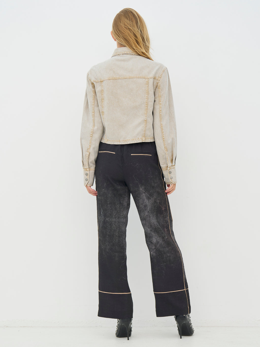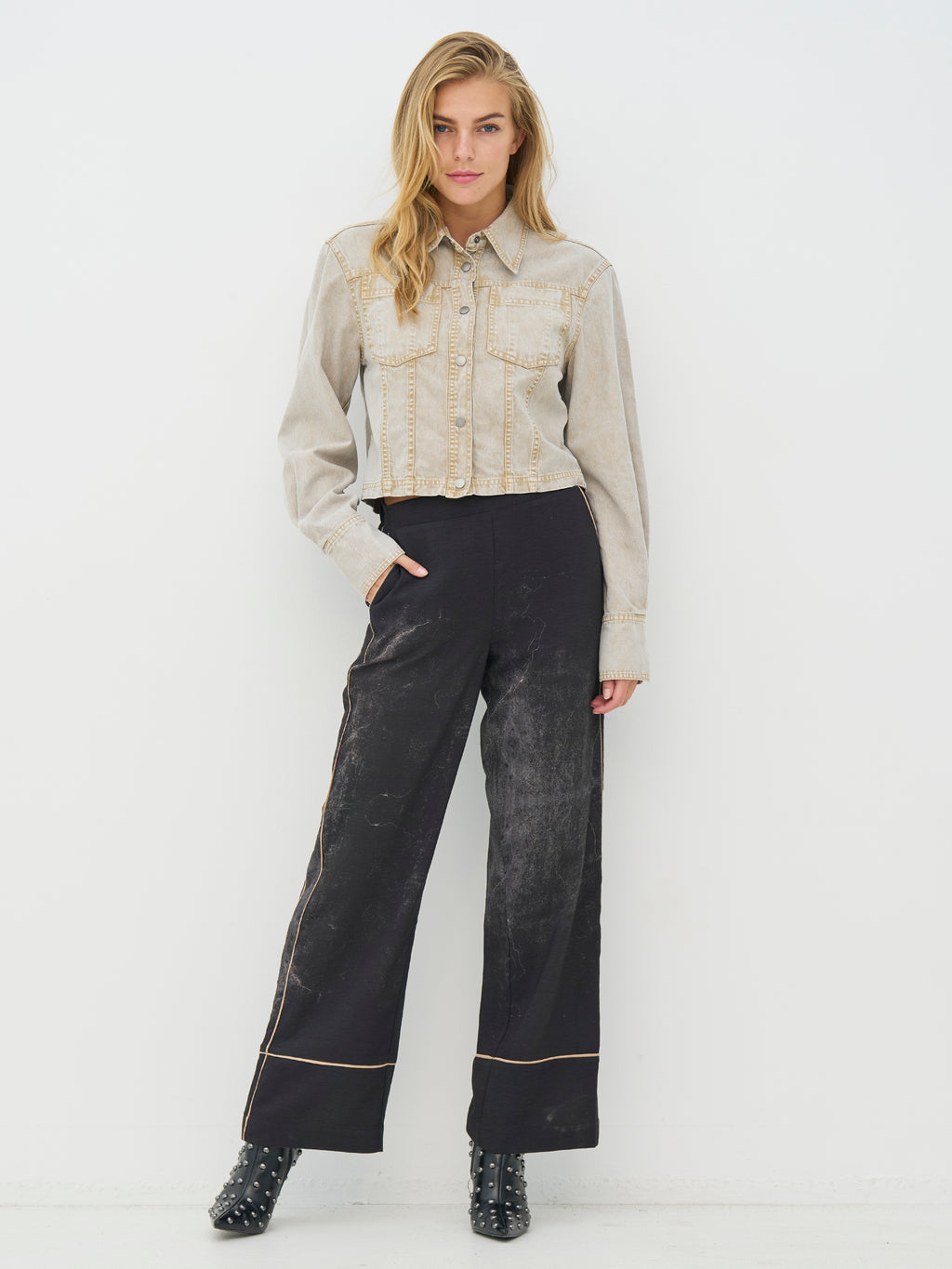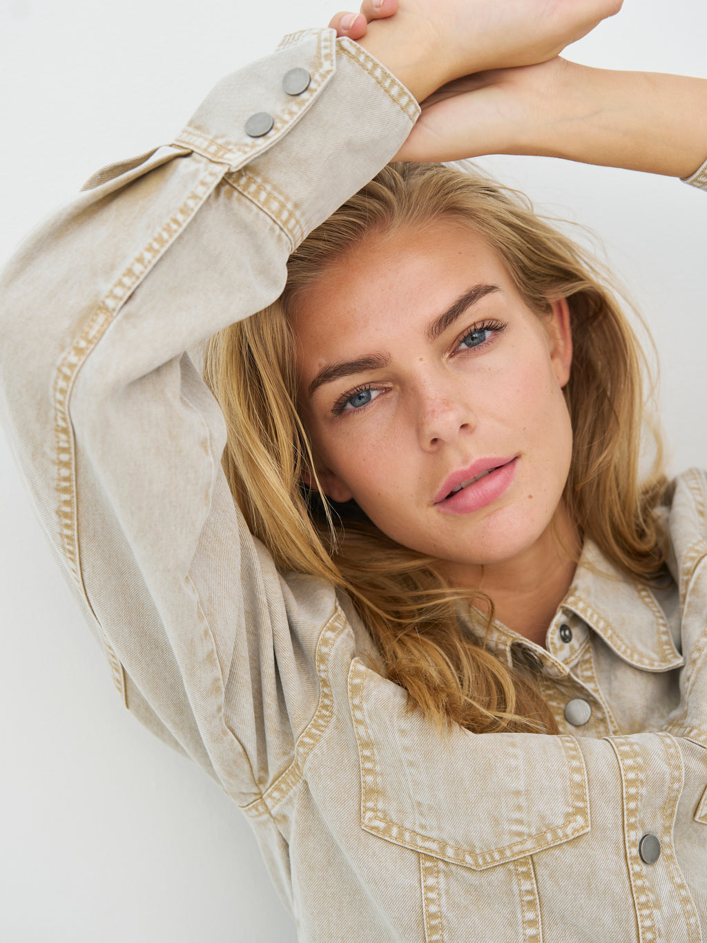 Denne korte denimjakke har et råt og tidløst udtryk med klassisk krave og gennemgående knaplukning foran. De synlige stikninger og brystlommer giver jakken et tydeligt denimlook, mens den korte længde skaber en mere skarp silhuet. Ærmerne er lange med manchetter, og bagpå er designet enkelt og rent. Jakken er nem at style både lukket og åben – brug den over en kjole, til højtaljede bukser eller som et ekstra lag til hverdagen.