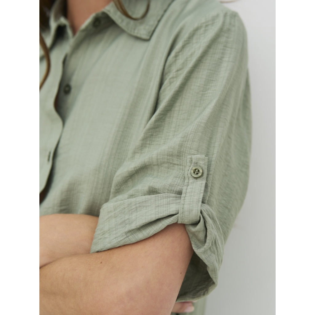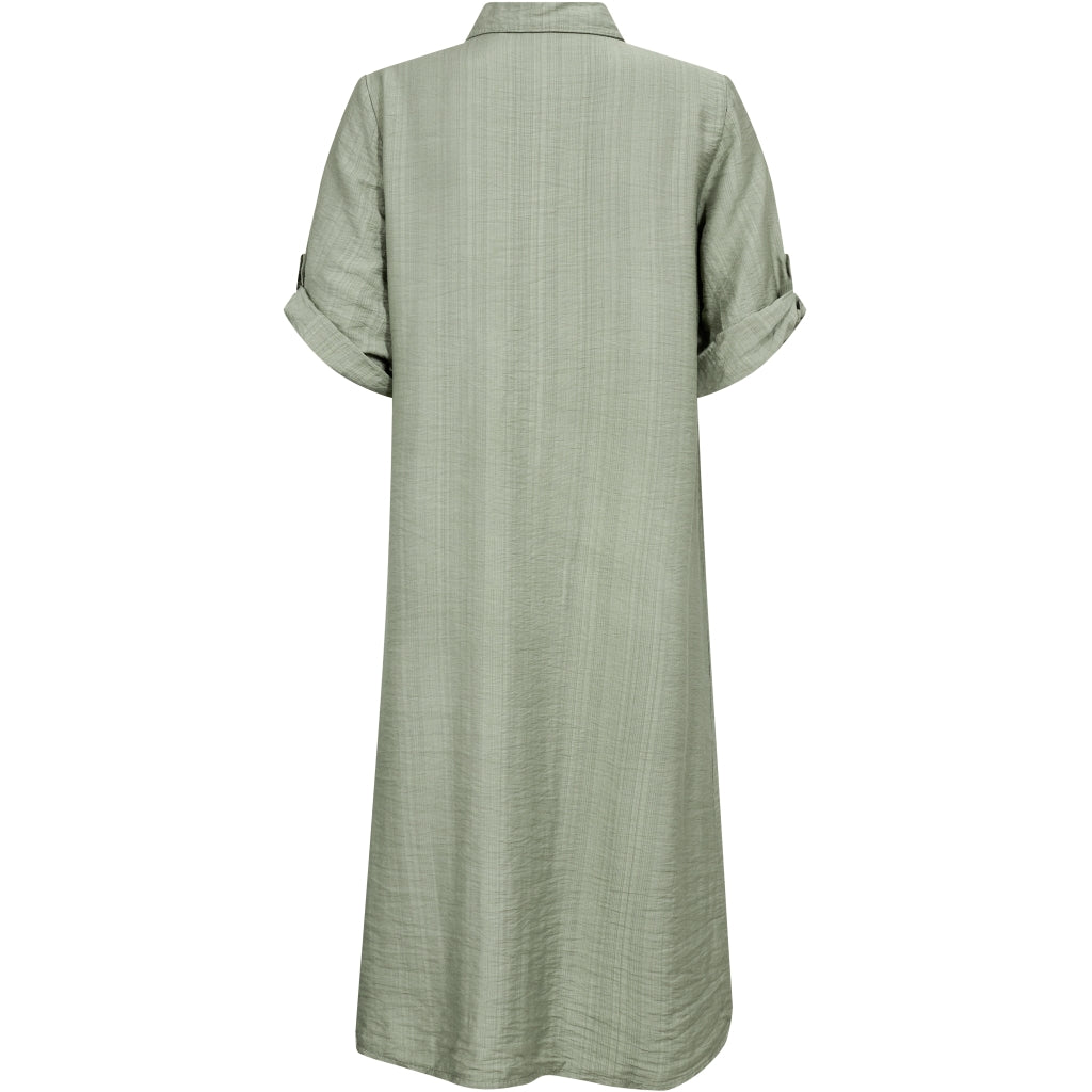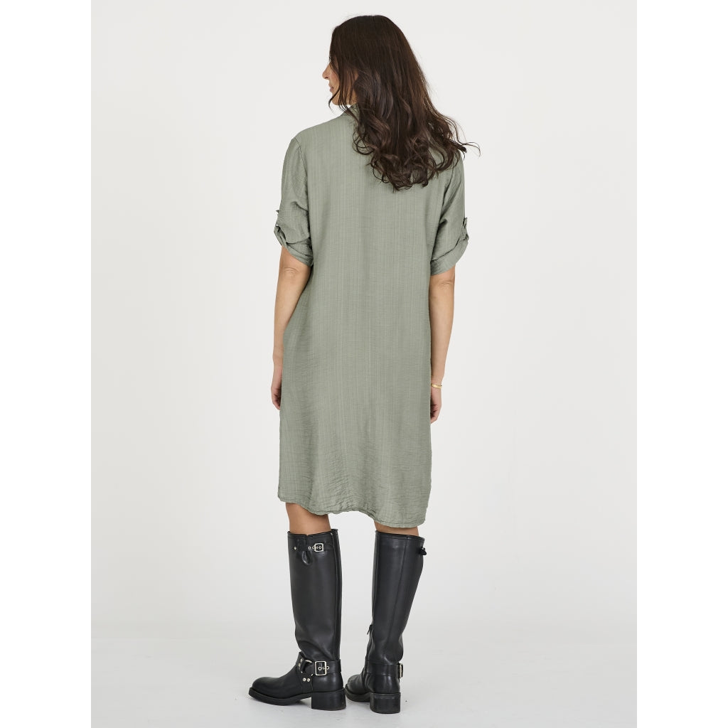 Denne skjortekjole kombinerer enkelhed og funktionalitet i et løst og behageligt snit. Den har gennemgående knaplukning fortil, klassisk skjortekrave og ærmer med opsmøg, der kan justeres med knapstrop. Kjolen har sidelommer, som giver et praktisk element, og den let strukturerede kvalitet fuldender det afslappede udtryk.