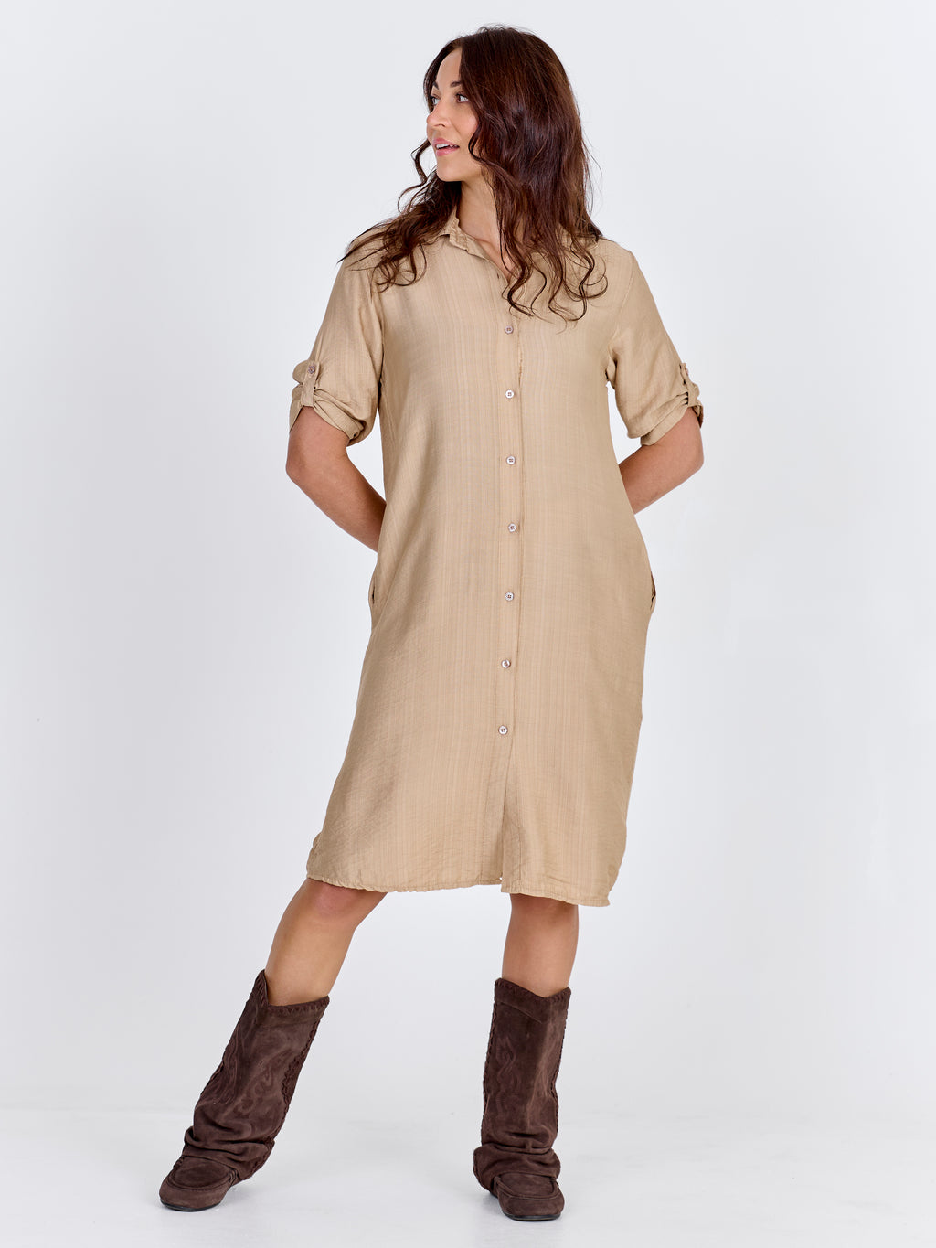 Denne skjortekjole kombinerer enkelhed og funktionalitet i et løst og behageligt snit. Den har gennemgående knaplukning fortil, klassisk skjortekrave og ærmer med opsmøg, der kan justeres med knapstrop. Kjolen har sidelommer, som giver et praktisk element, og den let strukturerede kvalitet fuldender det afslappede udtryk.