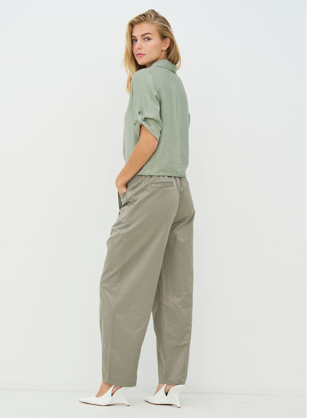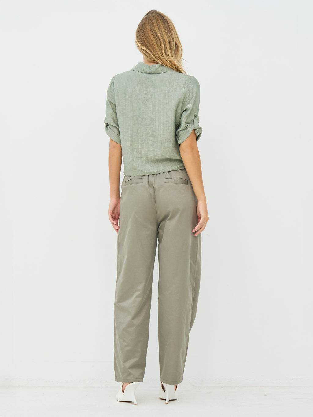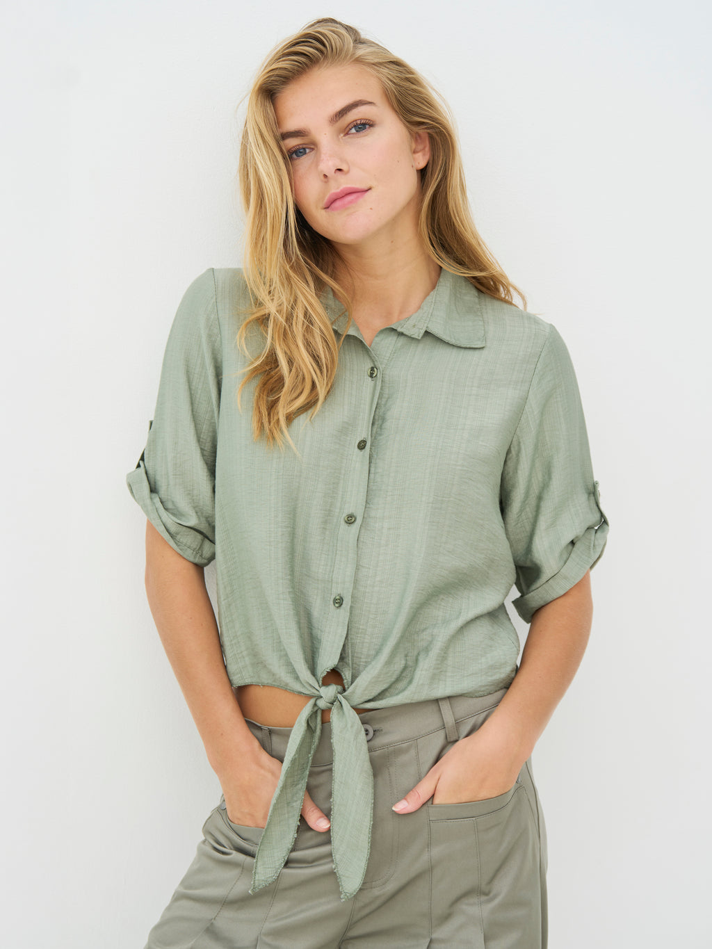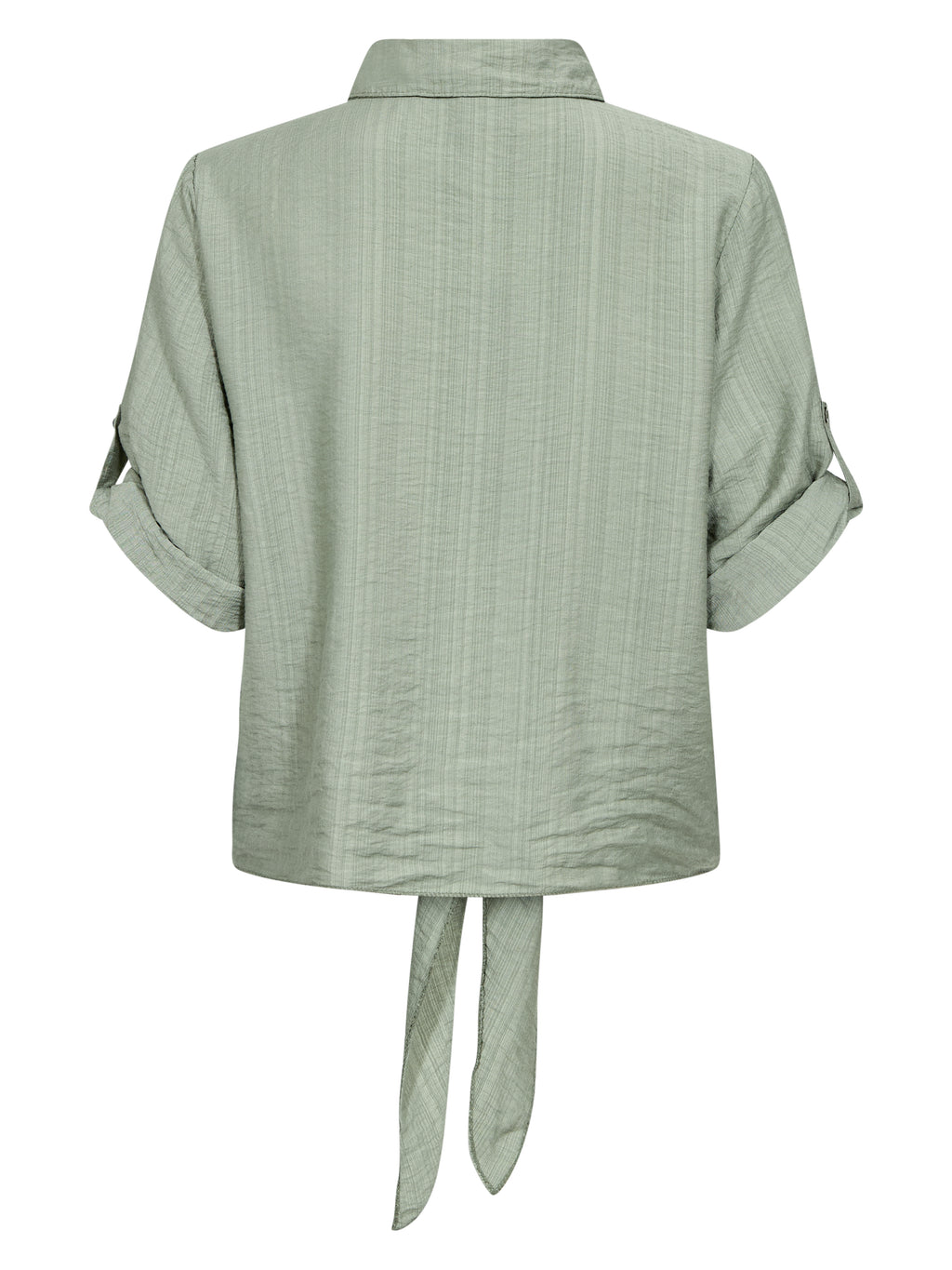 Denne skjorte har et let og afslappet udtryk med korte ærmer, der kan smøges op og fastgøres med strop. Fortil lukkes den med knapper og afsluttes med en dekorativ bindedetalje, som giver et feminint præg. Bagsiden er enkel og lige i snittet. Style skjorten med løse bukser, en nederdel eller shorts for et afslappet hverdagslook, eller brug den åben over en enkel top på varme dage.
