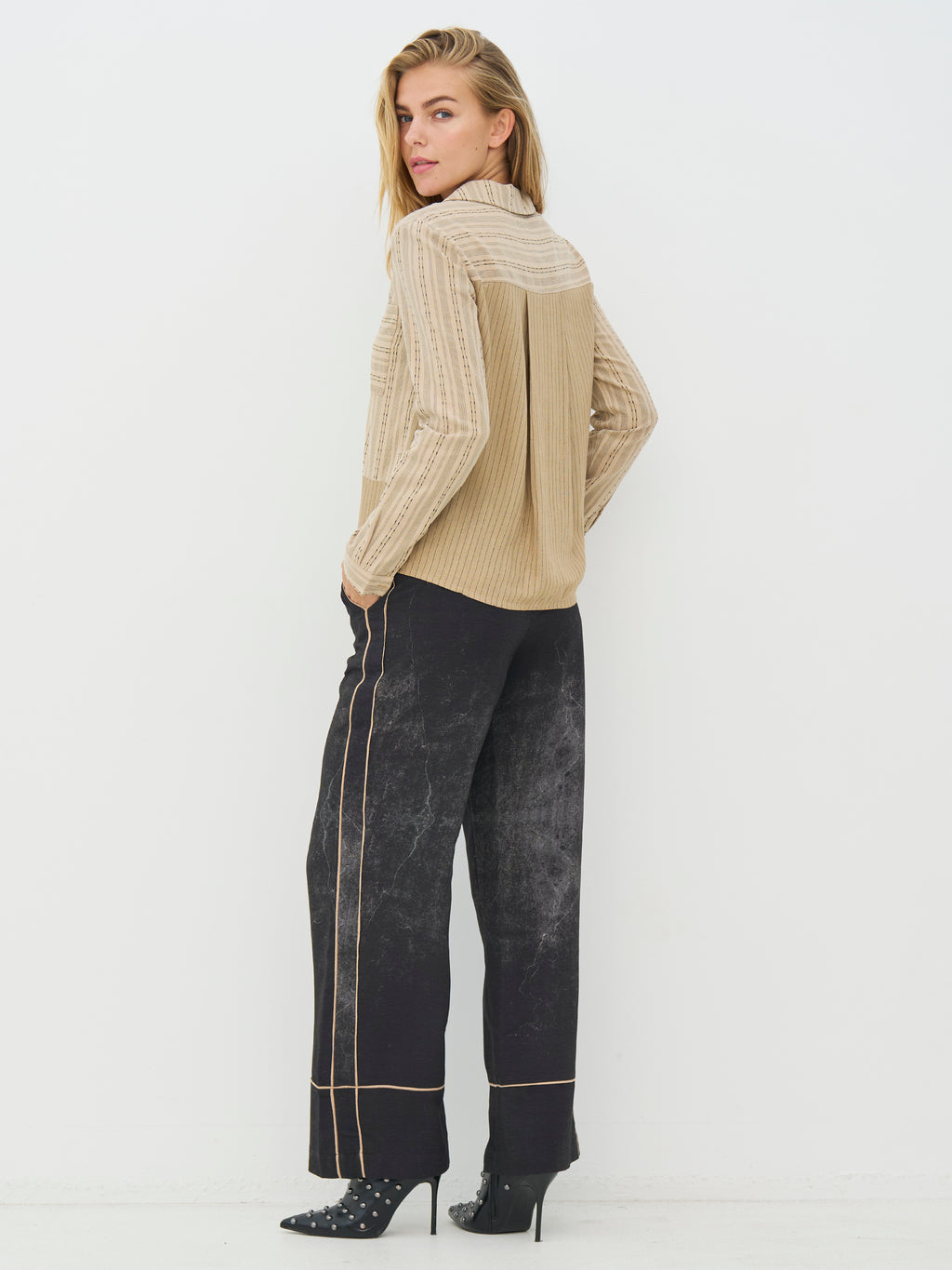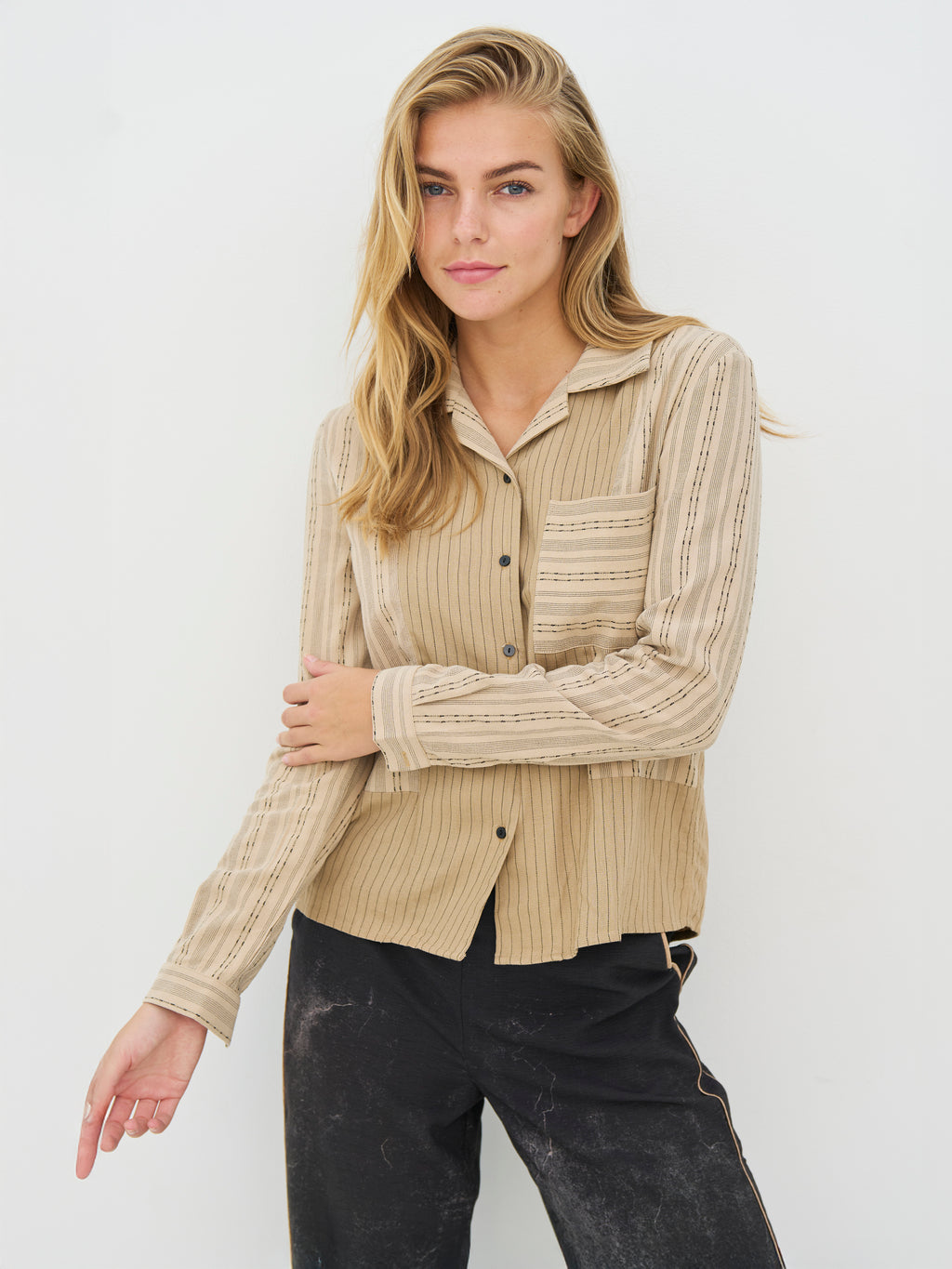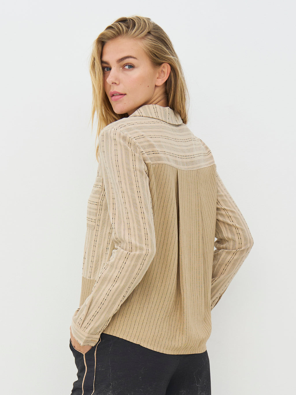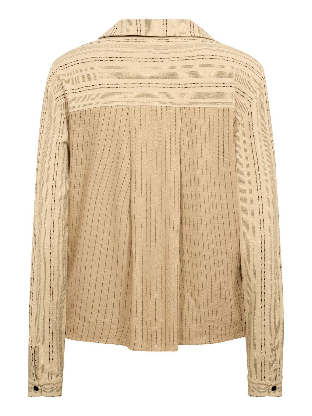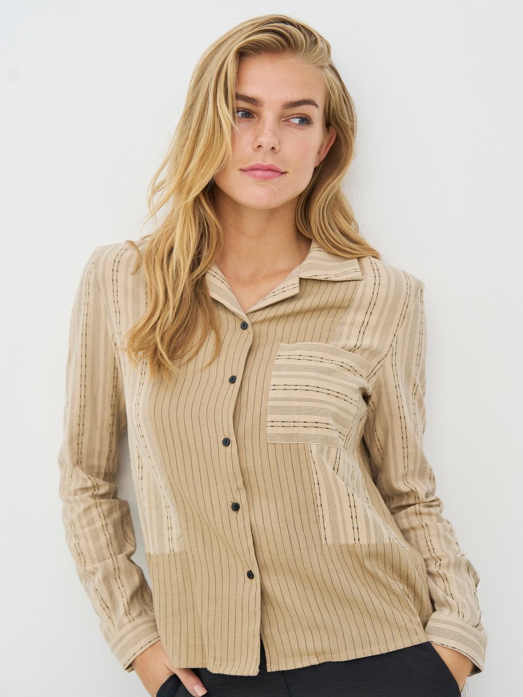 Skjorten har et tidløst udtryk med et miks af fine, lodrette og vandrette striber, som giver et enkelt og moderne spil. Fortil har den en gennemgående knaplukning og en synlig brystlomme, mens ryggen er designet med en let fold. De lange ærmer afsluttes med cuffs, der har knapper.