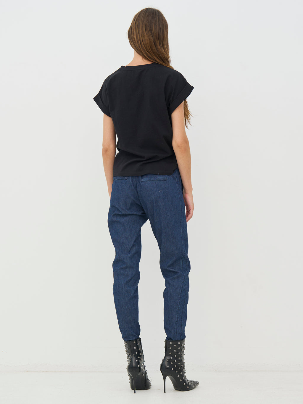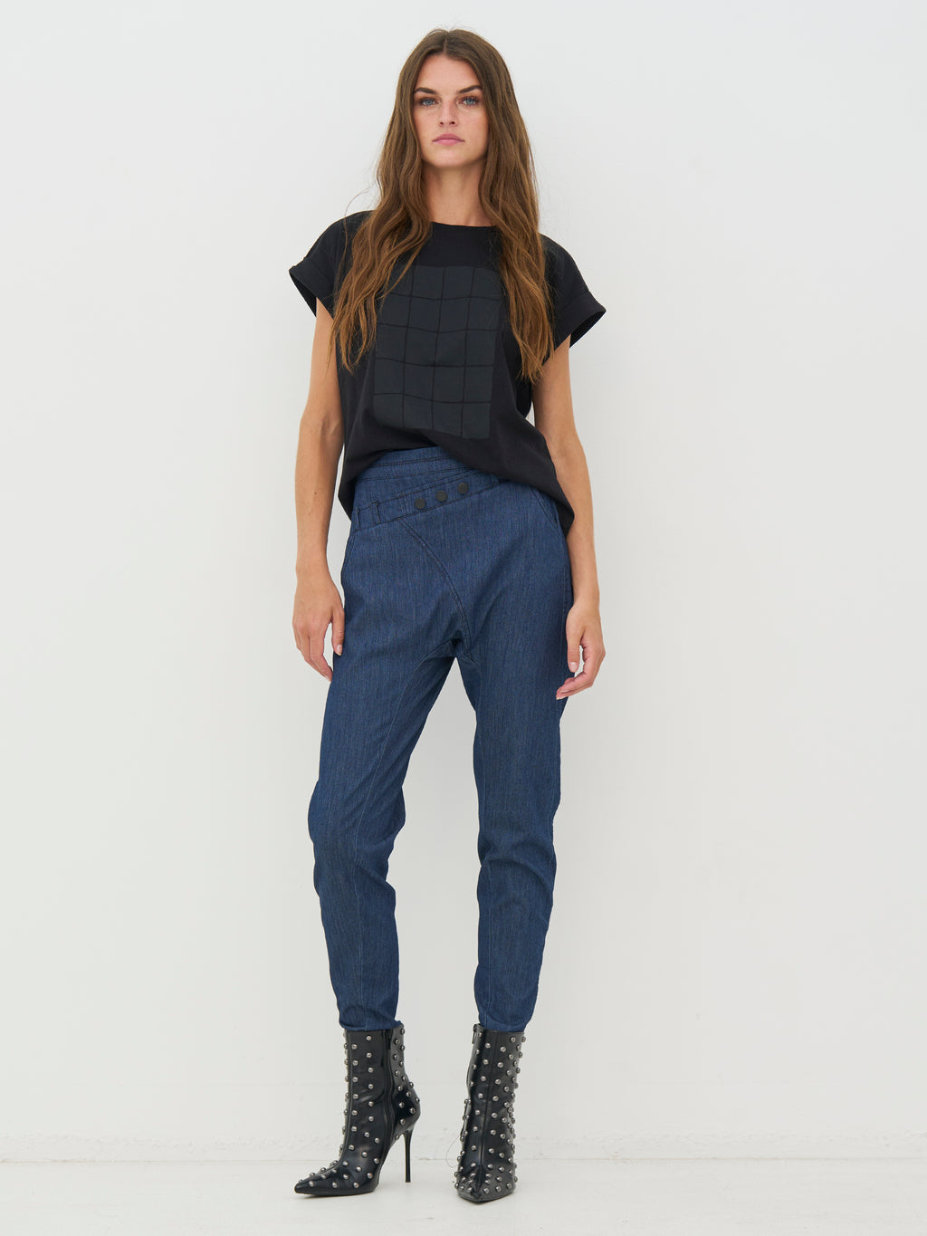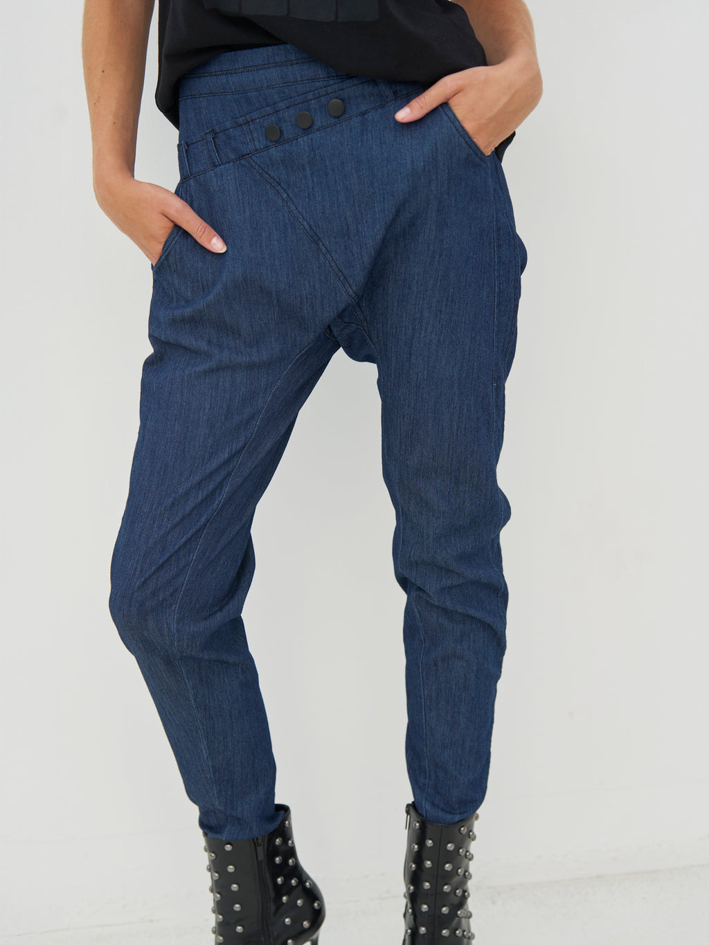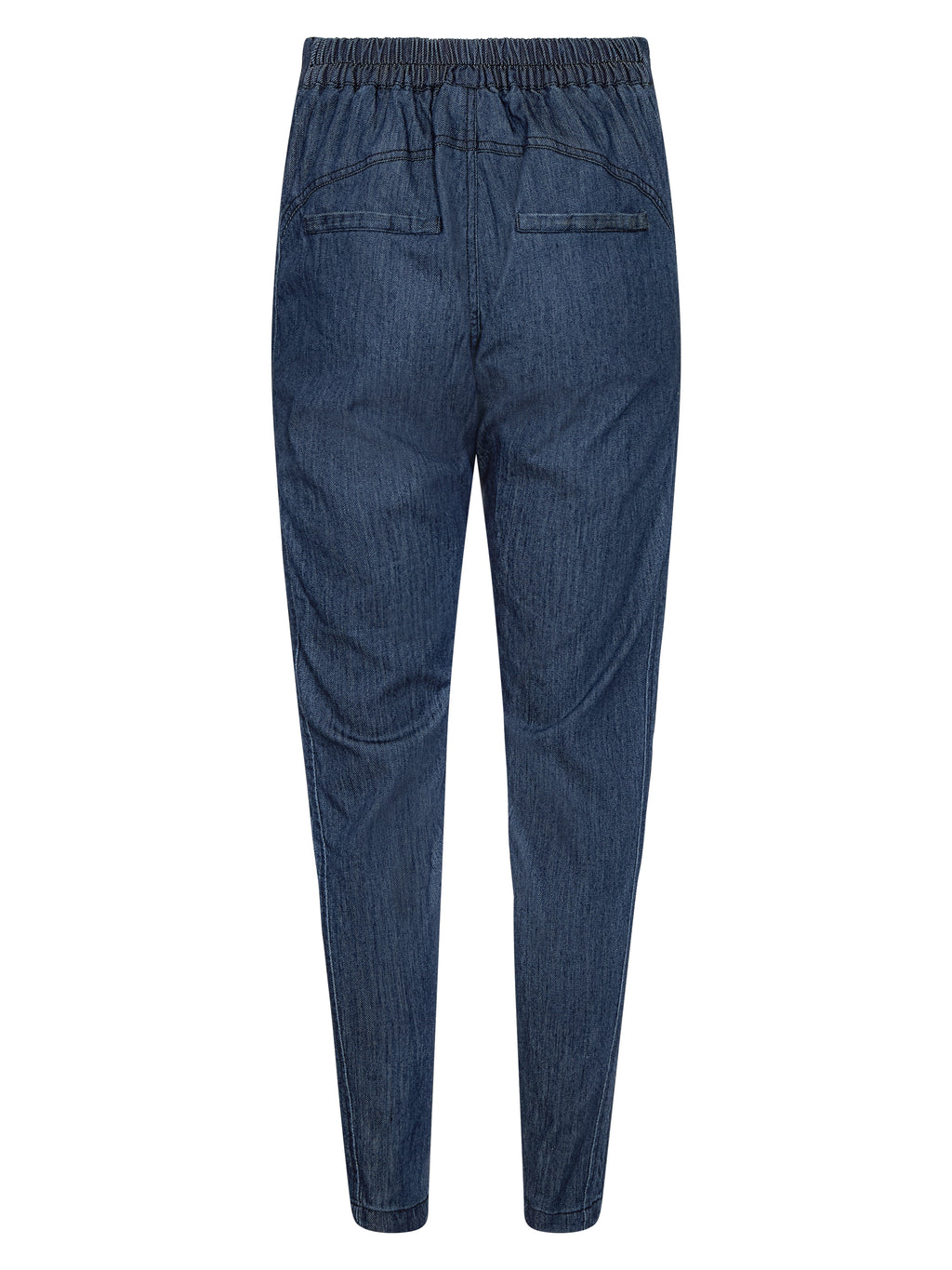 Disse denimbukser har et enkelt snit med smalle ben, der giver et pænt og afslappet look. Fortil er der en skrå detalje med knapper i taljen, som giver bukserne lidt ekstra kant, mens bagsiden er holdt klassisk og rolig. Bukserne er nemme at bruge i hverdagen og kan styles med en enkel top, skjorte eller strik, alt efter hvilket udtryk du ønsker.