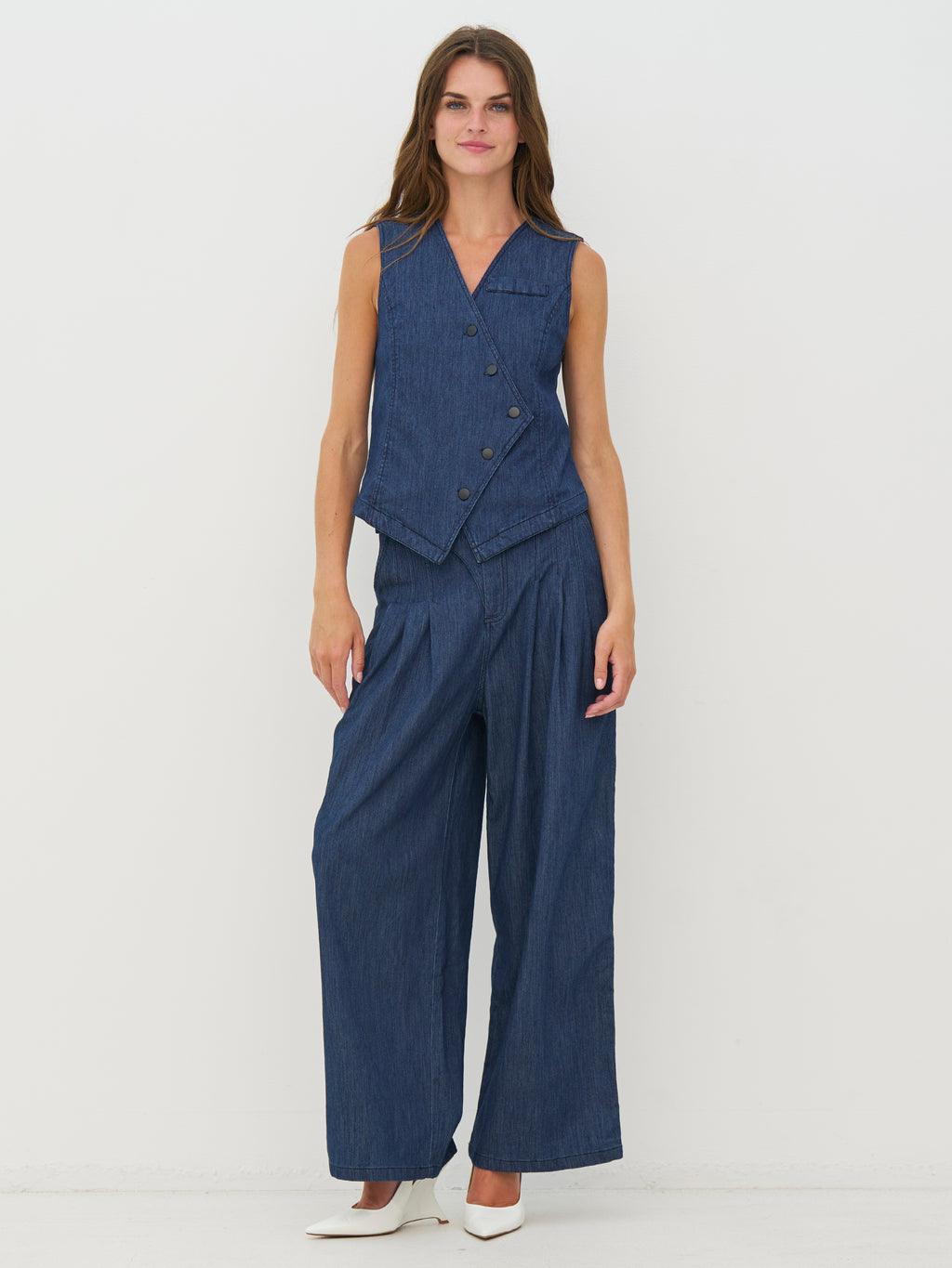 Denne denimvest har et rent og feminint udtryk med en skrå knaplukning, der giver et fint twist til det klassiske snit. Fronten har en diskret brystlomme, mens bagsiden er holdt enkel, så vesten falder pænt langs kroppen. Den er nem at bruge som et ekstra lag og kan styles over en skjorte eller en let top. Brug den sammen med matchende bukser eller jeans for et afslappet og sammenhængende look.