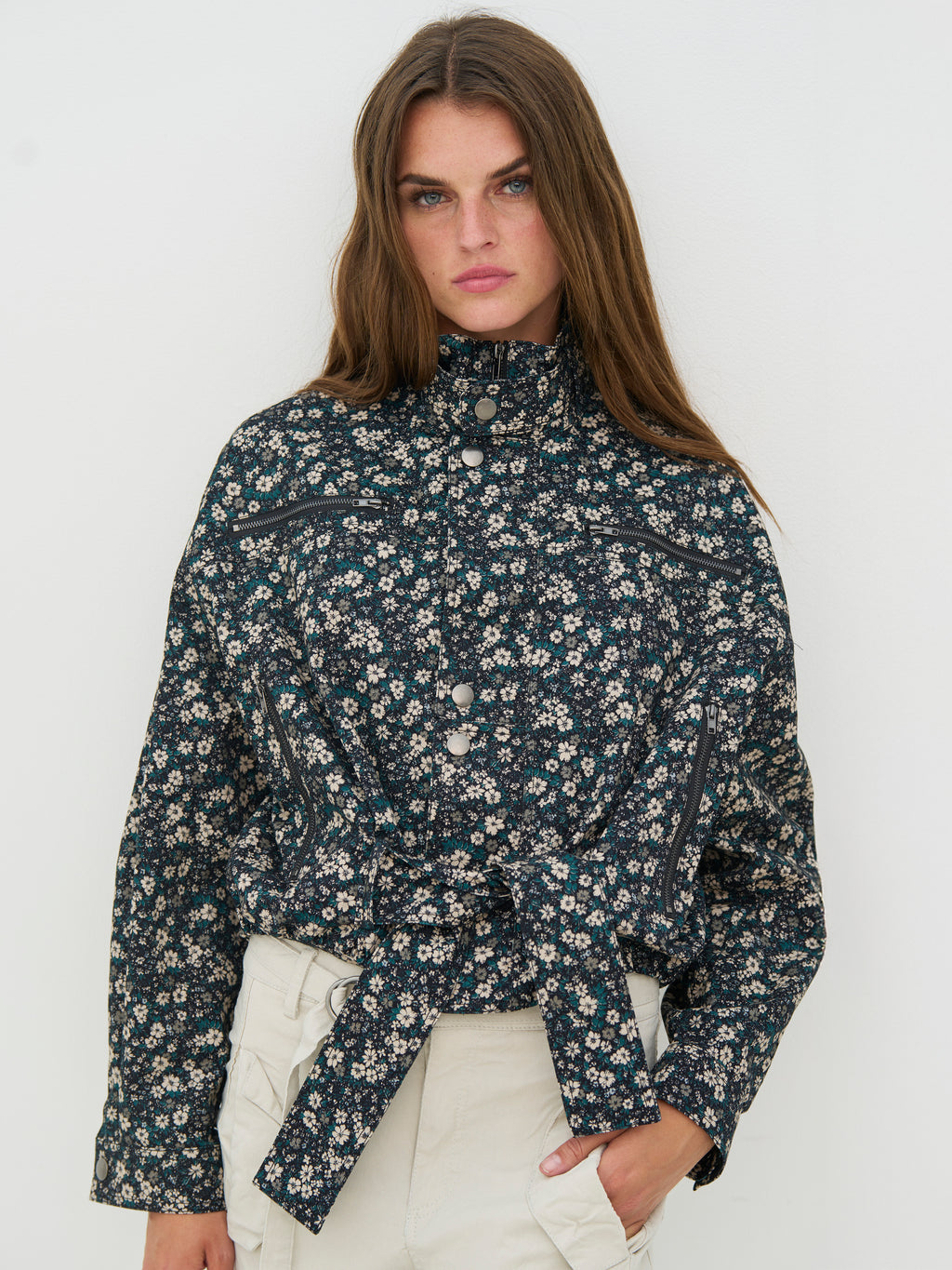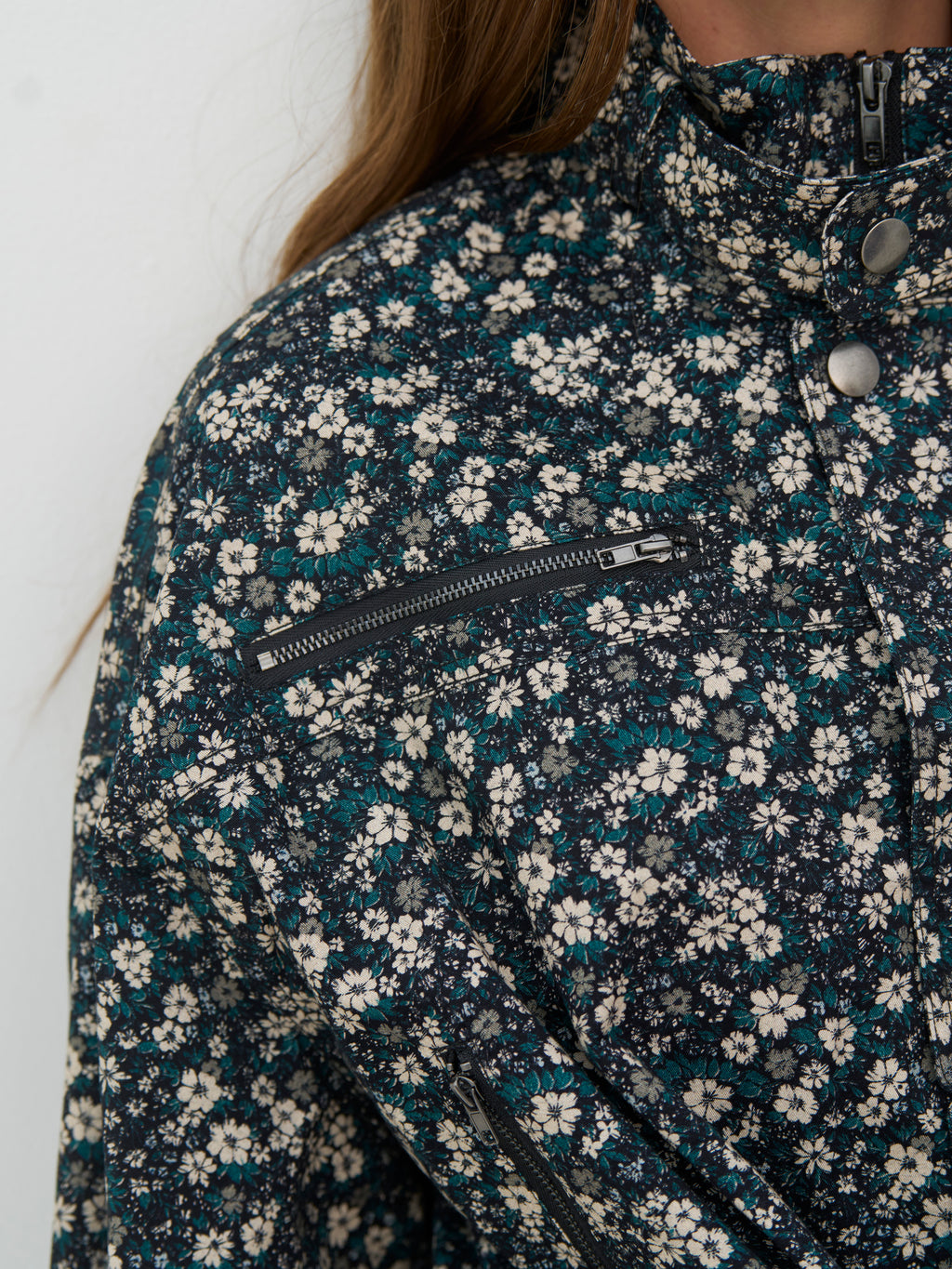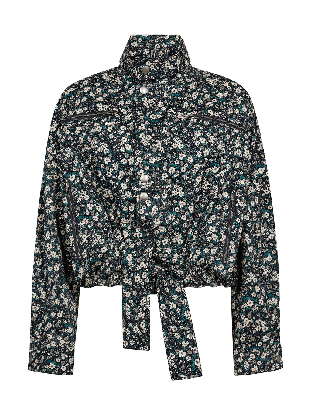 Denne blomstermønstrede jakke har et feminint, men cool udtryk med sine mange detaljer og den korte silhuet. Foran er jakken udstyret med lynlåse og trykknapper, der giver et moderne twist, mens det brede bindebælte i taljen gør det muligt at forme pasformen efter behov. Den høje hals fuldender looket og giver jakken et stilrent, sammenhængende udtryk. Style den med de matchende bukser for et sæt, eller brug den over neutrale styles for at lade mønstret træde frem.