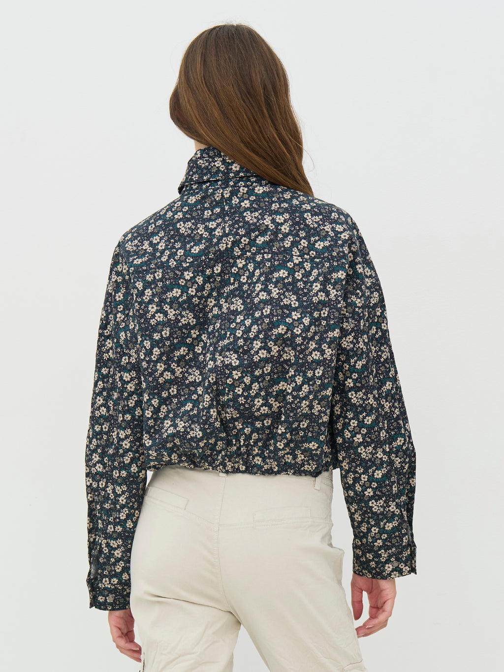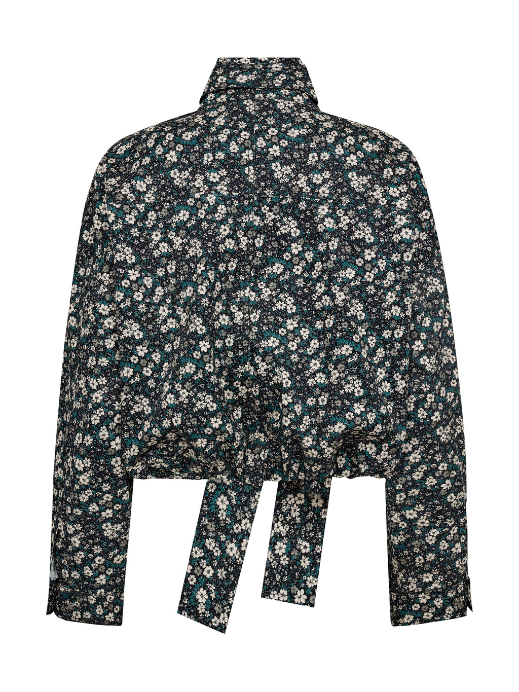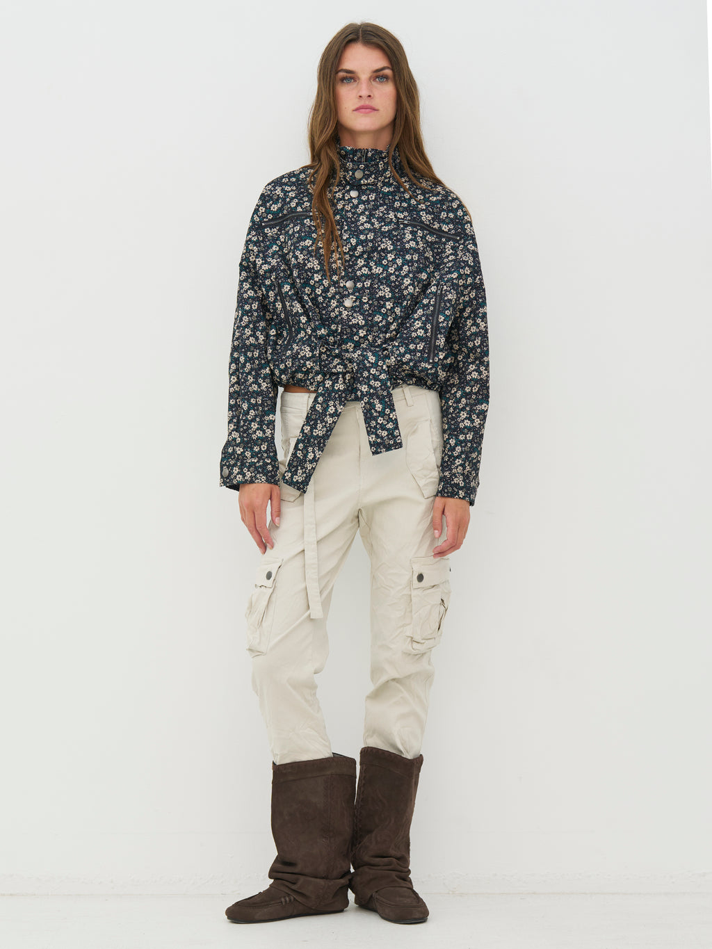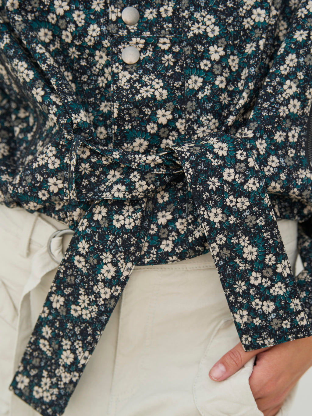 Denne blomstermønstrede jakke har et feminint, men cool udtryk med sine mange detaljer og den korte silhuet. Foran er jakken udstyret med lynlåse og trykknapper, der giver et moderne twist, mens det brede bindebælte i taljen gør det muligt at forme pasformen efter behov. Den høje hals fuldender looket og giver jakken et stilrent, sammenhængende udtryk. Style den med de matchende bukser for et sæt, eller brug den over neutrale styles for at lade mønstret træde frem.