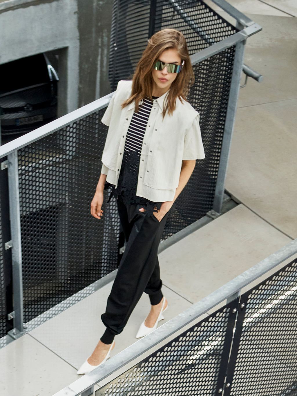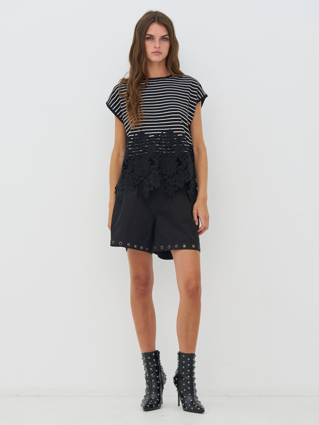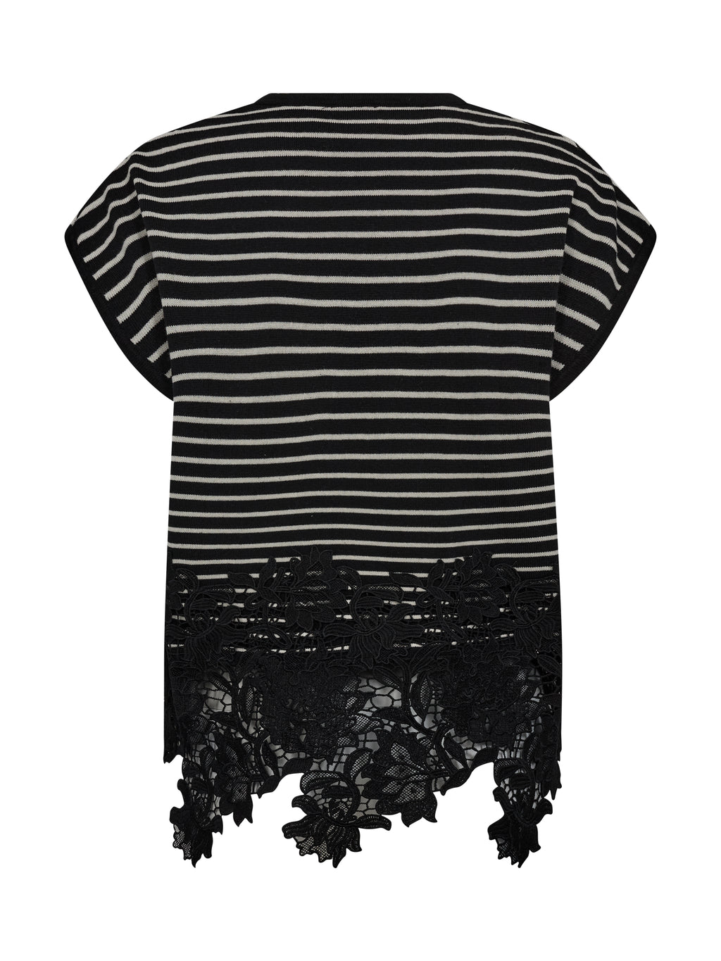 Denne strik T-shirt kombinerer et afslappet snit med fine detaljer. De klassiske striber giver et roligt udtryk, mens den dekorative blondekant nederst tilfører kontrast og lidt kant. Pasformen er lige med korte ærmer, hvilket gør den nem at style både til bukser og nederdele. En god balance mellem det enkle og det mere feminine – perfekt til både hverdag og mere styled looks.