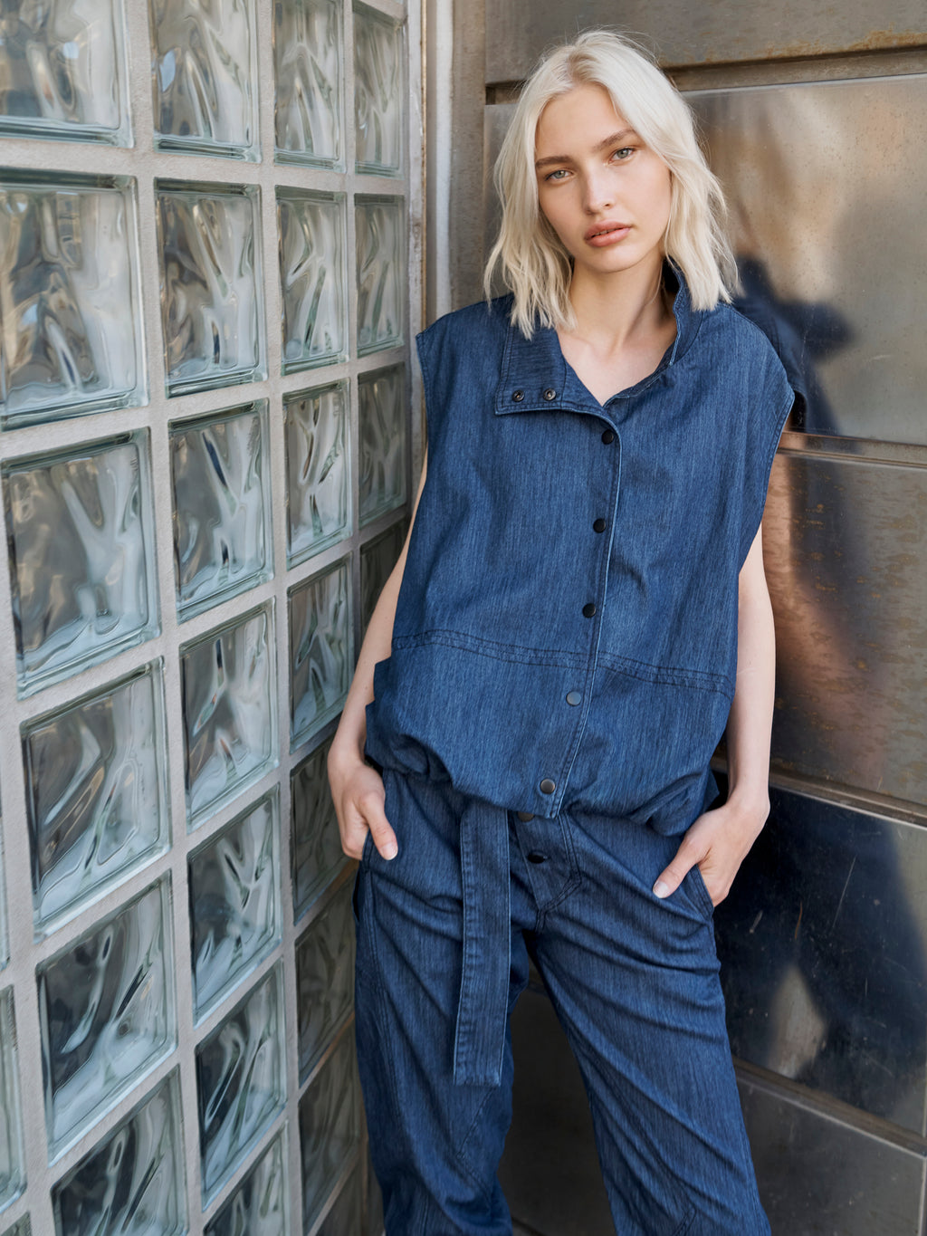 Denne denimstyle har et afslappet og cool udtryk med masser af bevægelse i pasformen. Den bløde denim med stretch gør den behagelig at have på hele dagen, mens elastikken forneden samler looket og giver en boxy silhuet. Det giver et moderne twist og gør stylen nem at bruge både lukket og åben – alt efter humør og styling. En enkel favorit, der fungerer godt lag-på-lag og kan dresses op eller ned.