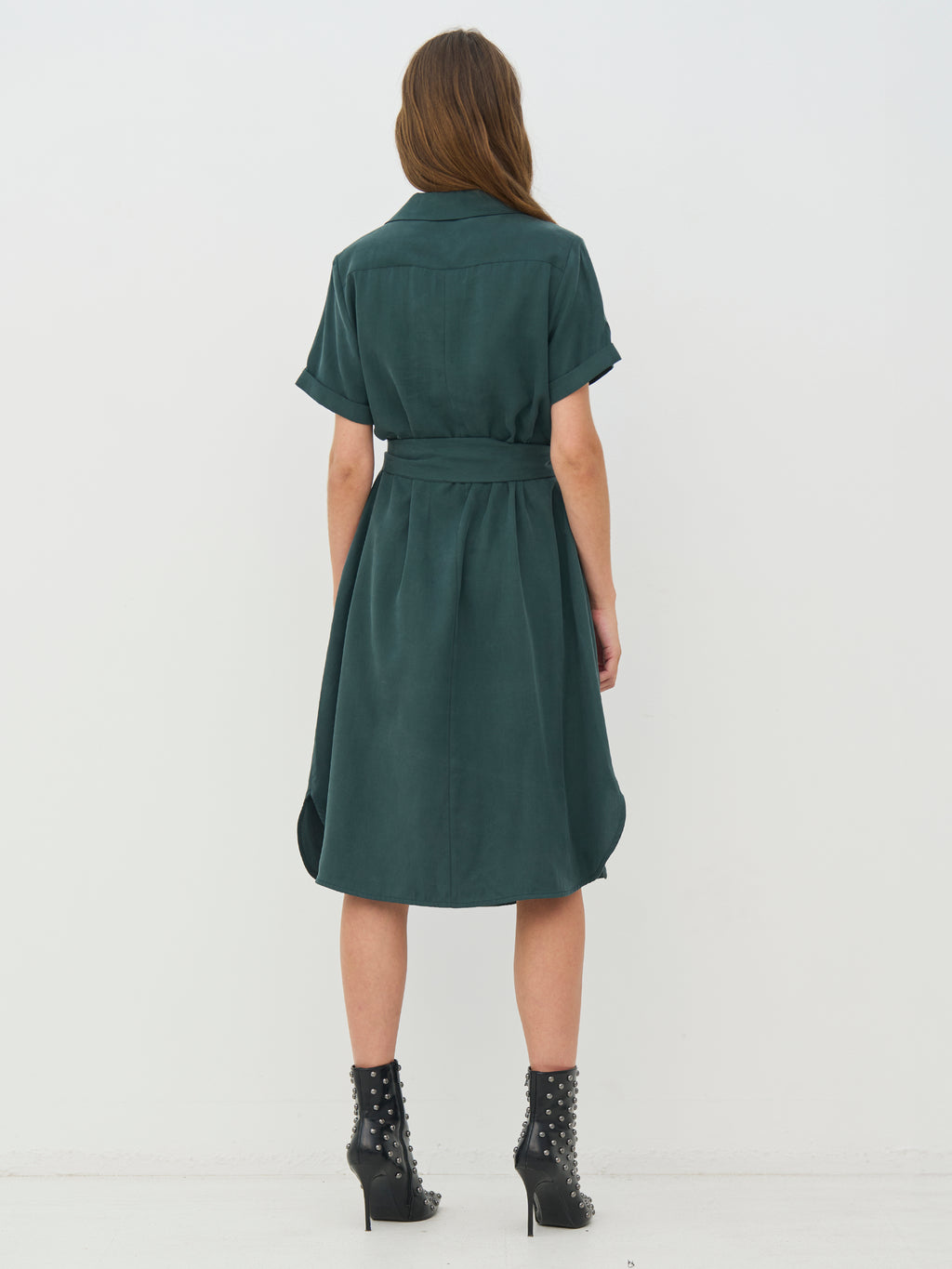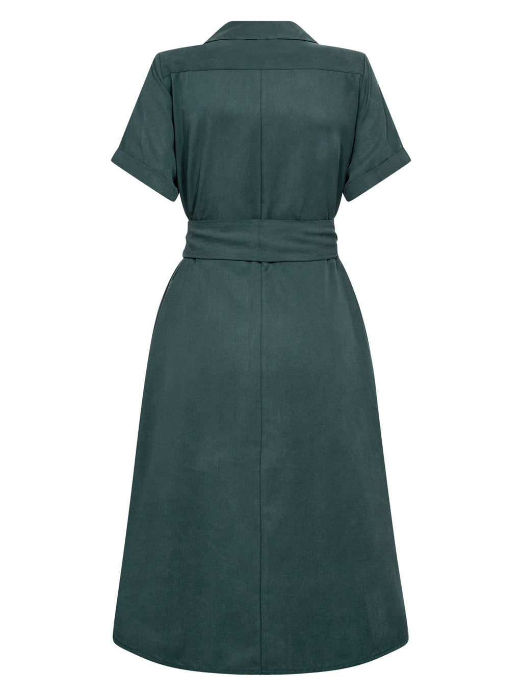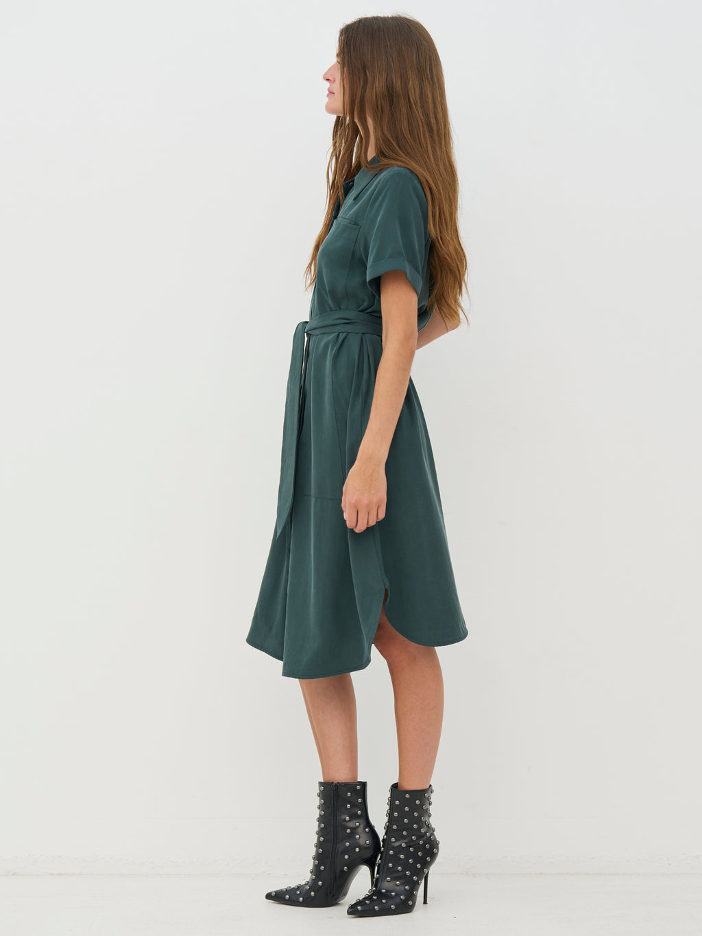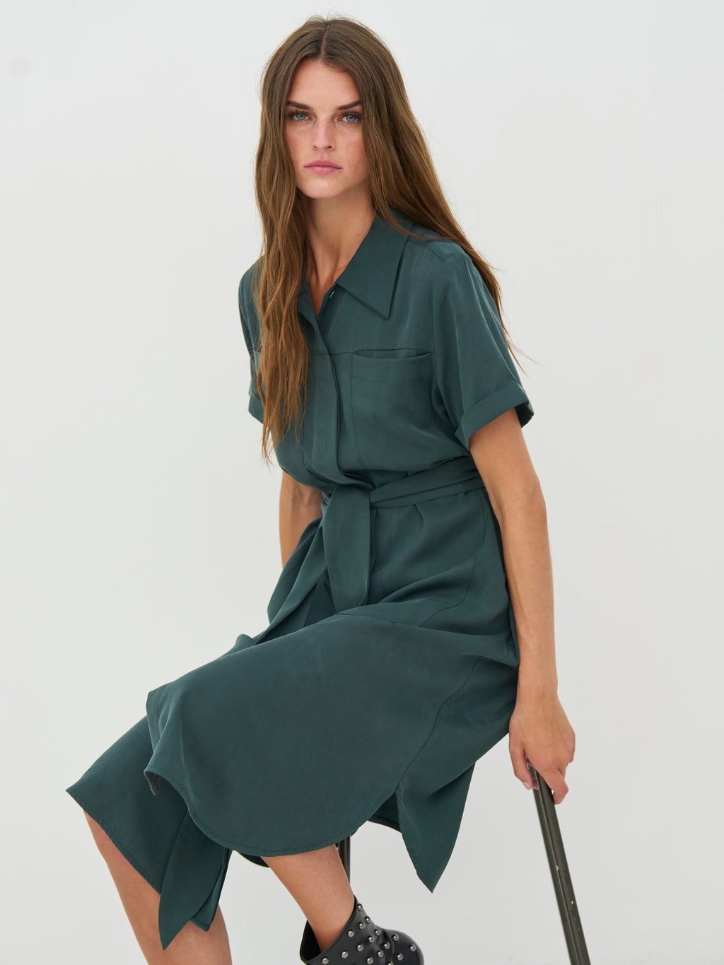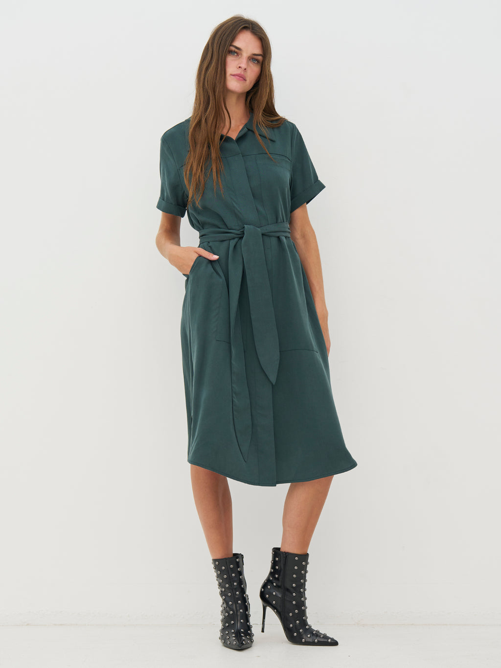 Denne kjole har et elegant og afslappet udtryk med sin skjortekrave, 3/4-lange ærmer og rene linjer. Det brede bindebælte i taljen giver mulighed for at forme silhuetten, mens de fine læg foran tilfører let bevægelse til skørtet. Bagpå har kjolen en blød faldende pasform og små slidser i siderne, som giver ekstra komfort. Style den med sandaler for et afslappet look eller med støvler for et mere markant udtryk.