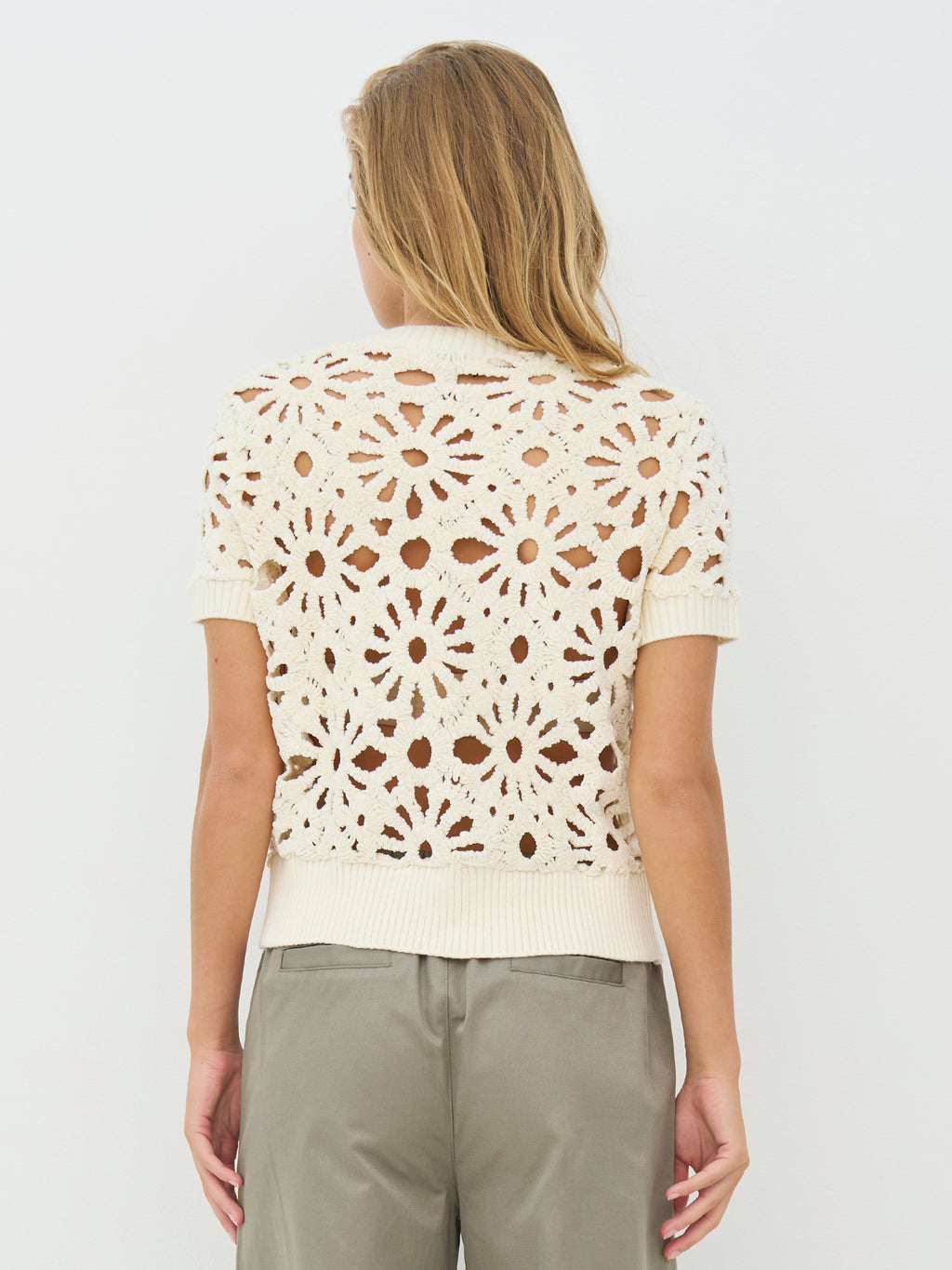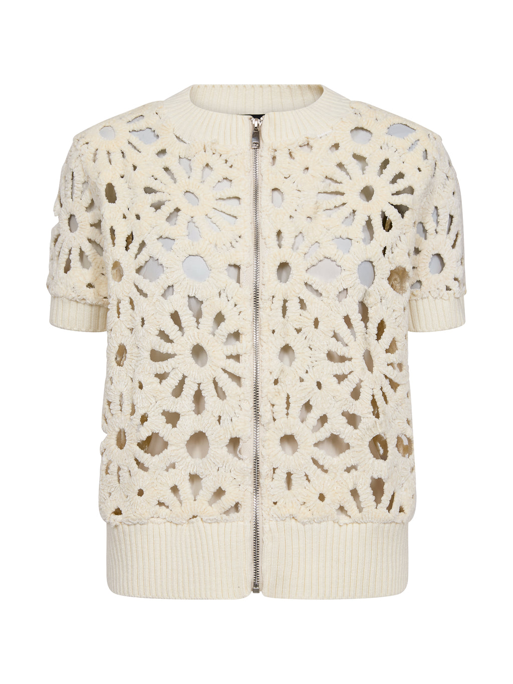 Denne korte jakke/cardigan har et blomstret hulmønster, som giver et let og dekorativt udtryk. Den lukkes med en gennemgående lynlås foran og har korte ærmer samt en enkel afslutning ved hals og bund. Bagsiden følger samme mønster og giver et roligt helhedsindtryk. Style den over en enkel top eller kjole, eller brug den sammen med løse bukser for et afslappet og anvendeligt hverdagslook.
