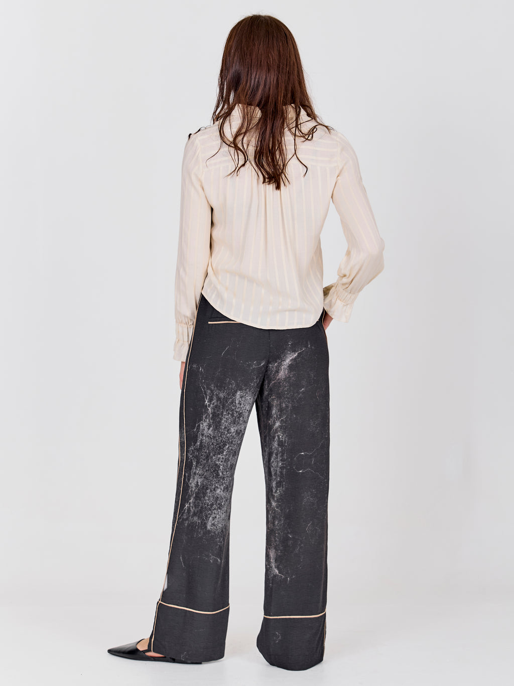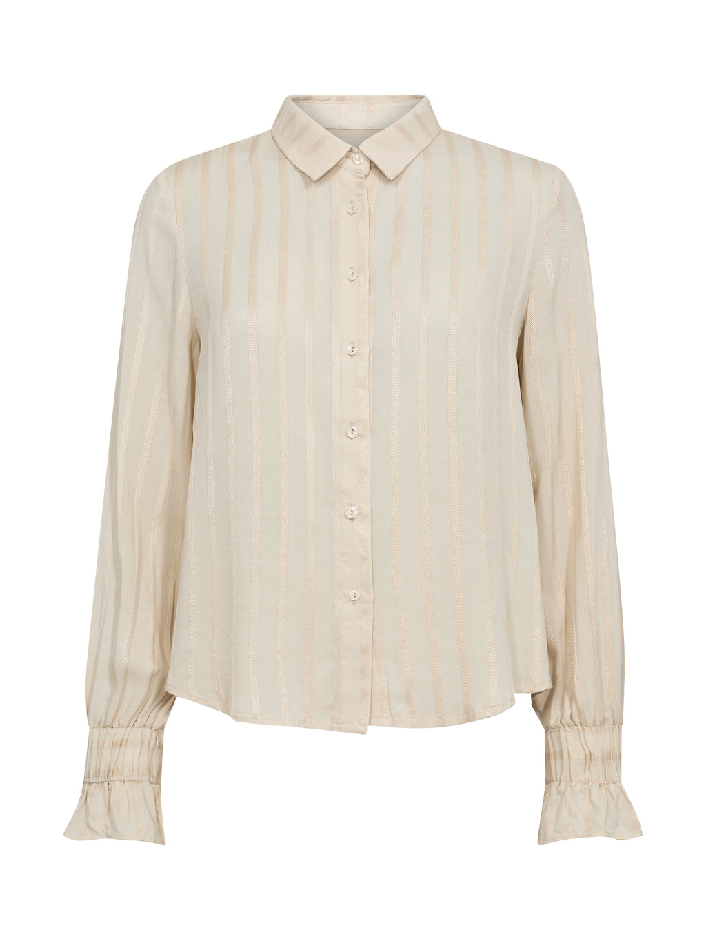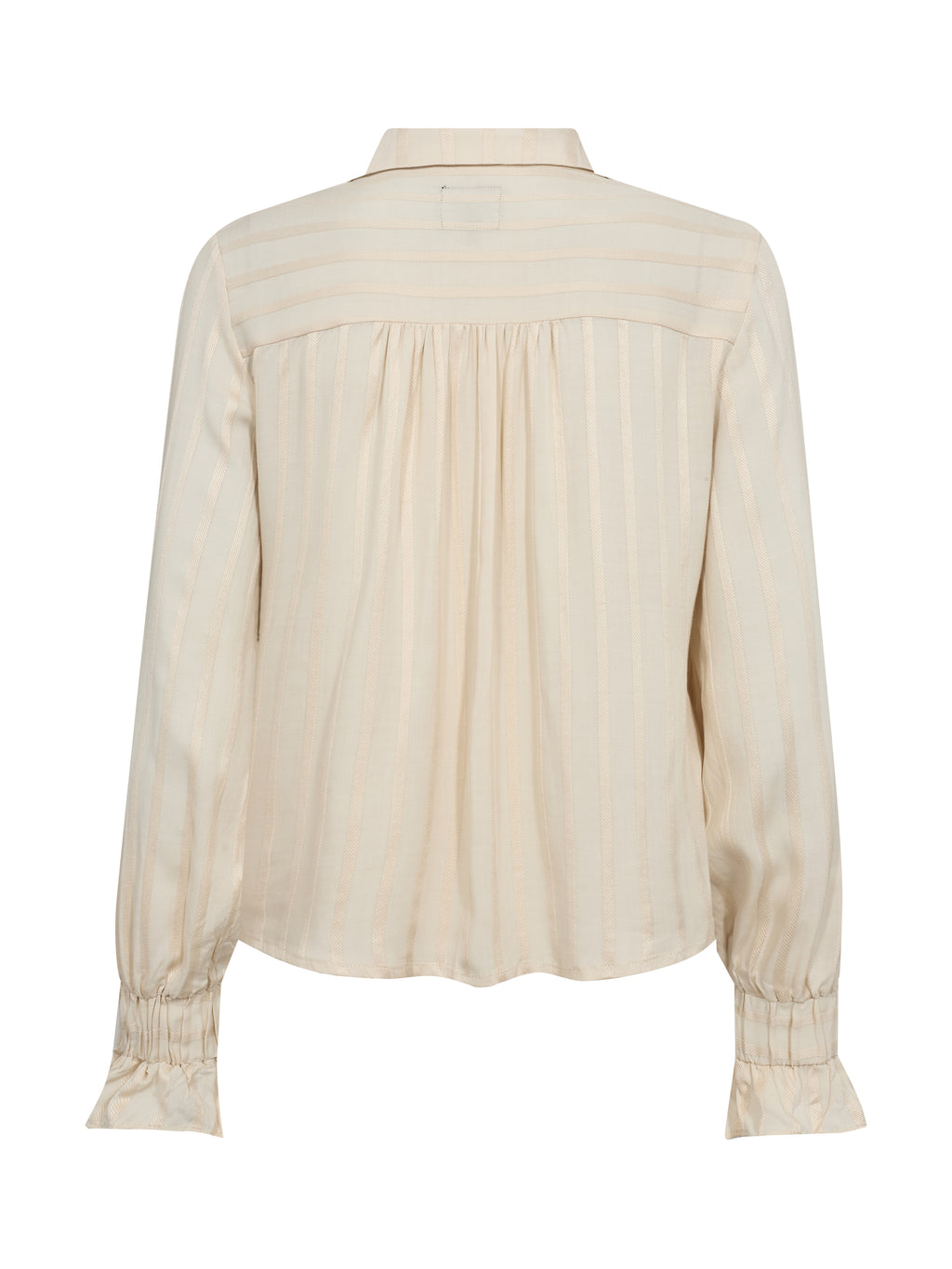 Denne skjorte har et let og feminint udtryk med klassisk krave og knaplukning foran. De diskrete striber giver stoffet dybde, mens de lange ærmer afsluttes med elastik ved manchetterne, som skaber en blød og behagelig pasform. Foran er designet enkelt, og bagpå falder skjorten roligt ned langs ryggen. Den er nem at style både lukket og let åben – perfekt til både hverdag og mere pæne anledninger.