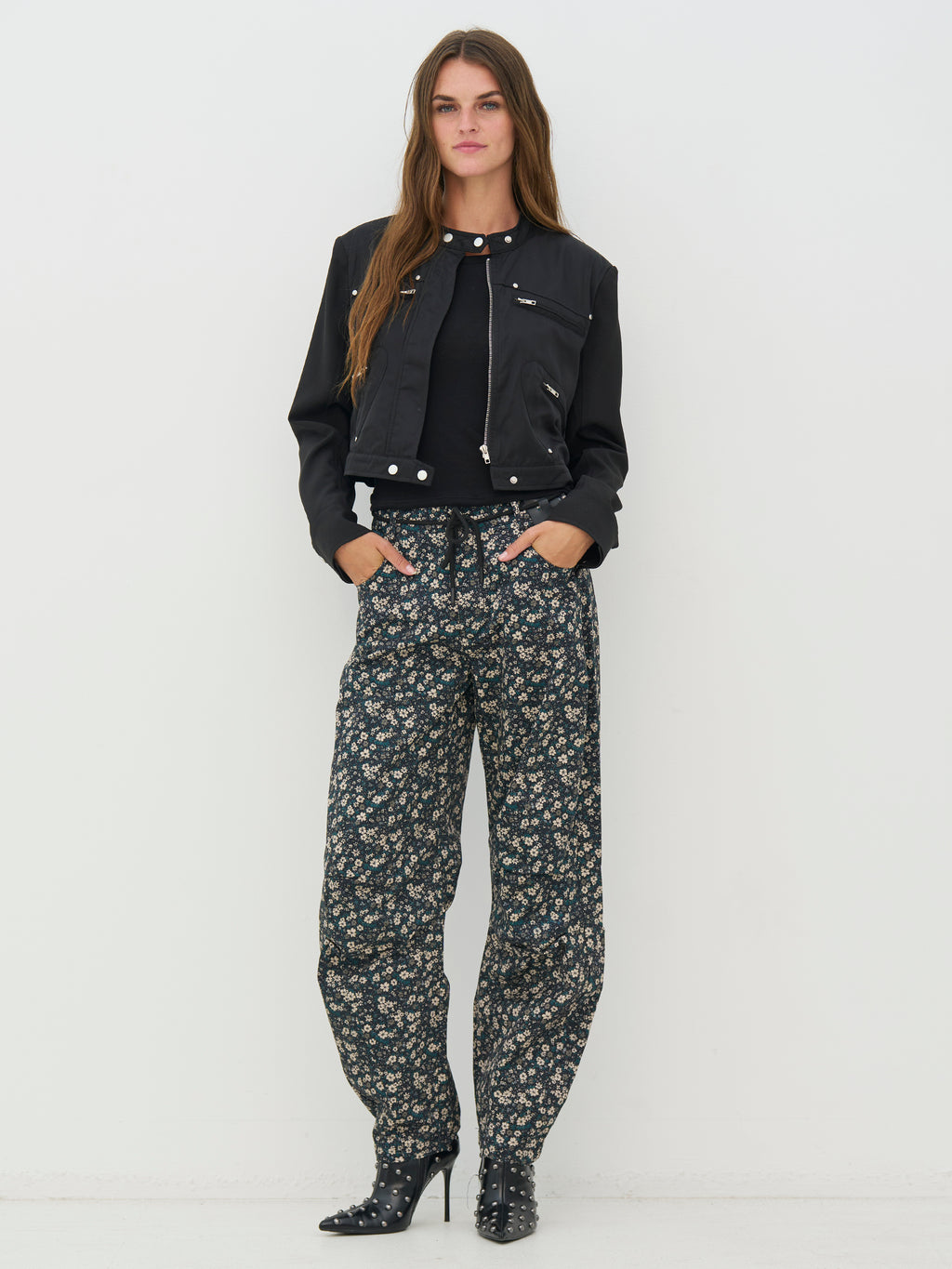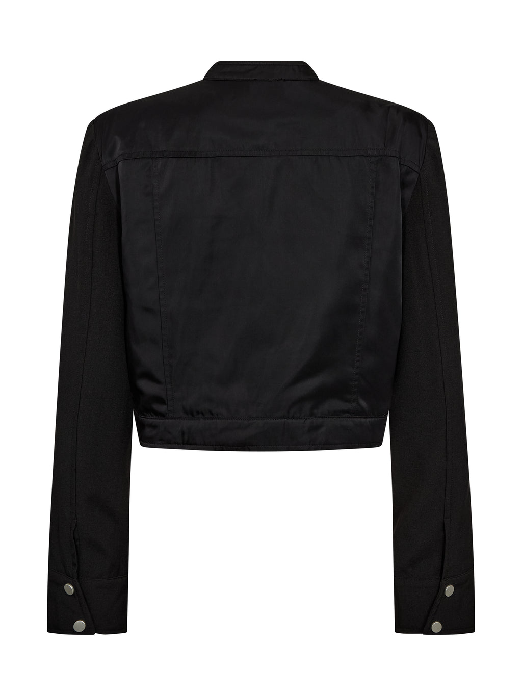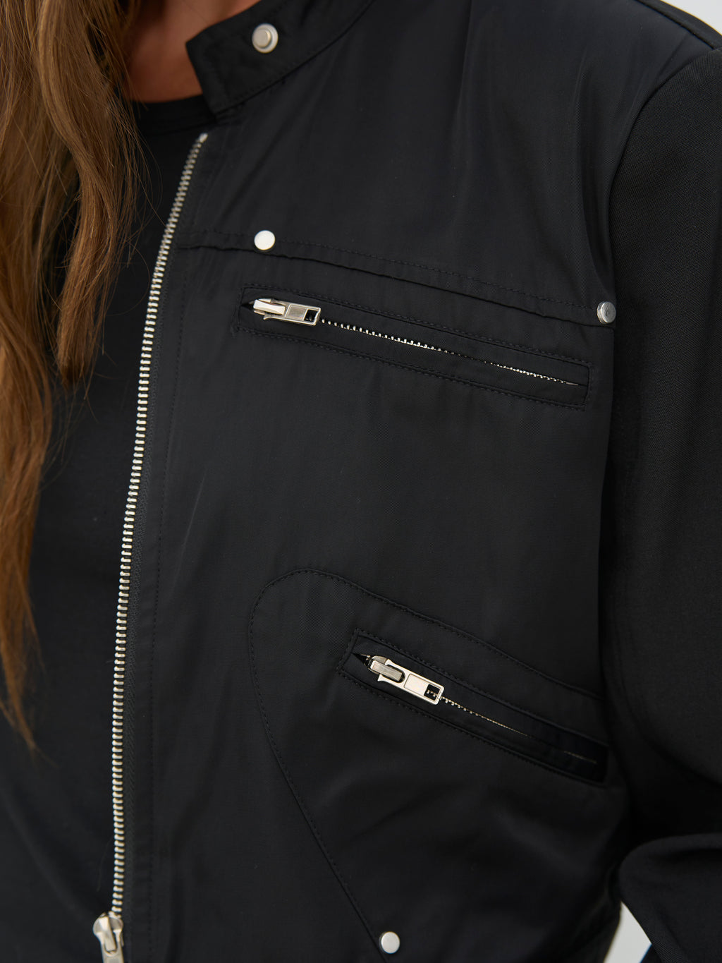 Denne jakke har et moderne, cool udtryk med sin korte længde og kombinationen af matte og glatte materialer. Foran har den flere lynlåse og trykknapper, der tilføjer både funktion og karakter til designet. Den høje hals med trykknap giver et skarpt udtryk, mens de lange ærmer afrunder looket på en klassisk måde. Bagpå holdes jakken enkel med rene linjer. Style den over en top, kjole eller let strik for et stilfuldt hverdagslook med kant.