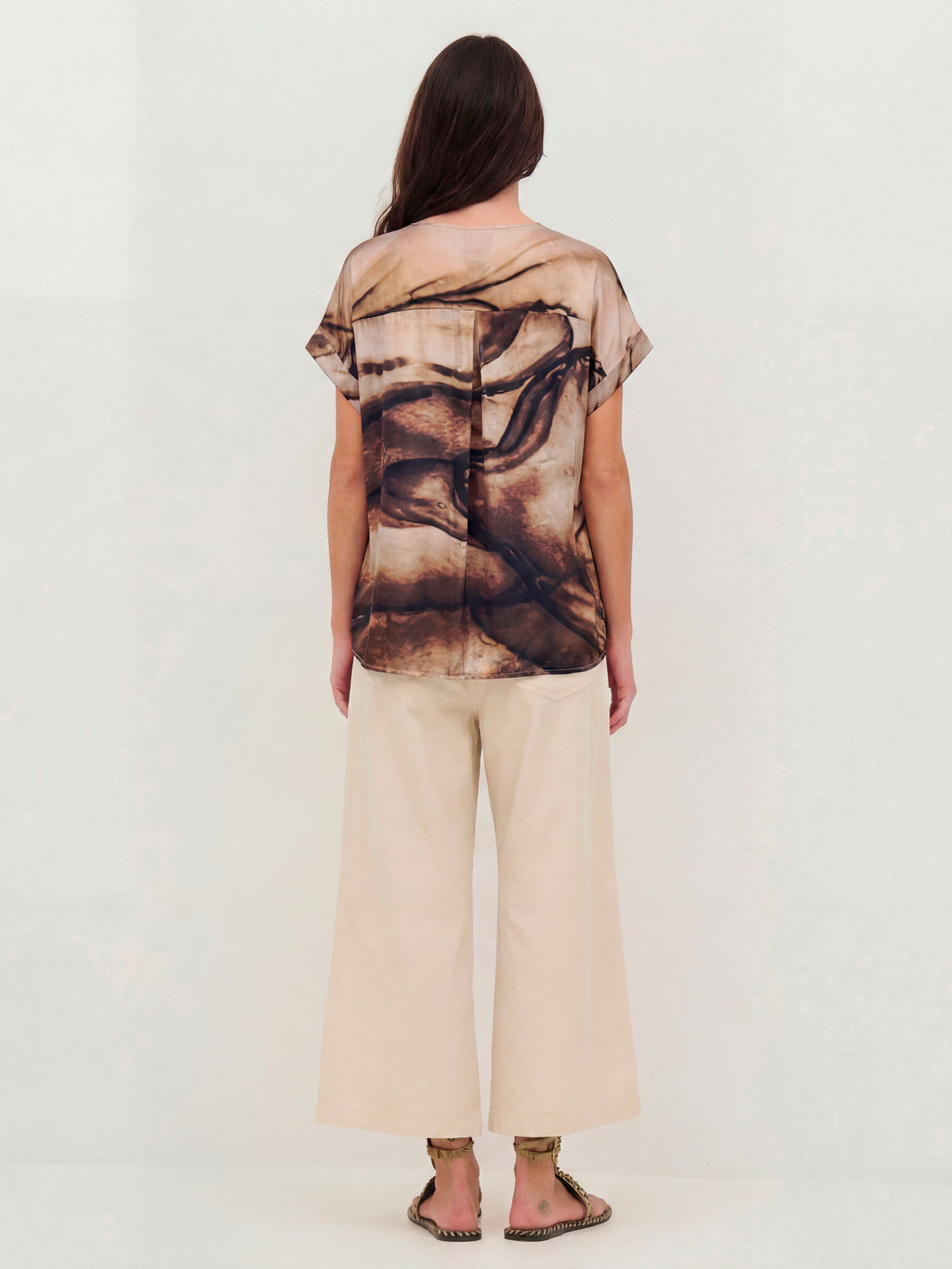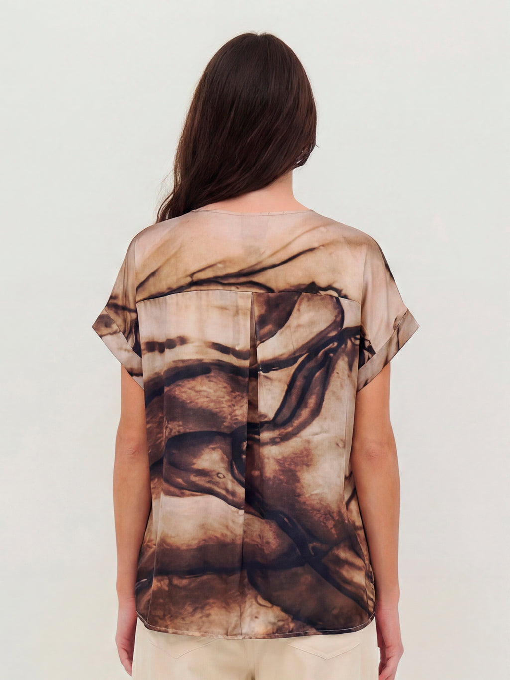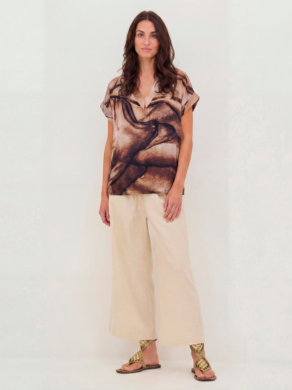 Denne bluse har et enkelt snit med V-udskæring og korte ærmer, som giver et afslappet og anvendeligt udtryk. Printet er både foran og bagpå, og tilfører karakter og kant. Pasformen er lige, så blusen falder pænt på kroppen og er nem at style til både bukser og shorts. Brug den alene til hverdag eller sammen med en let jakke, hvis du ønsker et gennemført look.
