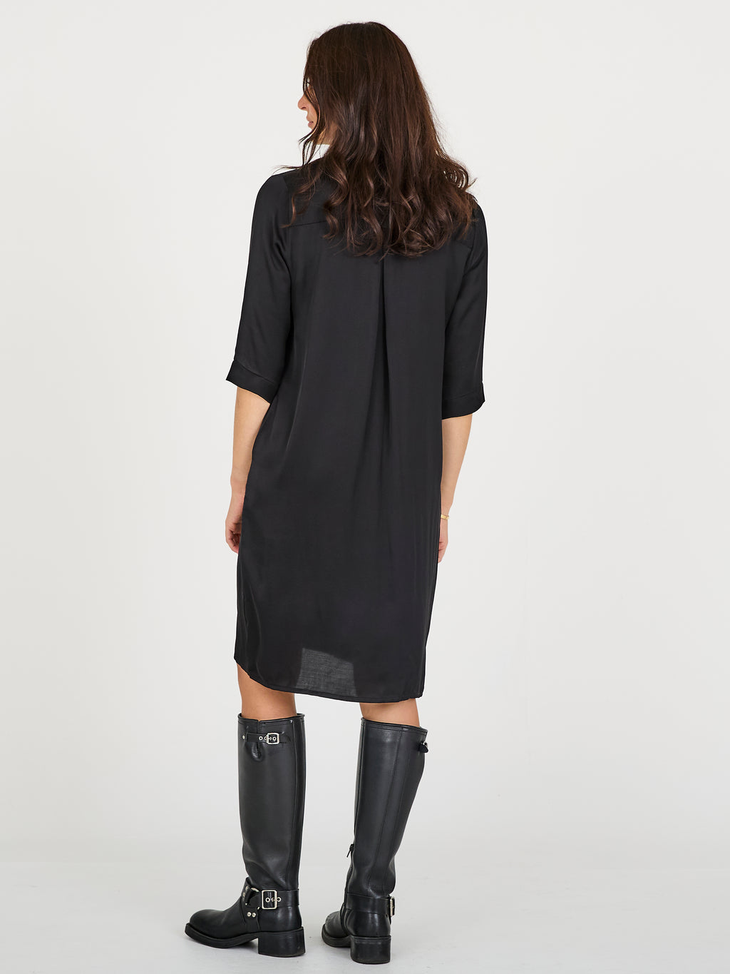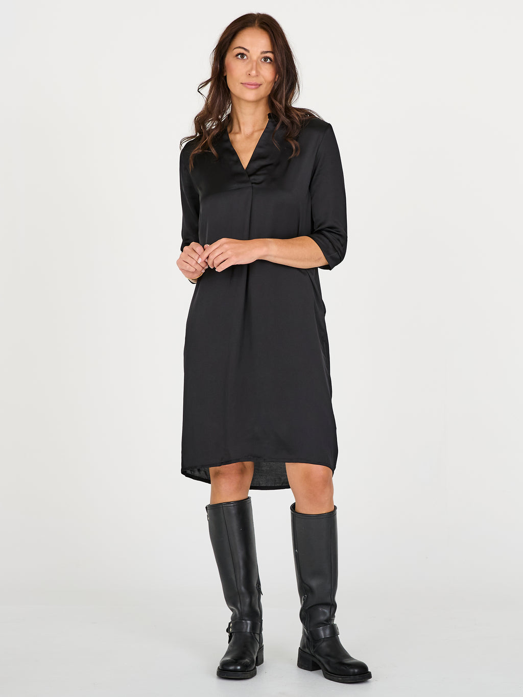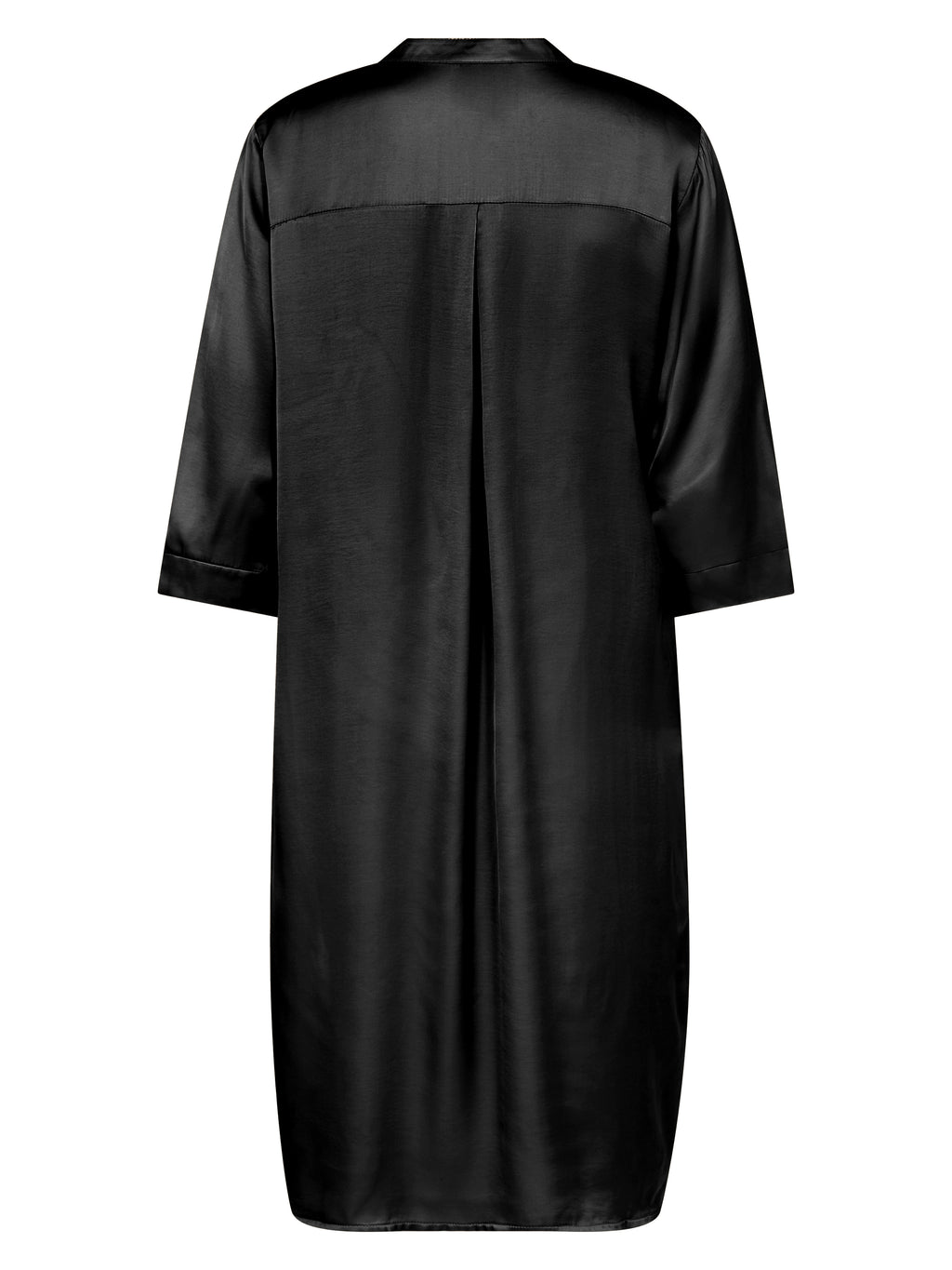 Skab et elegant og ubesværet udtryk med denne løstsiddende kjole i et glat, let skinnende materiale. Den har en enkel V-udskæring og krave med kinainspireret snit, samt 3/4-lange ærmer, der understreger det minimalistiske design. En diskret læg i ryggen giver ekstra bevægelsesfrihed og en smuk fald.
