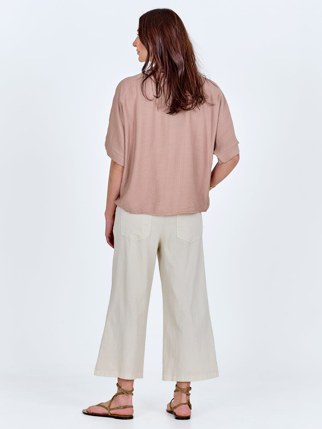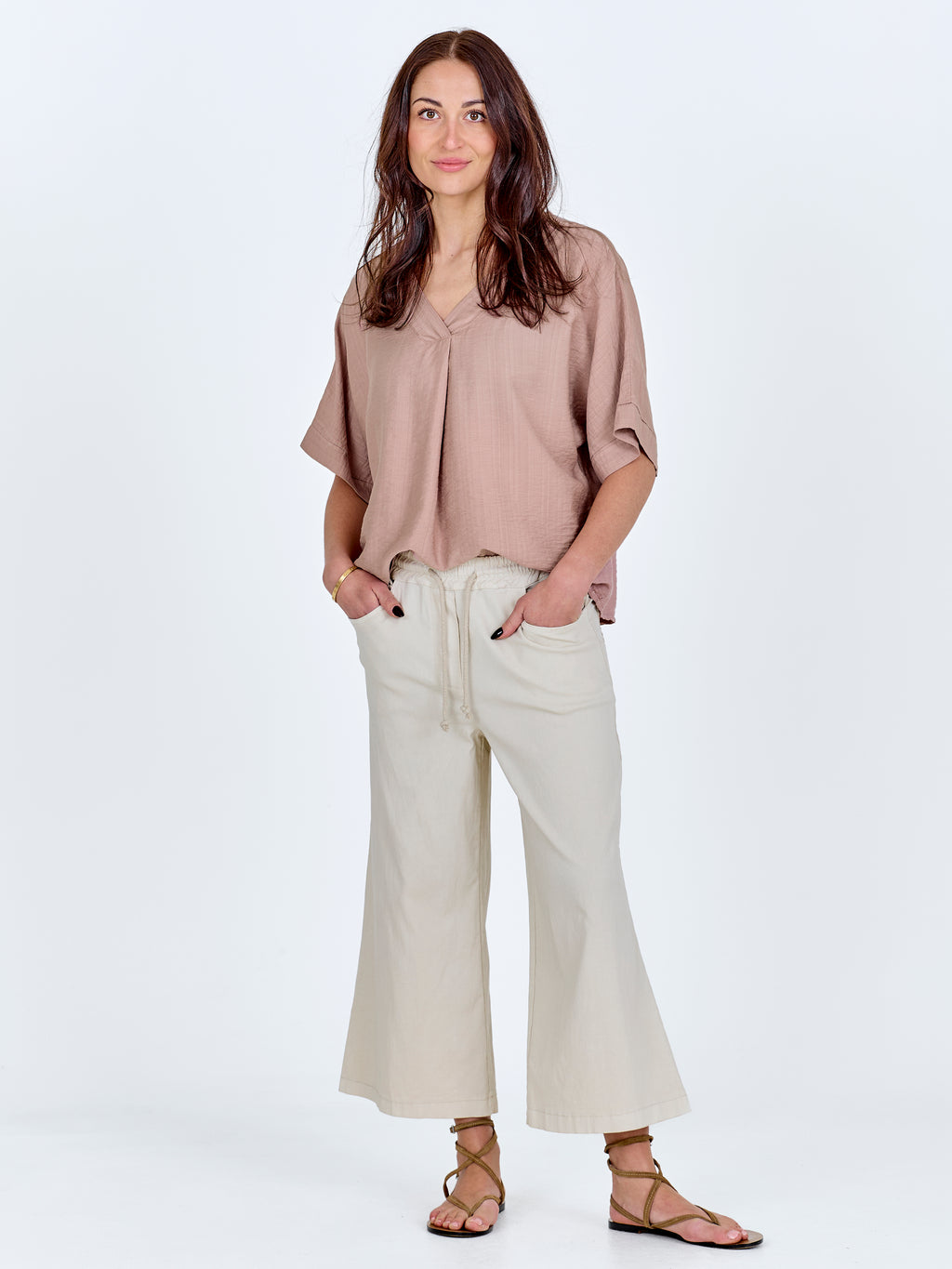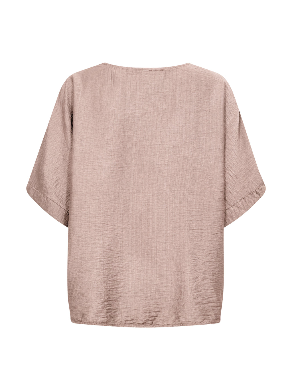 Denne luftige bluse forener komfort og enkelthed med sit let strukturerede materiale og afslappede pasform. Den har korte, løstsiddende ærmer og en V-udskæring med en dekorativ fold foran, som tilføjer et blødt fokuspunkt til designet. Den brede ærmekant giver blusen et let løft og afrunder det afslappede look.