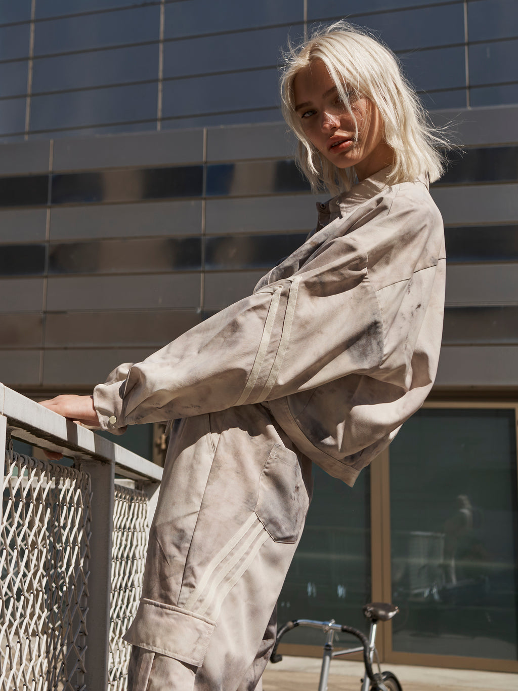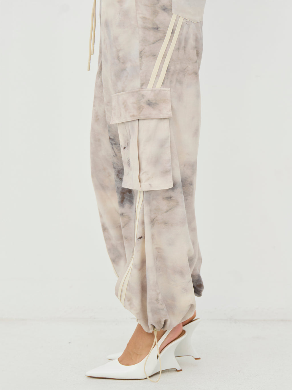 Disse bukser har en afslappet pasform med volumen i benene og elastik samt snøre i taljen, som gør dem nemme at justere. De store cargolommer på siderne tilfører et cool udtryk, mens snøredetaljen ved anklerne giver mulighed for at tilpasse faconen. Fronten er enkel, og bagsiden følger samme rolige linje. Style bukserne med en enkel top eller skjorte og eventuelt den matchende overdel for et afslappet, men gennemført hverdagslook.