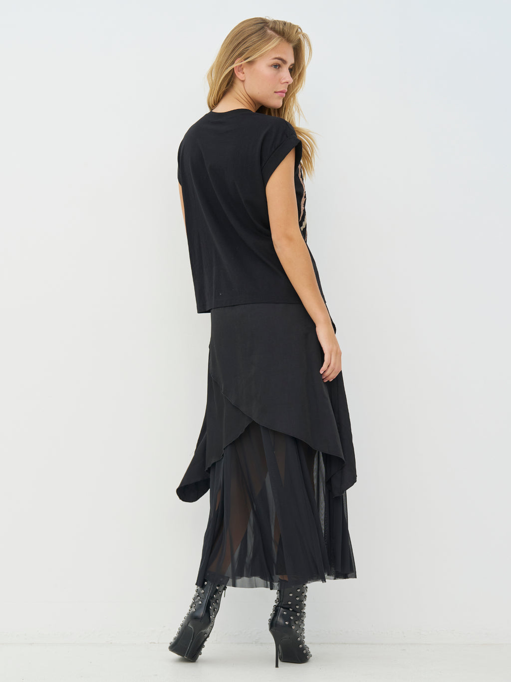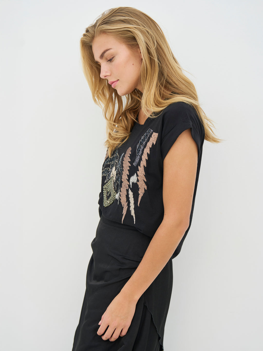 Denne t-shirt har et enkelt snit med korte ærmer og rund hals, men får sit særlige udtryk fra de detaljerede broderier og påsyede perler på fronten. Kombinationen af broderi og perler skaber dybde og giver et dekorativt fokus, uden at det bliver for tungt. Bagsiden er helt enkel og balancerer looket fint. Style t-shirten med jeans, løse bukser eller under en åben blazer, når outfittet gerne må have lidt ekstra karakter.