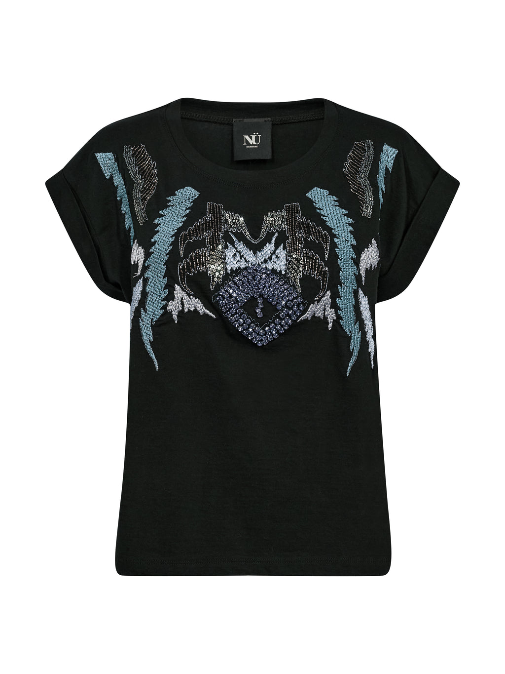 Denne t-shirt har et enkelt snit med korte ærmer og rund hals, men får sit særlige udtryk fra de detaljerede broderier og påsyede perler på fronten. Kombinationen af broderi og perler skaber dybde og giver et dekorativt fokus, uden at det bliver for tungt. Bagsiden er helt enkel og balancerer looket fint. Style t-shirten med jeans, løse bukser eller under en åben blazer, når outfittet gerne må have lidt ekstra karakter.