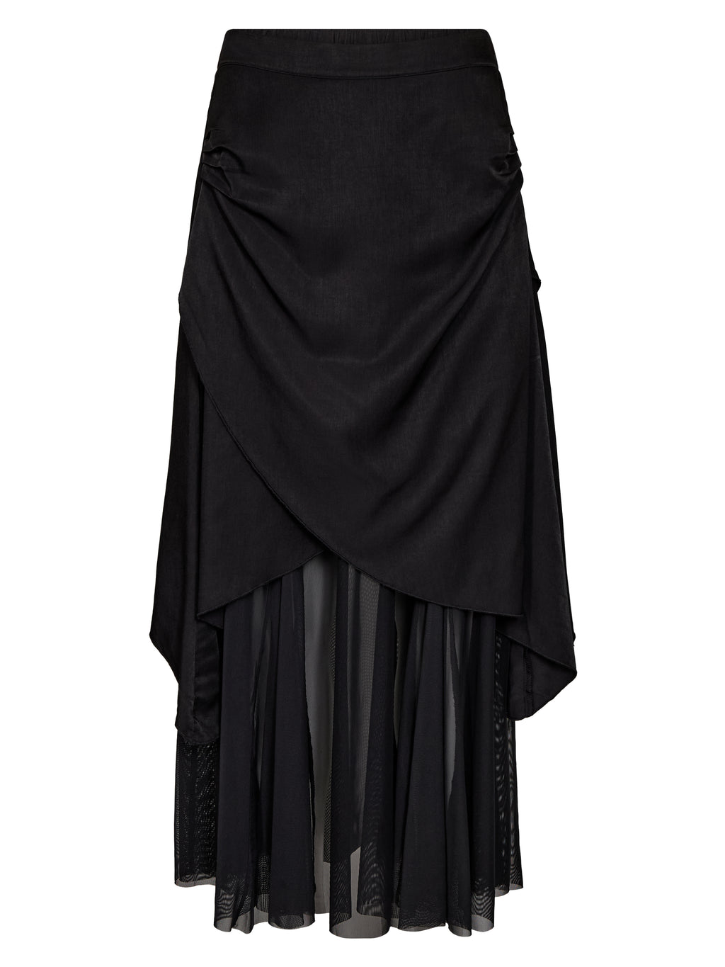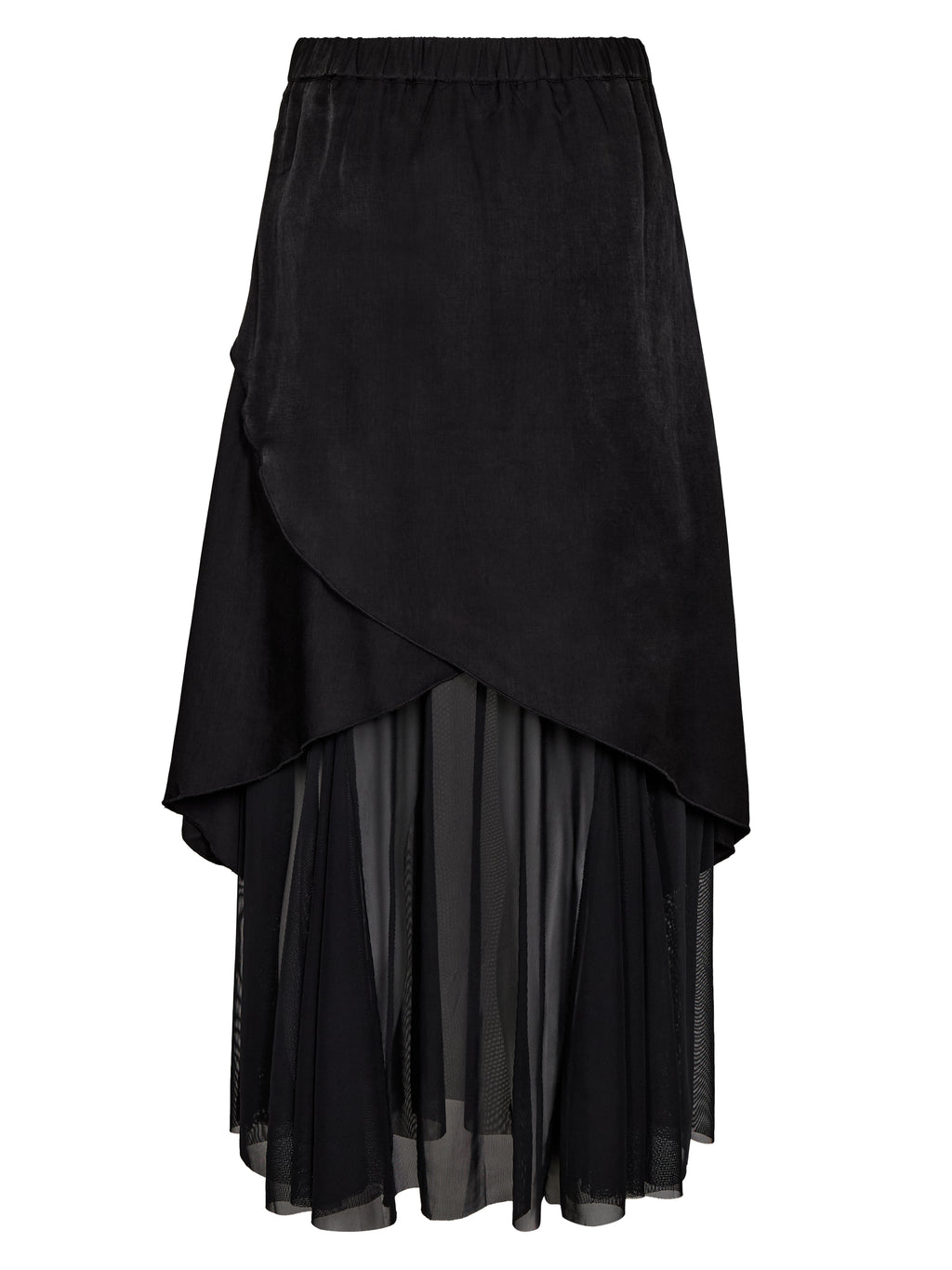 Denne nederdel har et elegant og feminint udtryk med et let, lagdelt look. Det øverste lag falder blødt og overlapper fronten, mens den let gennemsigtige underdel giver ekstra dybde og bevægelse. Taljen er enkel og behagelig, og pasformen falder flot omkring benene. En nederdel, der er nem at style både til hverdag med strik og støvler eller til mere festlige anledninger med en fin top.