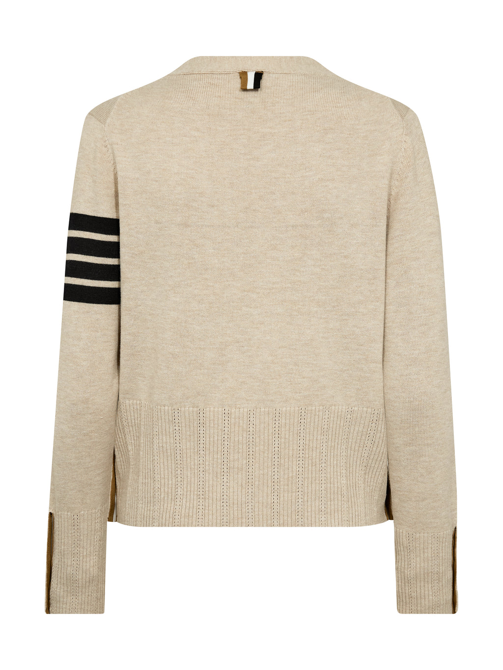 Denne cardigan har et klassisk og afslappet udtryk med V-udskæring og knaplukning fortil. Fronten er enkel, mens ærmet er dekoreret med kontraststriber, der giver et mere råt twist. Bagsiden er holdt rolig og understøtter det balancerede design. Knapperne i siderne giver mulighed for at justere pasformen, alt efter om de lukkes for et mere lige snit eller åbnes for at skabe en lille slids.