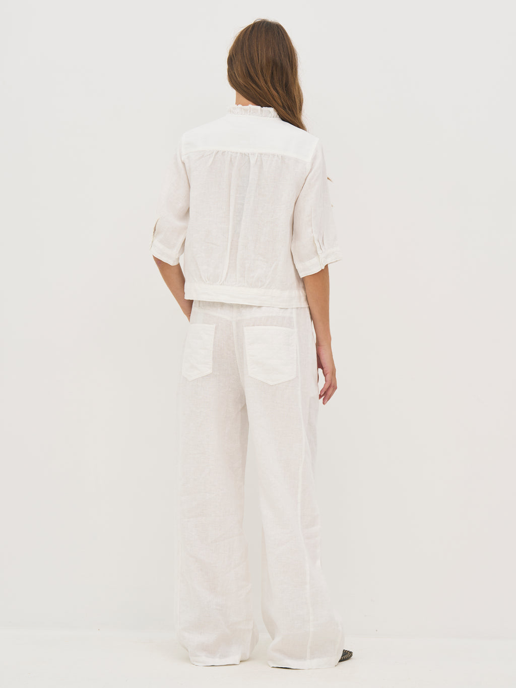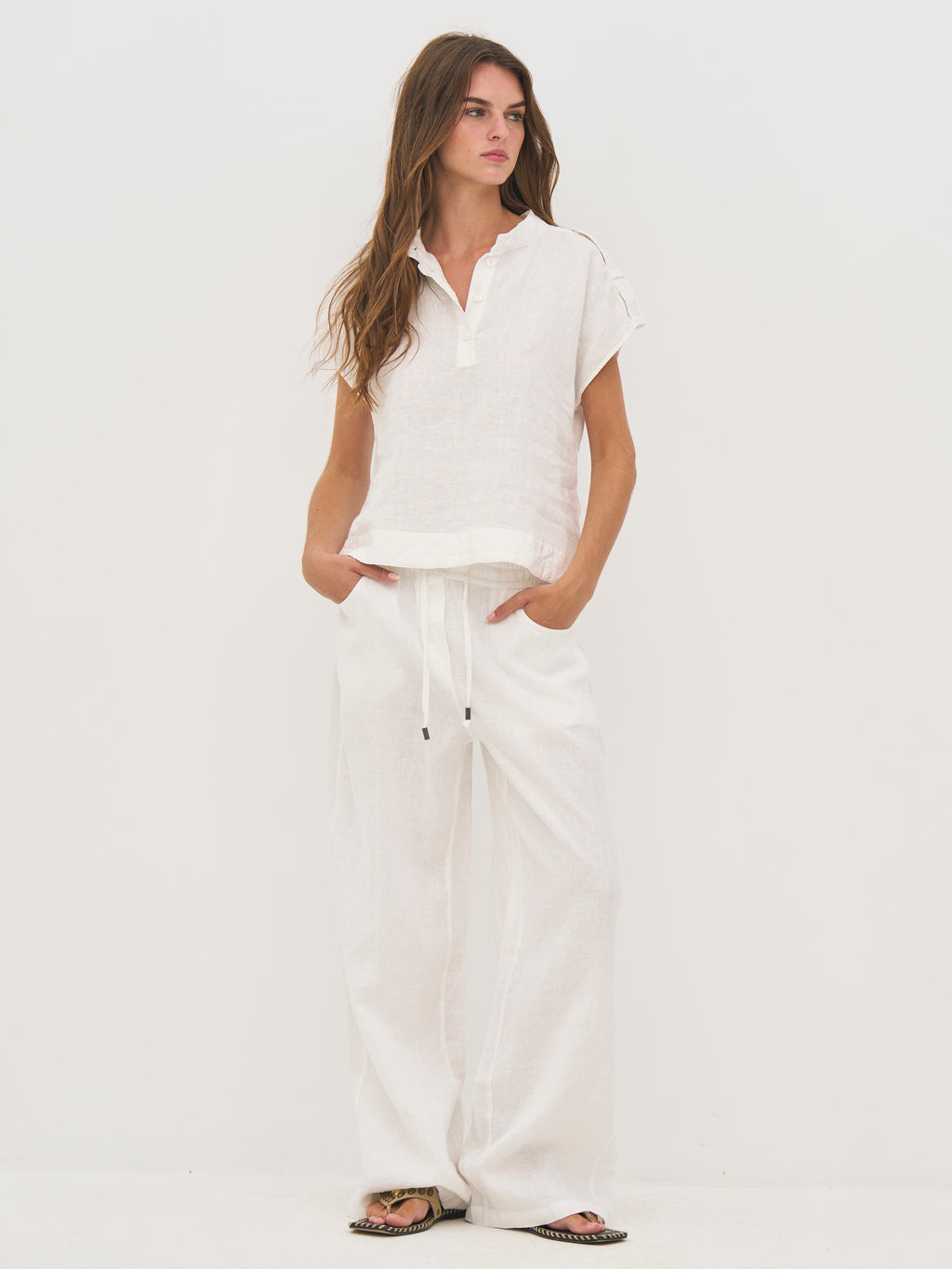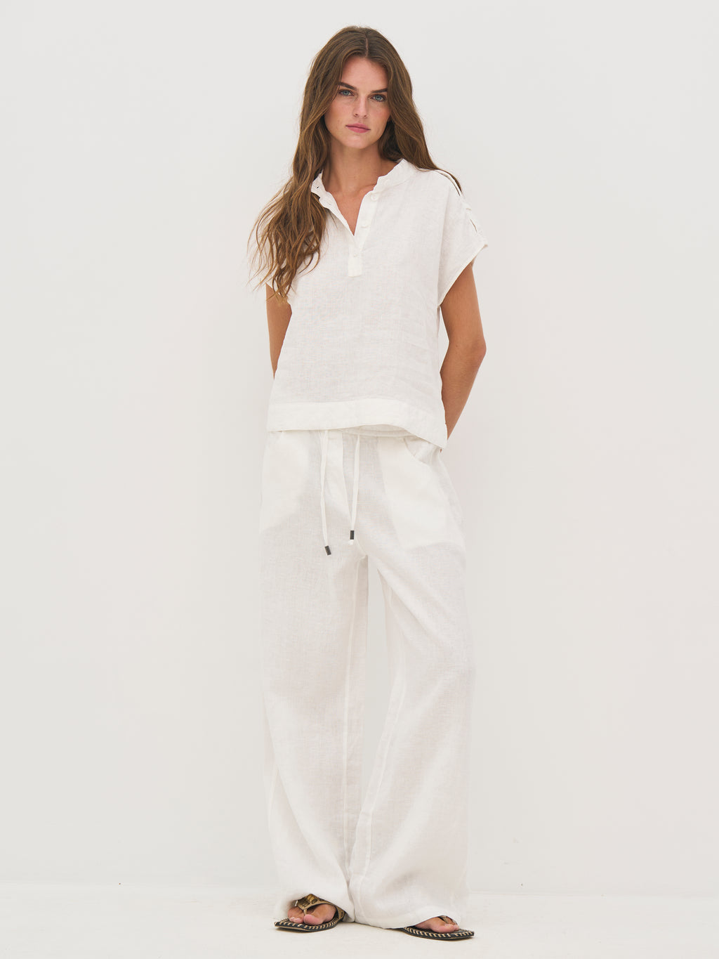 Disse bukser er lavet i hør, som gør dem lette og åndbare – ideelle til varme dage. De har en afslappet pasform med vidde ben, der falder løst og giver god bevægelsesfrihed. Taljen er elastisk og har snøre, så pasformen nemt kan justeres. De diskrete syningsdetaljer tilfører et roligt spil i overfladen, mens bagtil holdes designet enkelt.