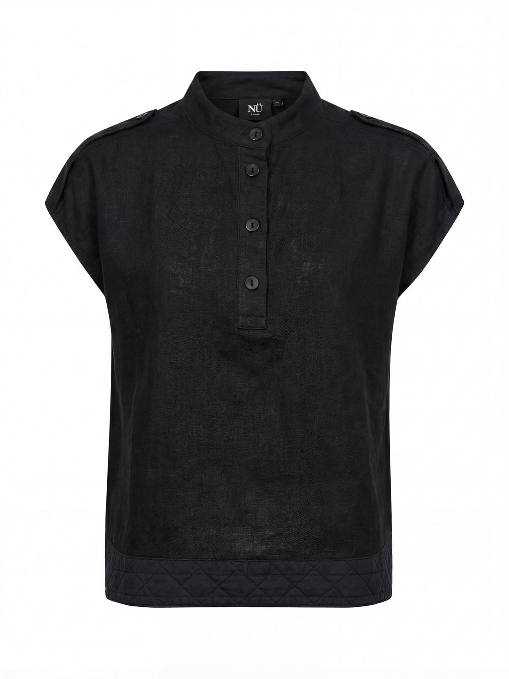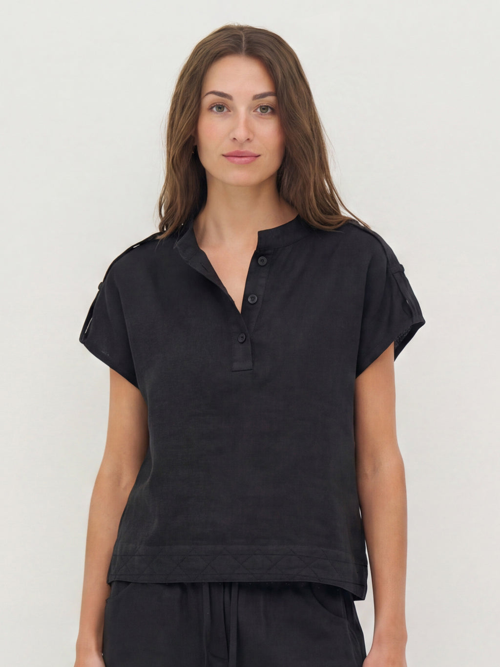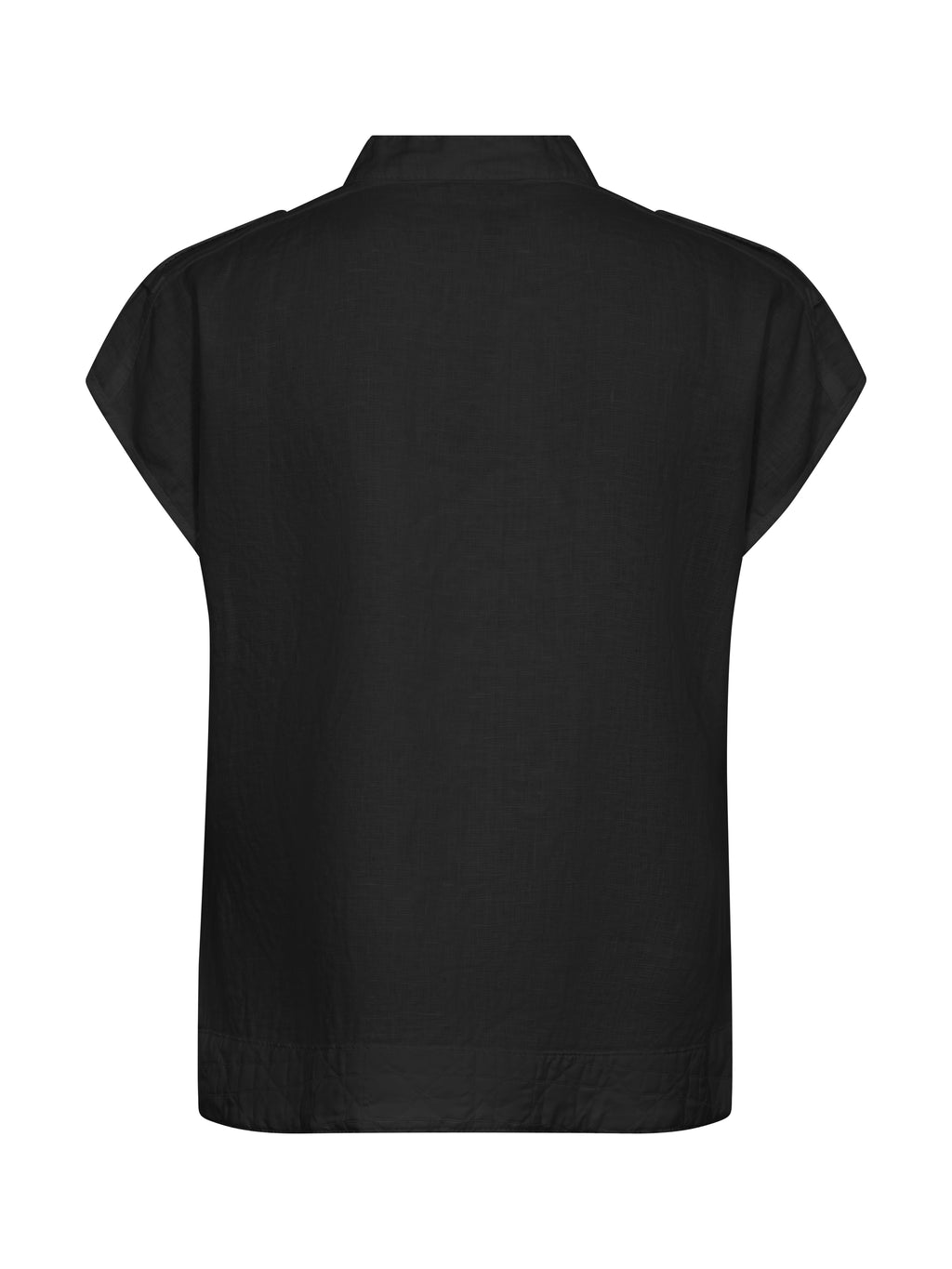 Denne top er lavet i hør, som gør den let og åndbar – ideel til varme dage. Den har en enkel, lige pasform, der falder roligt langs kroppen og giver et afslappet udtryk. Foran har den en kort knaplukning, som tilfører et klassisk og struktureret look. Bagtil er udtrykket rent og enkelt.