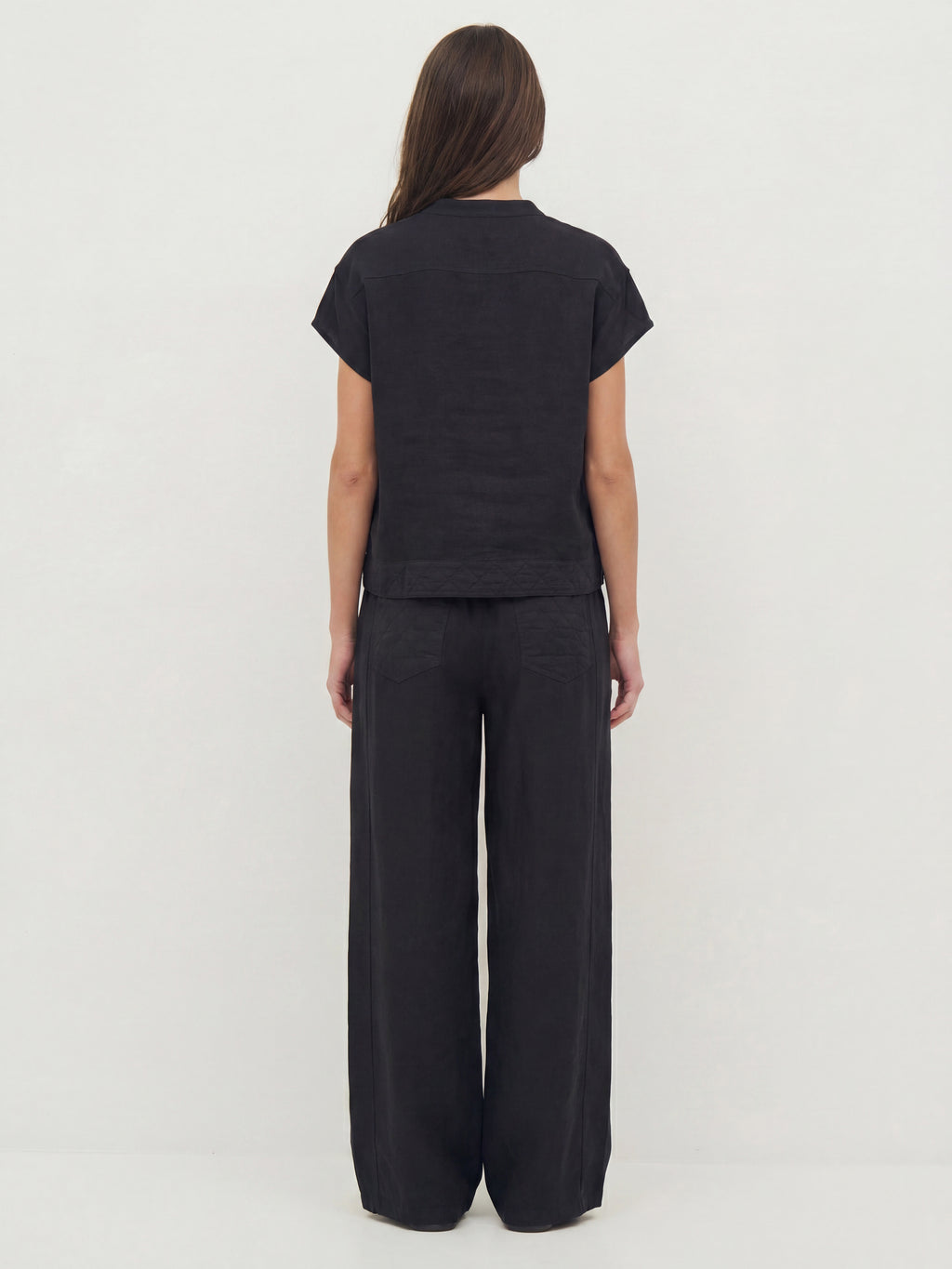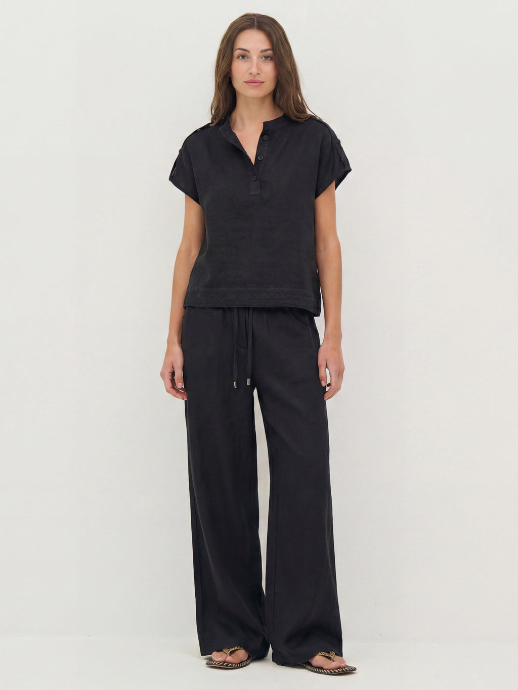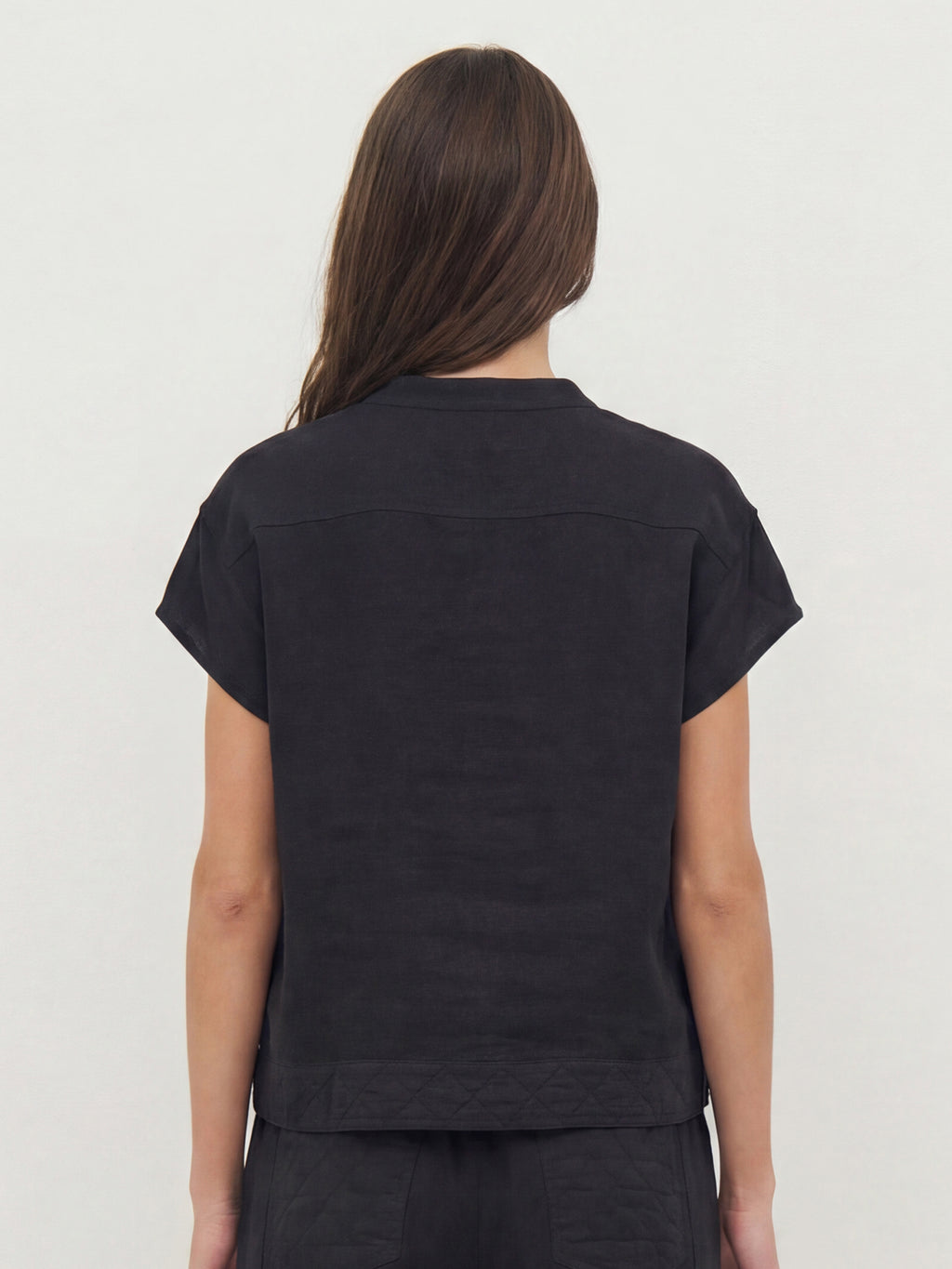 Denne top er lavet i hør, som gør den let og åndbar – ideel til varme dage. Den har en enkel, lige pasform, der falder roligt langs kroppen og giver et afslappet udtryk. Foran har den en kort knaplukning, som tilfører et klassisk og struktureret look. Bagtil er udtrykket rent og enkelt.